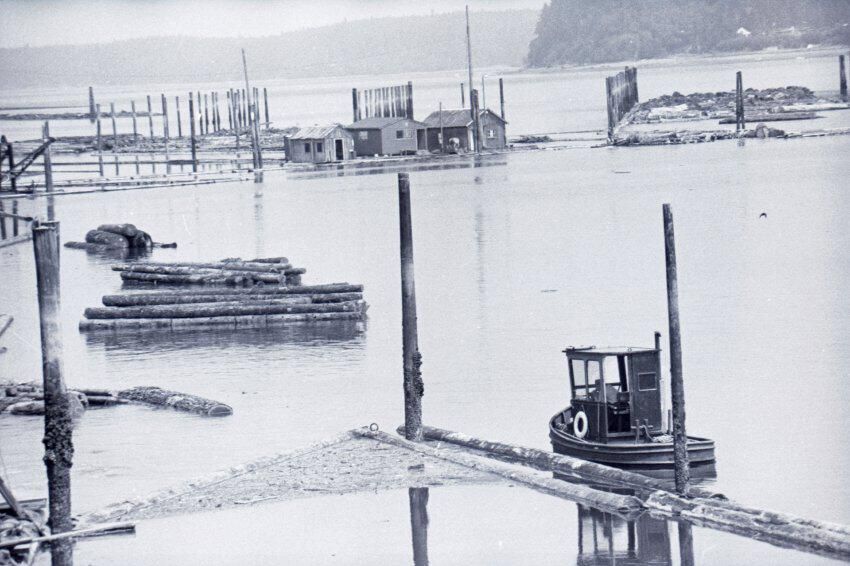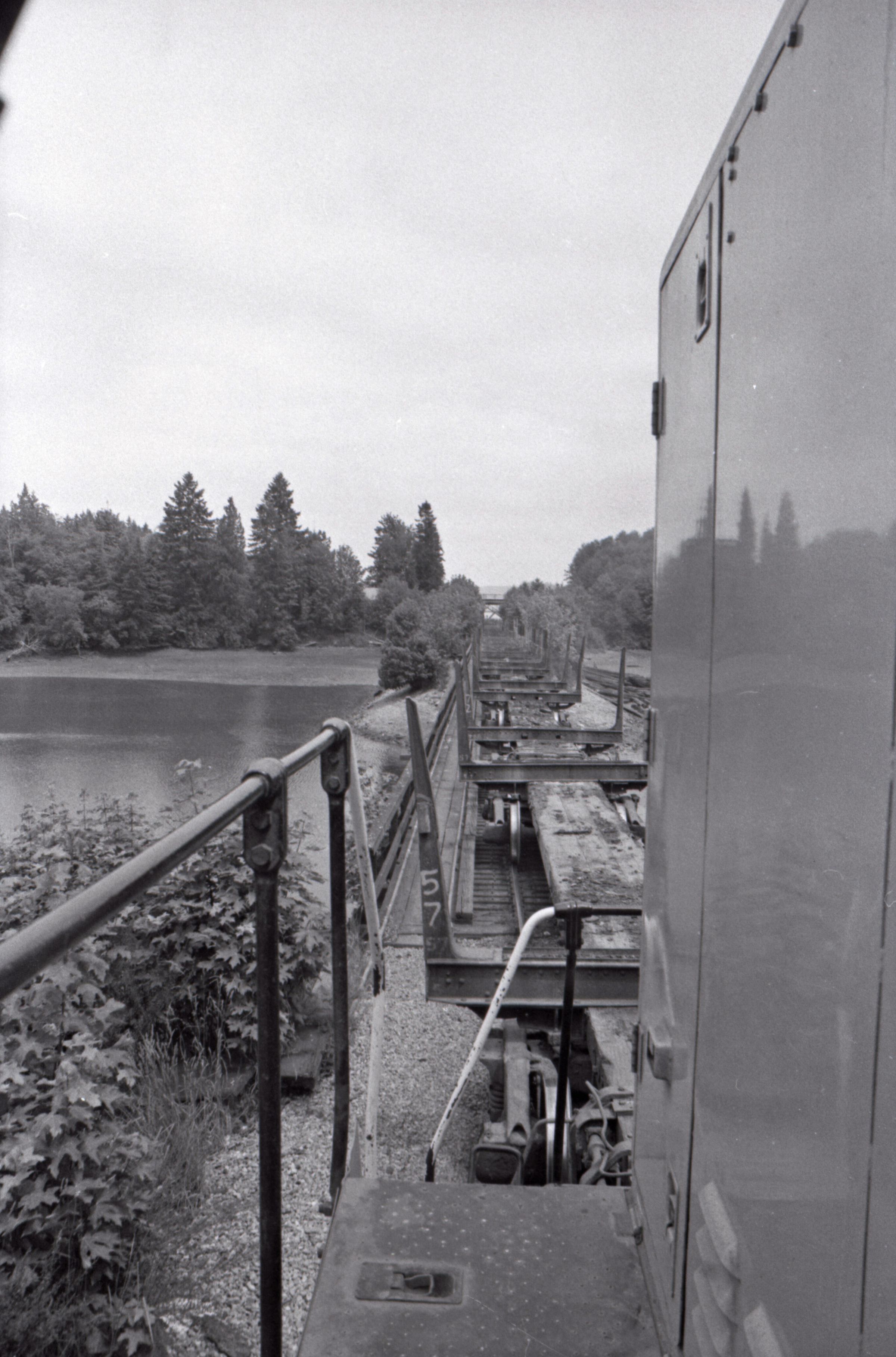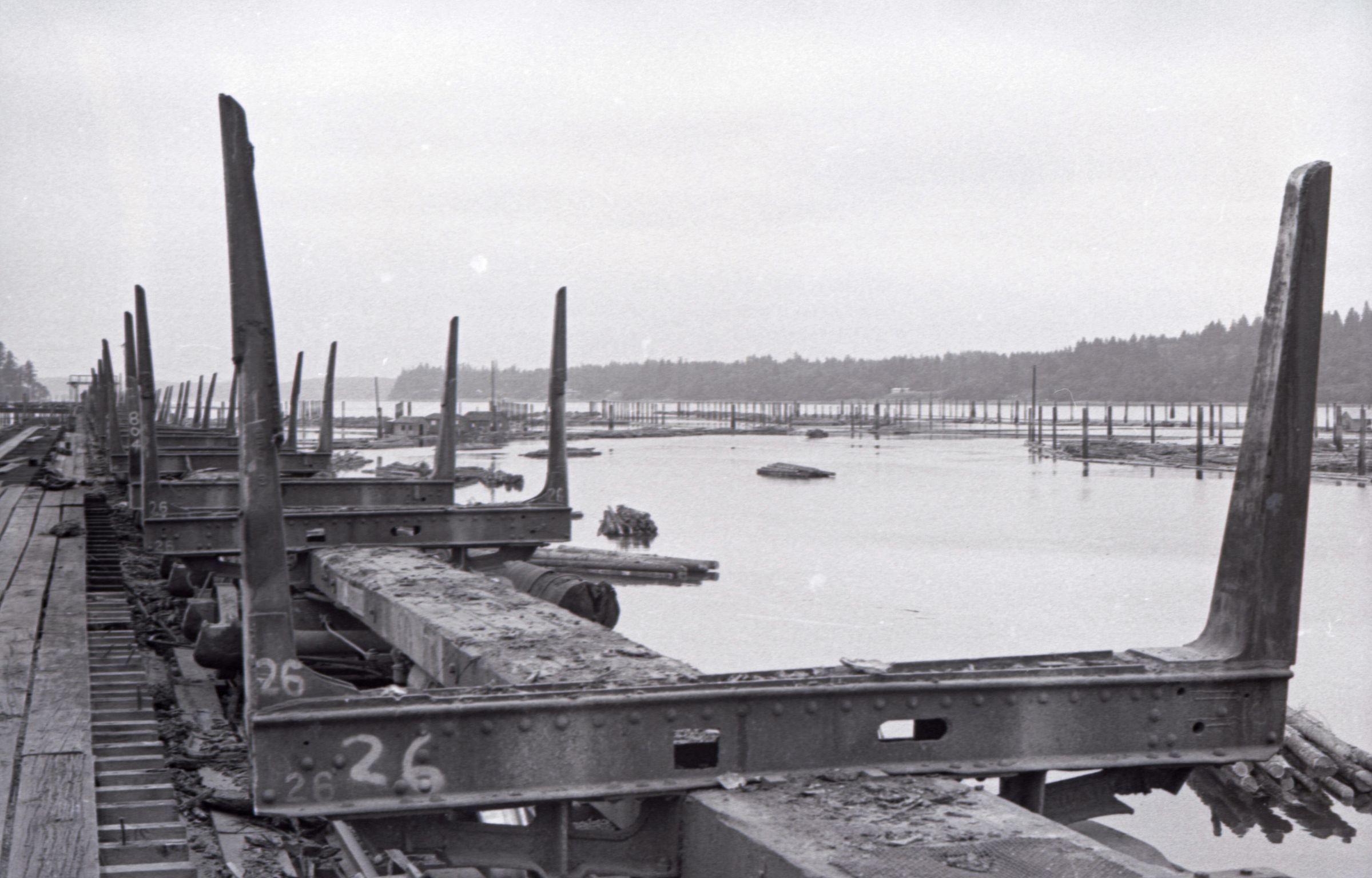 Log Transportation, 1978. These eleven film negative strips were created for the Lacey Leader newspaper. These images show scenes associated with the transportation of logs via rail and water. These images were created using three separate film rolls, so some of the physical numbers on the strips are repeated. For the purposes of this description, the strips will be grouped according to the film roll from which they originally came. Each group will be assigned a lower-case letter to go along with the physical numbers on the strips (ex: 1a, 2a, 3a, 2b, 2b, 3b, etc.) to help differentiate between images.