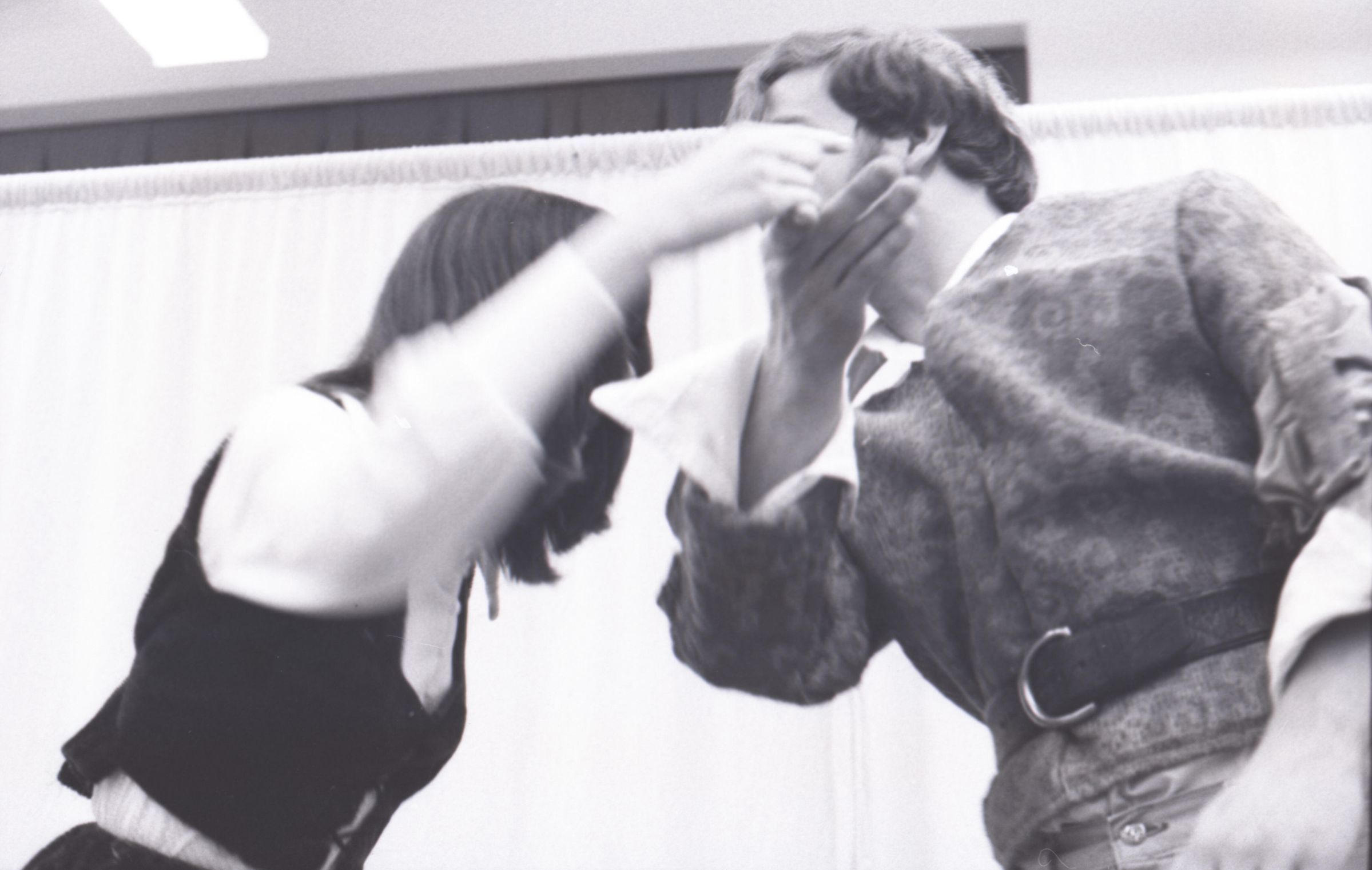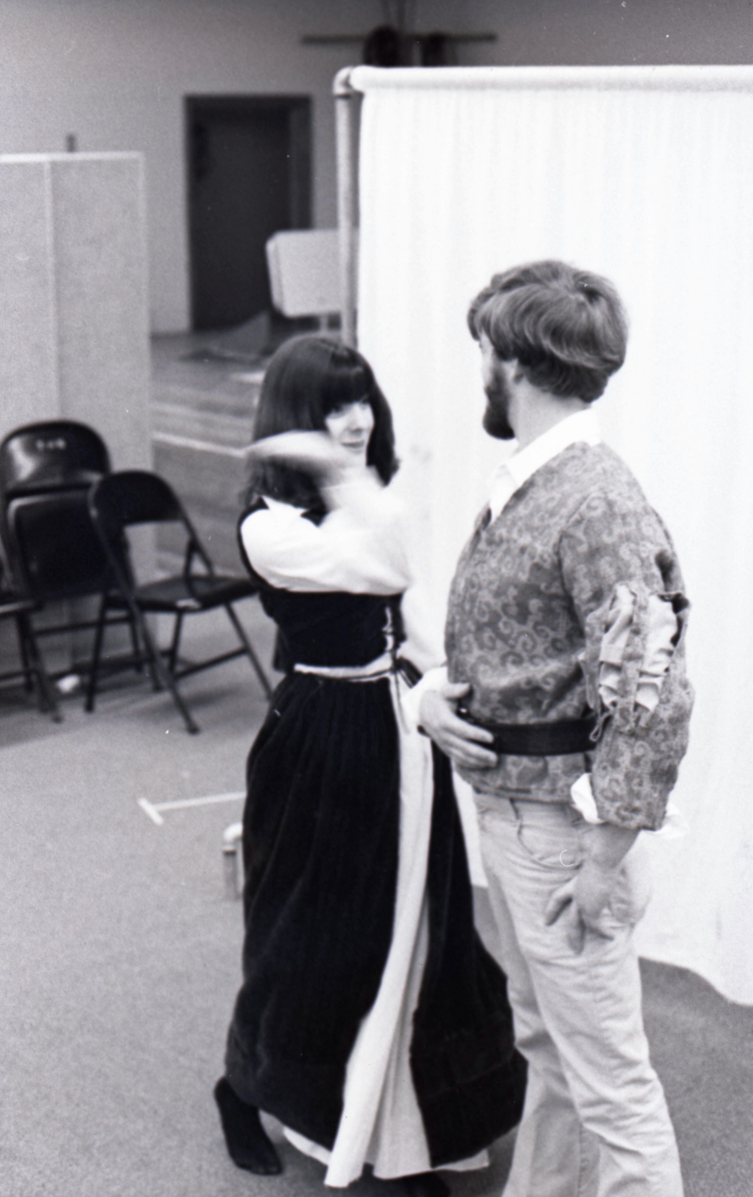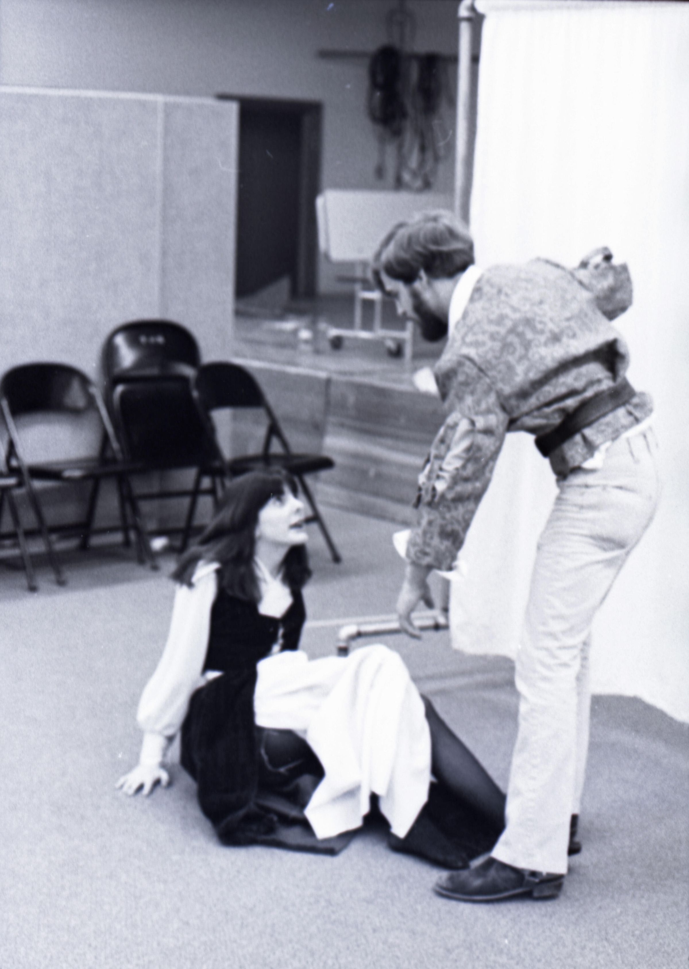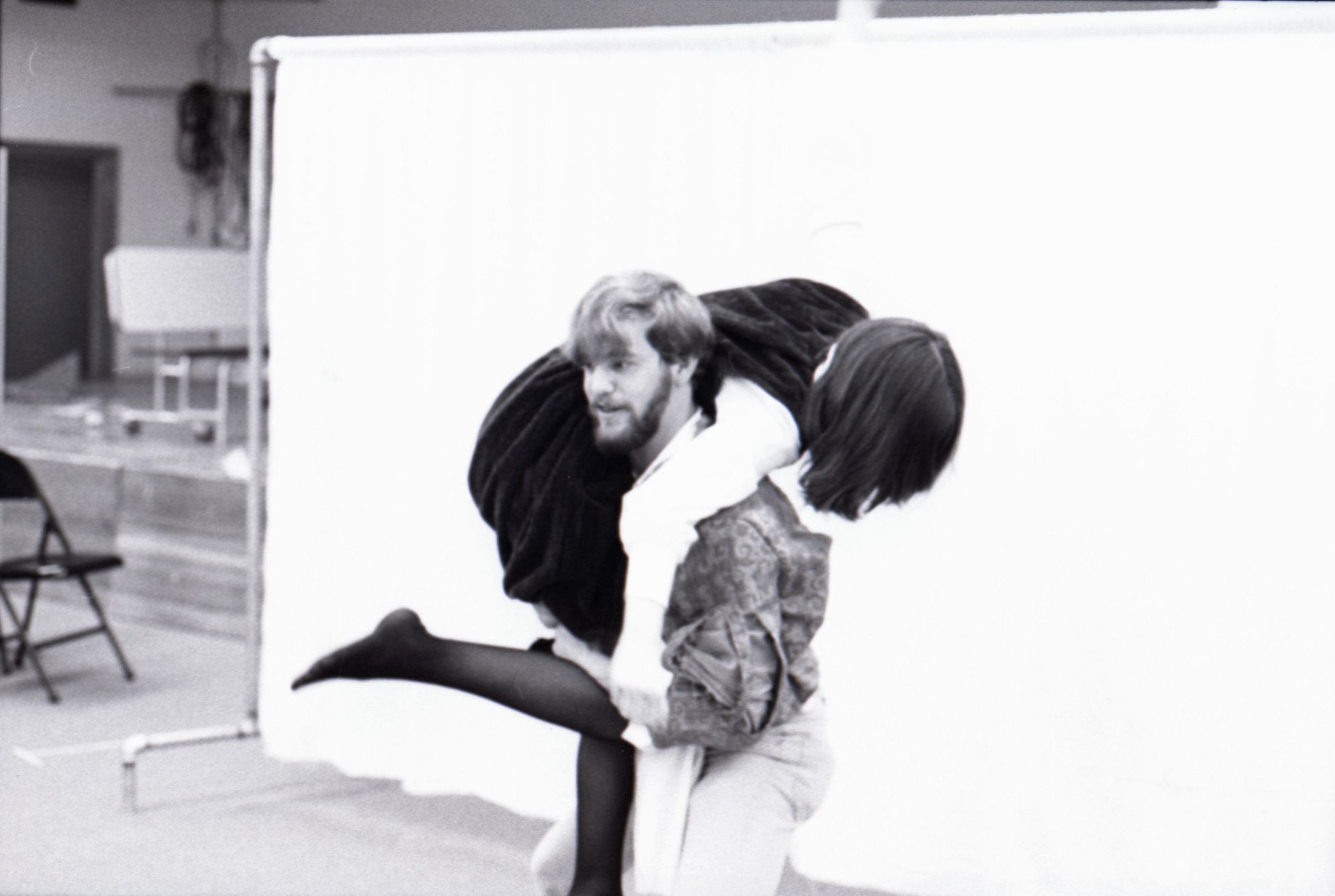 Tumwater High School Play: The Taming of the Shrew, Unknown Date. These three black and white film negative strips were created for the Lacey Leader newspaper. These images show a scene from a Tumwater High School production of the William Shakespeare play "The Taming of the Shrew." A woman in a Renaissance-style costume dress is at the left and a bearded man in a belted tunic is at right. The man appears to be wearing 1970s-era blue jeans and boots. A curtain serves as the backdrop for all of the images. Image 18 shows the man grabbing both of the woman's hands, and the woman appearing to pull back. The woman's hair obscures her face, aside from her nose and mouth. Only the left side of the man's face is visible. Image 19 shows the woman pulled in close to the man. She appears to be struggling against him. Image 20 shows the man having picked the woman up. He is holding her over his right shoulder, and he is facing toward the left-hand side of the image. Image 21 is very similar to image 20, but here the man is turning his head back toward the camera. Image 22 shows the woman and the man bending forward and touching their foreheads together. Both the man and the woman have their hands on their hips. Image 23 is nearly identical to the previous image. Image 24 is very similar to the previous two images, but here the photographer has zoomed in on the man and woman. The top of the stage curtain is visible near the top of the image. Image 25 shows the man and woman standing with their faces still very close together. The man's right hand is reaching across his body to either grab or bat away the woman's right hand, which is raised. Both people's faces are obscured by their arms or hands. Image 26 shows the woman having just slapped the man. The man's head is turned far to his right and directly away from the camera. The woman's body is turned toward her left, but her face is still oriented toward the man. Image 27 shows the woman with her hand raised again. The hand is blurred, showing movement. The man is striking a heroic pose. His right arm is reaching across his middle. Image 28 shows the woman sitting on the floor and looking up toward the man. The man is leaning forward and reaching down toward the woman. Image 29 shows the woman still sitting on the floor and looking up toward the man, but here the woman appears to be laughing. The man is bent over and reaching downward with both arms. Image 30 shows the man sitting on the ground. The woman is crawling on all fours toward the man. The appears to be speaking to the man. Image 31 is very similar to the previous image, but here the woman is closer to the man and her mouth is open only slightly.