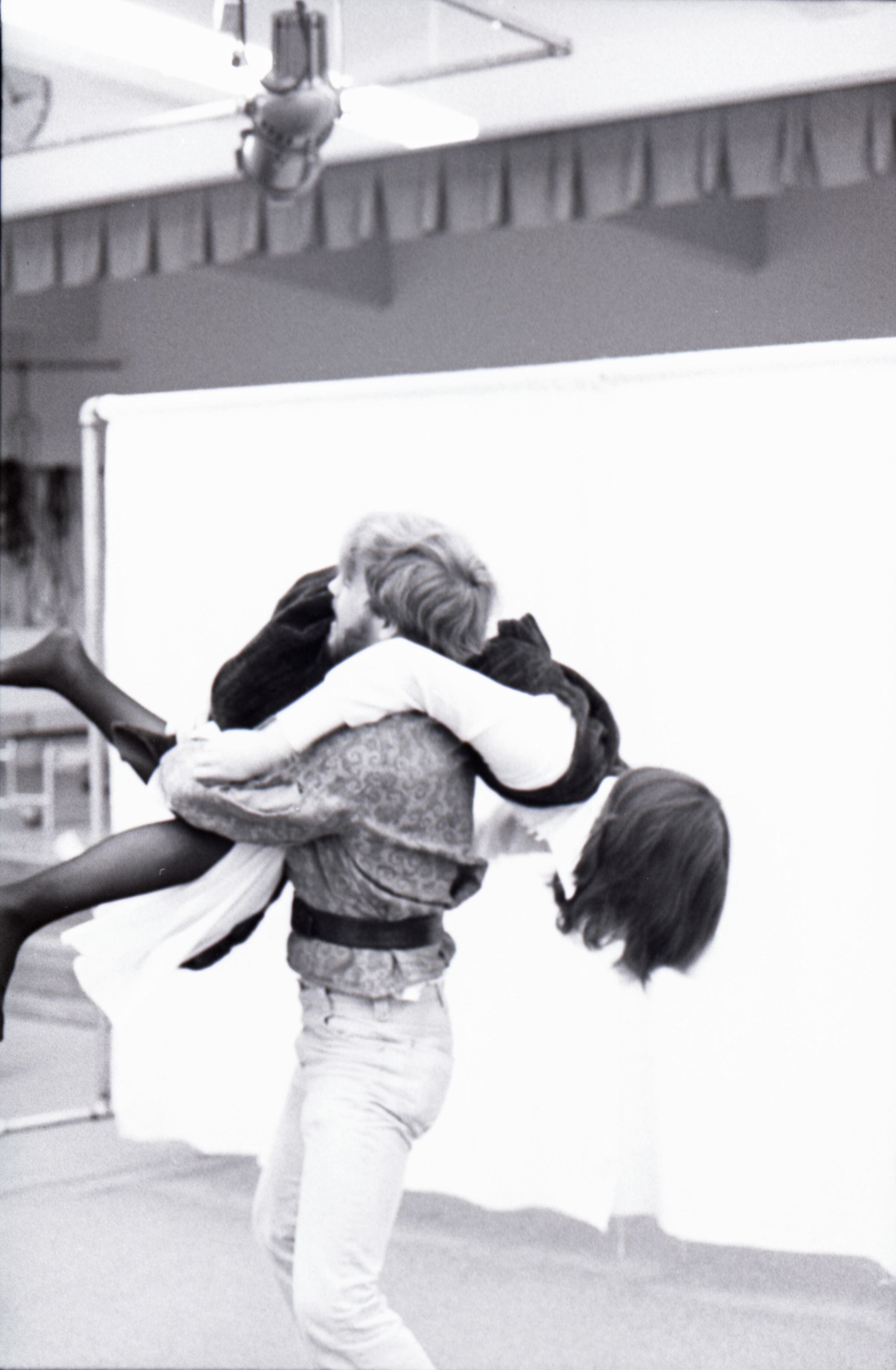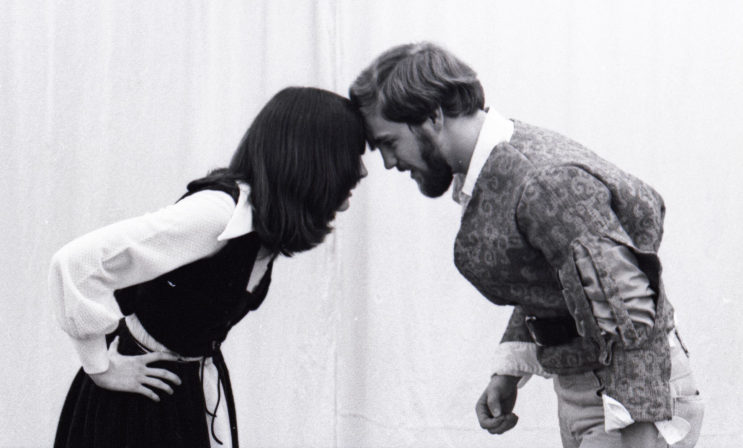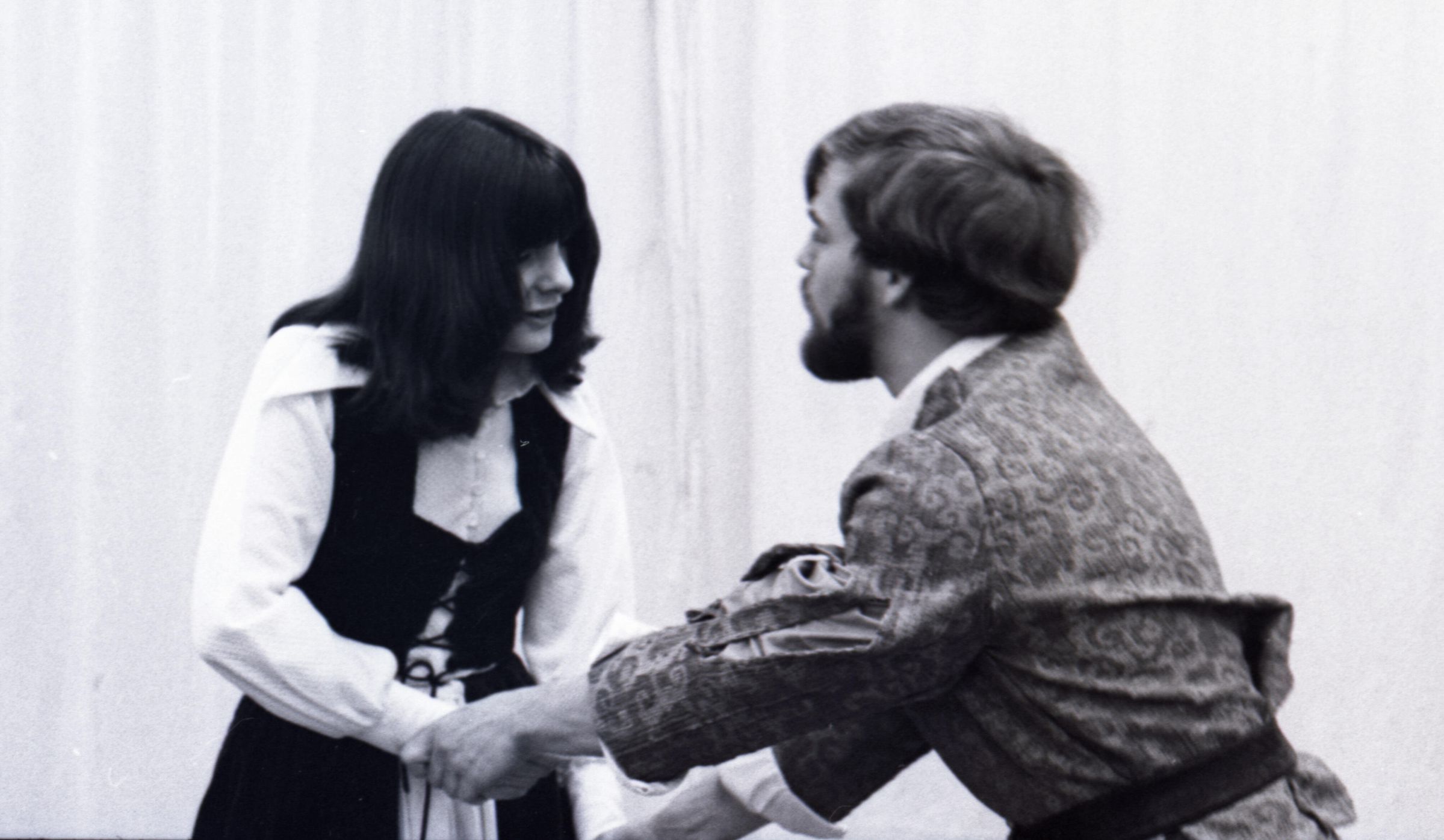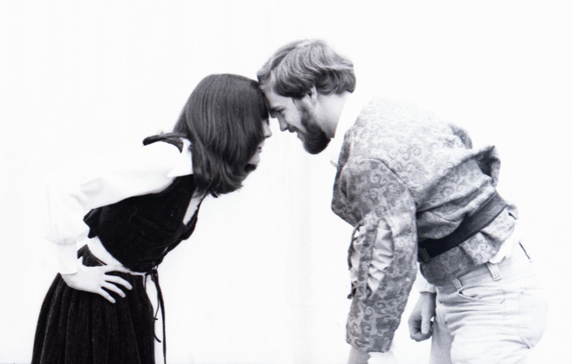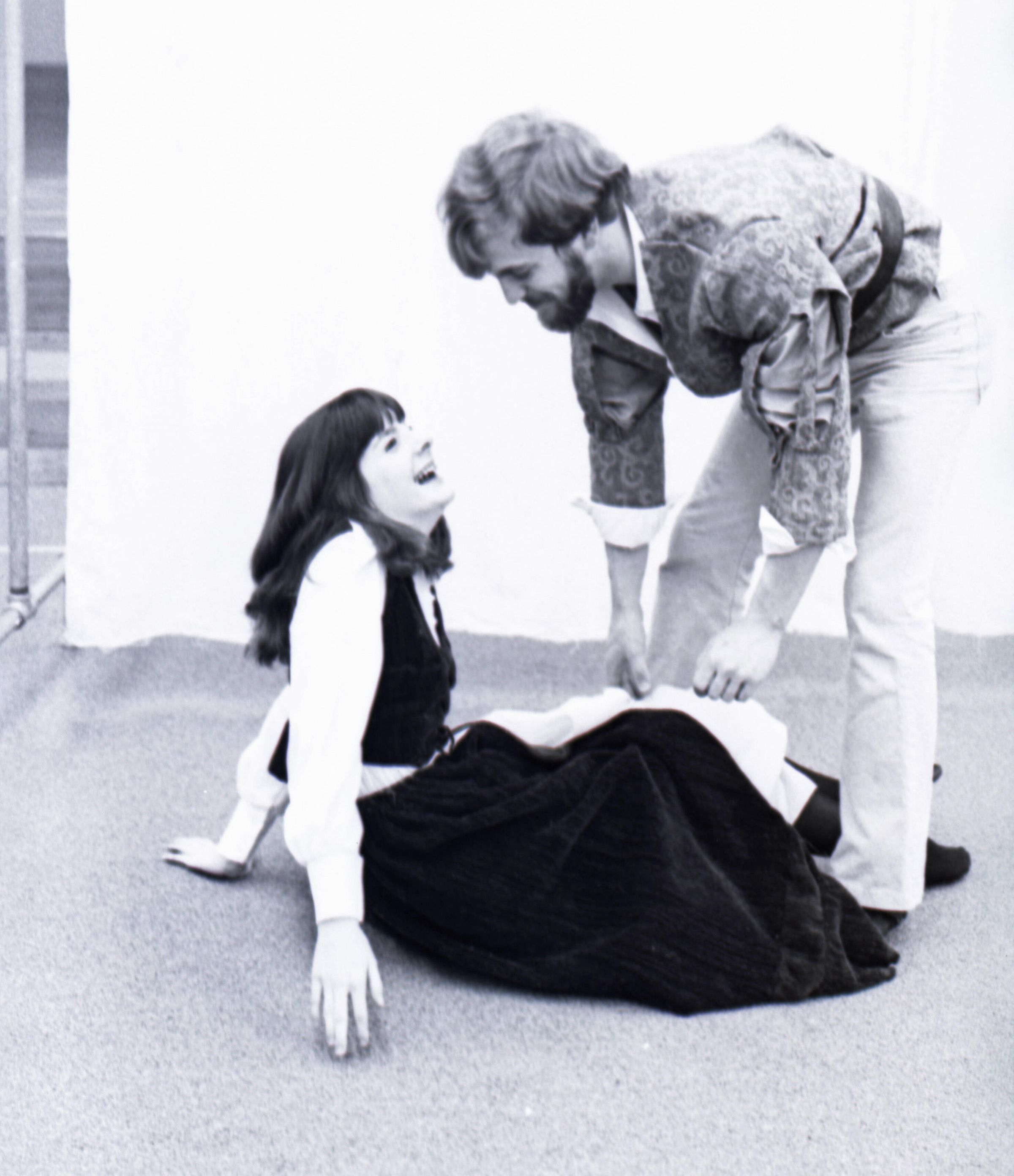 Tumwater High School Play: The Taming of the Shrew, Unknown Date. These three black and white film negative strips were created for the Lacey Leader newspaper. These images show a scene from a Tumwater High School production of the William Shakespeare play "The Taming of the Shrew." A woman in a Renaissance-style costume dress is at the left and a bearded man in a belted tunic is at right. The man appears to be wearing 1970s-era blue jeans and boots. A curtain serves as the backdrop for all of the images. Image 18 shows the man grabbing both of the woman's hands, and the woman appearing to pull back. The woman's hair obscures her face, aside from her nose and mouth. Only the left side of the man's face is visible. Image 19 shows the woman pulled in close to the man. She appears to be struggling against him. Image 20 shows the man having picked the woman up. He is holding her over his right shoulder, and he is facing toward the left-hand side of the image. Image 21 is very similar to image 20, but here the man is turning his head back toward the camera. Image 22 shows the woman and the man bending forward and touching their foreheads together. Both the man and the woman have their hands on their hips. Image 23 is nearly identical to the previous image. Image 24 is very similar to the previous two images, but here the photographer has zoomed in on the man and woman. The top of the stage curtain is visible near the top of the image. Image 25 shows the man and woman standing with their faces still very close together. The man's right hand is reaching across his body to either grab or bat away the woman's right hand, which is raised. Both people's faces are obscured by their arms or hands. Image 26 shows the woman having just slapped the man. The man's head is turned far to his right and directly away from the camera. The woman's body is turned toward her left, but her face is still oriented toward the man. Image 27 shows the woman with her hand raised again. The hand is blurred, showing movement. The man is striking a heroic pose. His right arm is reaching across his middle. Image 28 shows the woman sitting on the floor and looking up toward the man. The man is leaning forward and reaching down toward the woman. Image 29 shows the woman still sitting on the floor and looking up toward the man, but here the woman appears to be laughing. The man is bent over and reaching downward with both arms. Image 30 shows the man sitting on the ground. The woman is crawling on all fours toward the man. The appears to be speaking to the man. Image 31 is very similar to the previous image, but here the woman is closer to the man and her mouth is open only slightly.