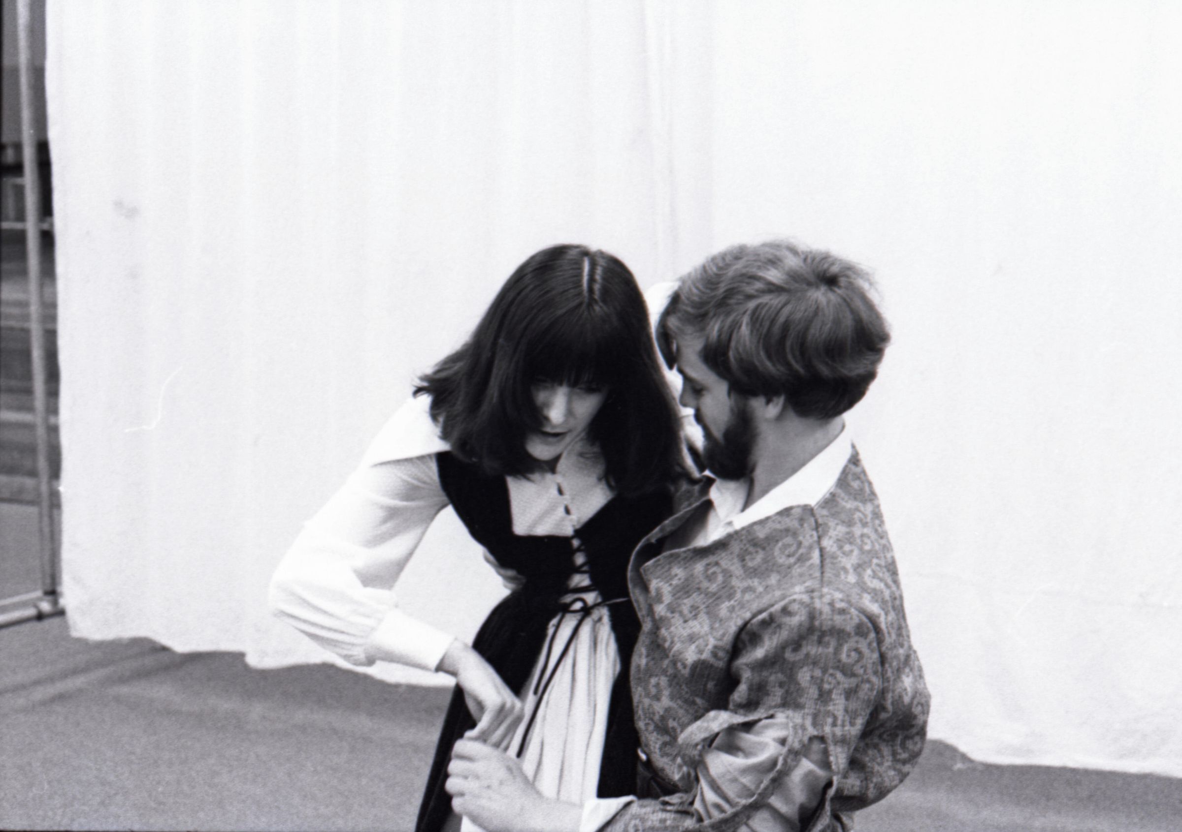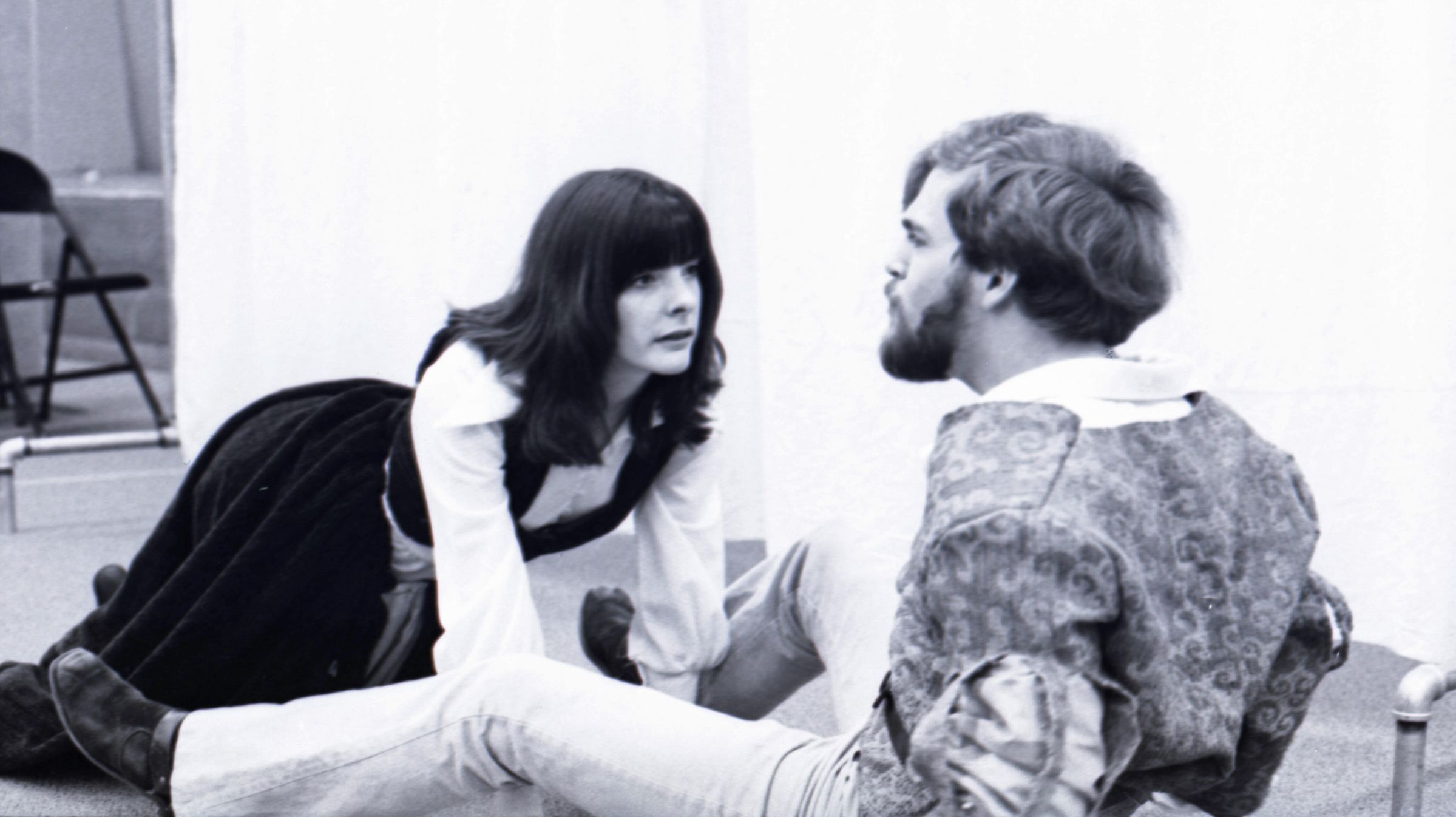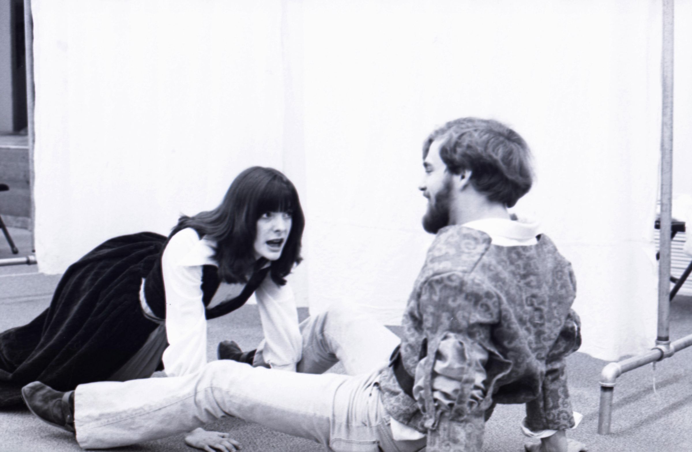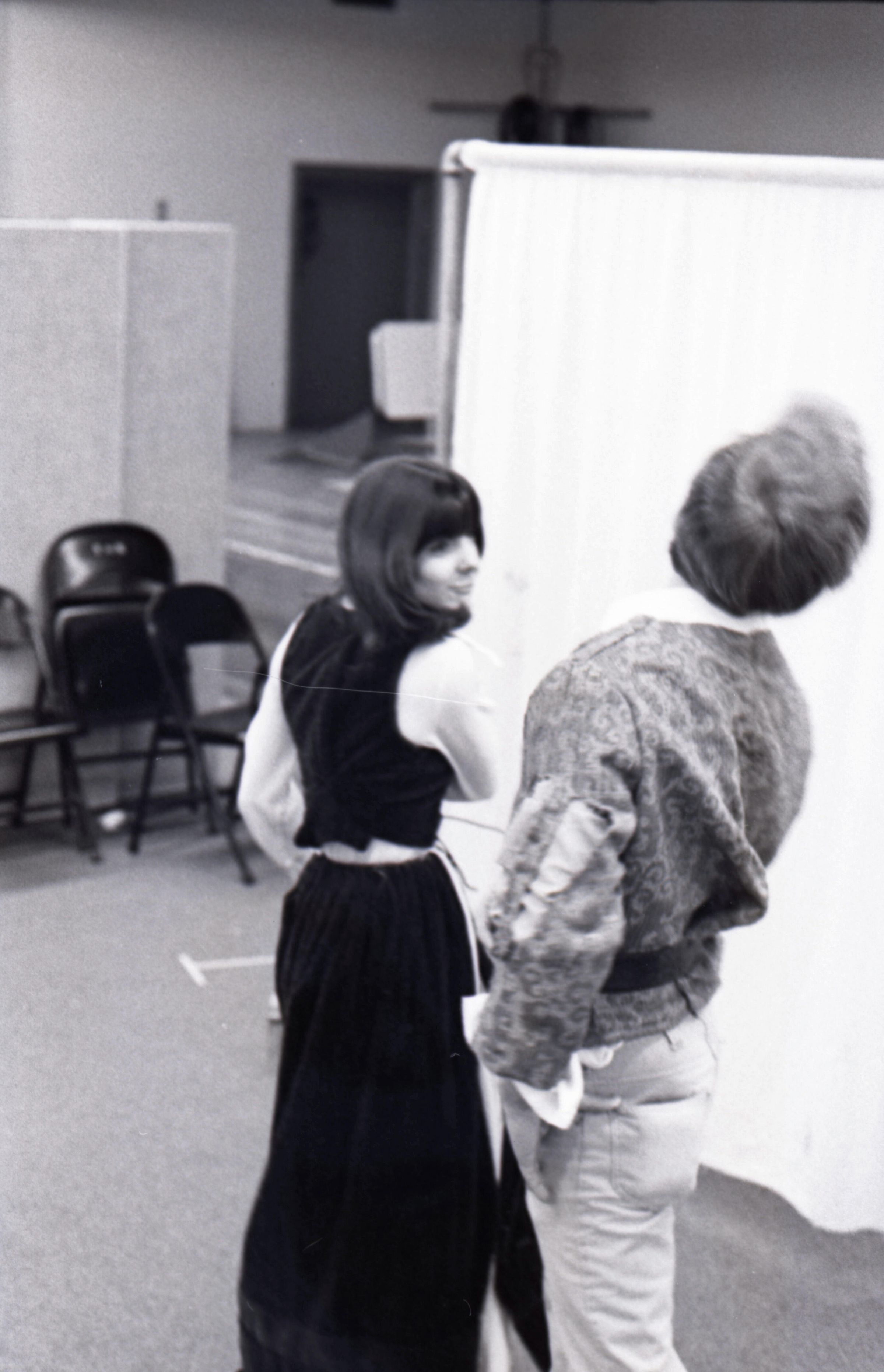 Tumwater High School Play: The Taming of the Shrew, Unknown Date. These three black and white film negative strips were created for the Lacey Leader newspaper. These images show a scene from a Tumwater High School production of the William Shakespeare play "The Taming of the Shrew." A woman in a Renaissance-style costume dress is at the left and a bearded man in a belted tunic is at right. The man appears to be wearing 1970s-era blue jeans and boots. A curtain serves as the backdrop for all of the images. Image 18 shows the man grabbing both of the woman's hands, and the woman appearing to pull back. The woman's hair obscures her face, aside from her nose and mouth. Only the left side of the man's face is visible. Image 19 shows the woman pulled in close to the man. She appears to be struggling against him. Image 20 shows the man having picked the woman up. He is holding her over his right shoulder, and he is facing toward the left-hand side of the image. Image 21 is very similar to image 20, but here the man is turning his head back toward the camera. Image 22 shows the woman and the man bending forward and touching their foreheads together. Both the man and the woman have their hands on their hips. Image 23 is nearly identical to the previous image. Image 24 is very similar to the previous two images, but here the photographer has zoomed in on the man and woman. The top of the stage curtain is visible near the top of the image. Image 25 shows the man and woman standing with their faces still very close together. The man's right hand is reaching across his body to either grab or bat away the woman's right hand, which is raised. Both people's faces are obscured by their arms or hands. Image 26 shows the woman having just slapped the man. The man's head is turned far to his right and directly away from the camera. The woman's body is turned toward her left, but her face is still oriented toward the man. Image 27 shows the woman with her hand raised again. The hand is blurred, showing movement. The man is striking a heroic pose. His right arm is reaching across his middle. Image 28 shows the woman sitting on the floor and looking up toward the man. The man is leaning forward and reaching down toward the woman. Image 29 shows the woman still sitting on the floor and looking up toward the man, but here the woman appears to be laughing. The man is bent over and reaching downward with both arms. Image 30 shows the man sitting on the ground. The woman is crawling on all fours toward the man. The appears to be speaking to the man. Image 31 is very similar to the previous image, but here the woman is closer to the man and her mouth is open only slightly.