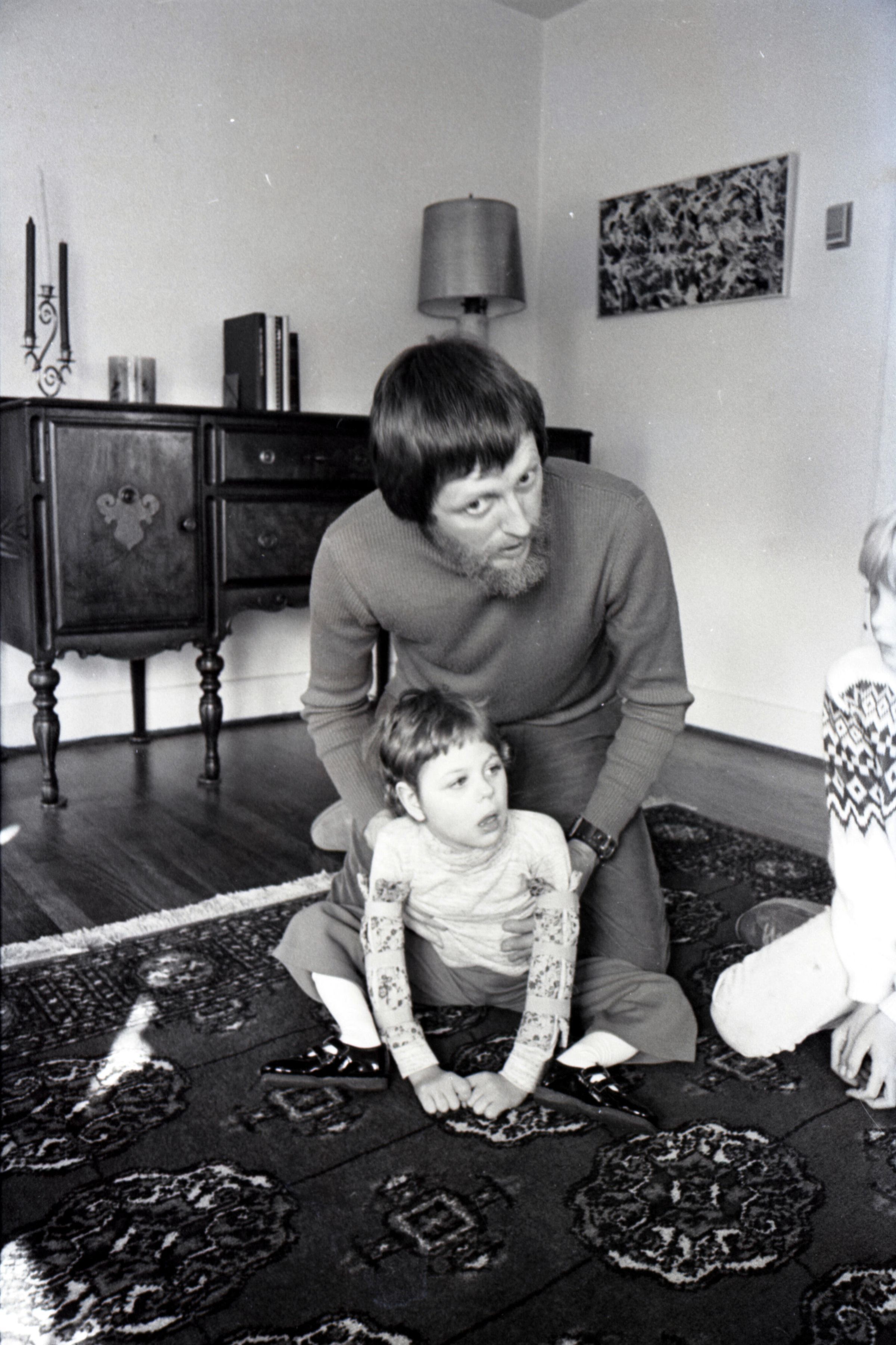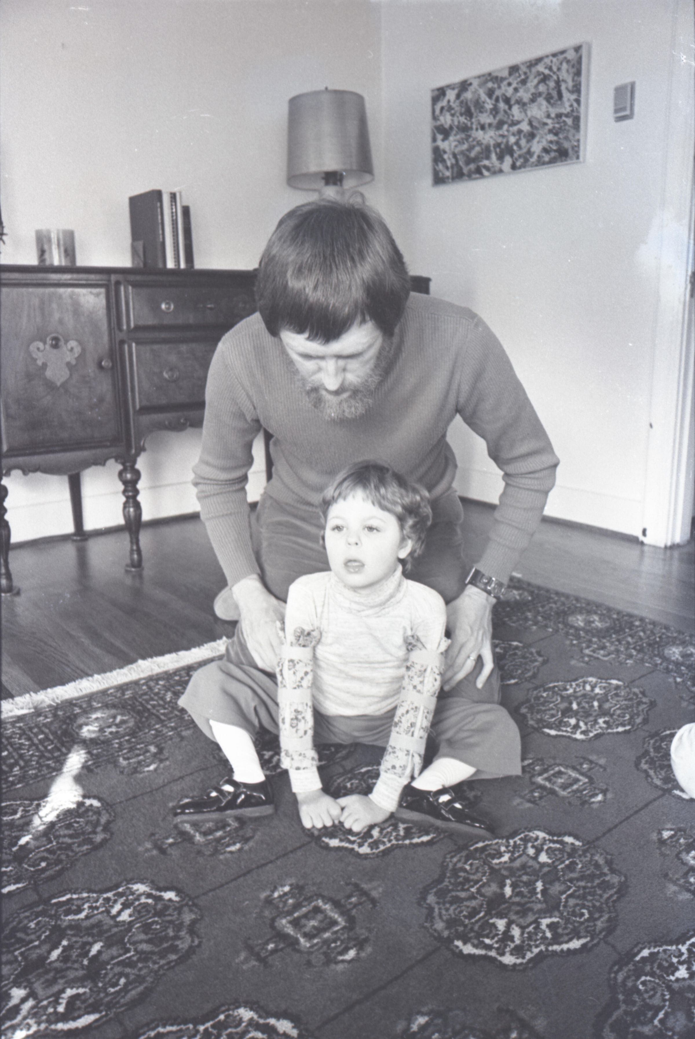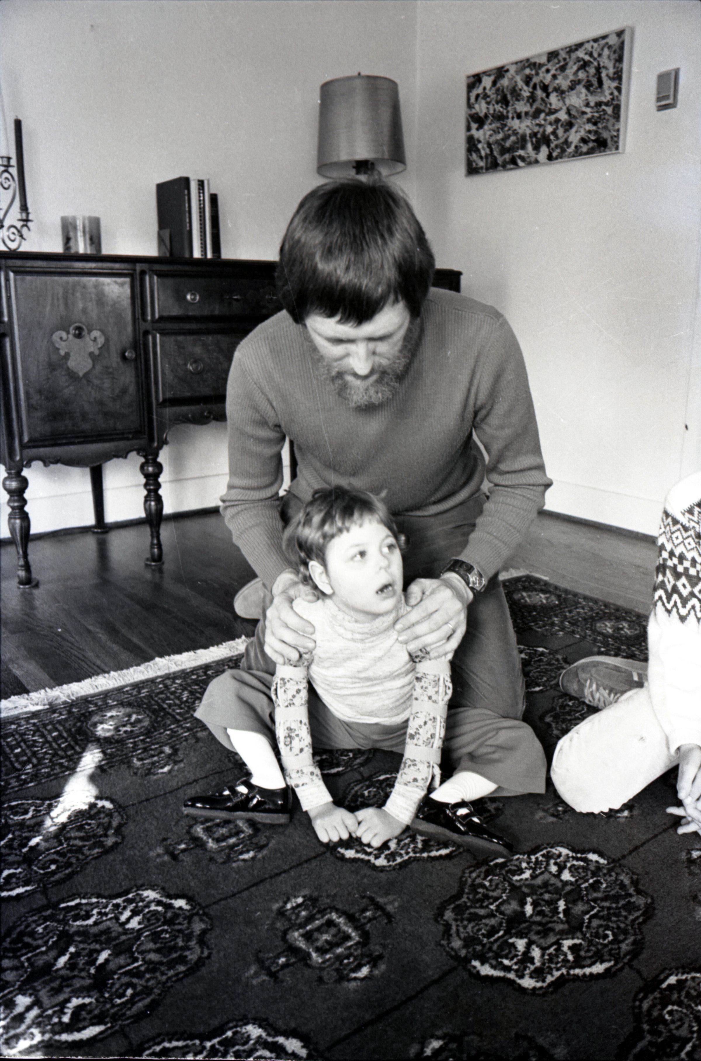 Dr. Larry Jones, SMC, 1978. These two black and white film negative strips were created for the Lacey Leader newspaper. These images show a man with a beard (Dr. Larry Jones) and two children in what appears to be a private home. Image 38 shows the man seated on a couch. The two children are in front of him. The older child is on the right kneeling down in front of the couch. The younger child is seated in a small chair in front of the couch. This younger child appears to have a disability. The man is helping to hold the younger child up with his right hand. The younger child's head is tipped to their left. All three people are looking toward the camera. Image 39 is nearly identical to the previous image. Image 40 is very similar to the previous two images, but here the younger child's head is tipped to their right. Image 41 is very similar to images 38 and 39, but here the younger child's face is turned more toward the older child. Image 42 is nearly identical to image 41. Image 43 shows the younger child sitting on a carpet on the floor. The child's hands are on the floor in front of them. The man is kneeling behind the child and is touching the child's sides lightly with both hands. The man is looking down at the child, and the child is looking to the left of the camera. Image 44 is very similar to the previous image, but here the younger child and the man are looking toward the right-hand side of the image. The older child is partially visible at the right-hand edge of the image. Image 1 is very similar to the previous two images, but here the man is resting his hands on the child's shoulders and looking downward.