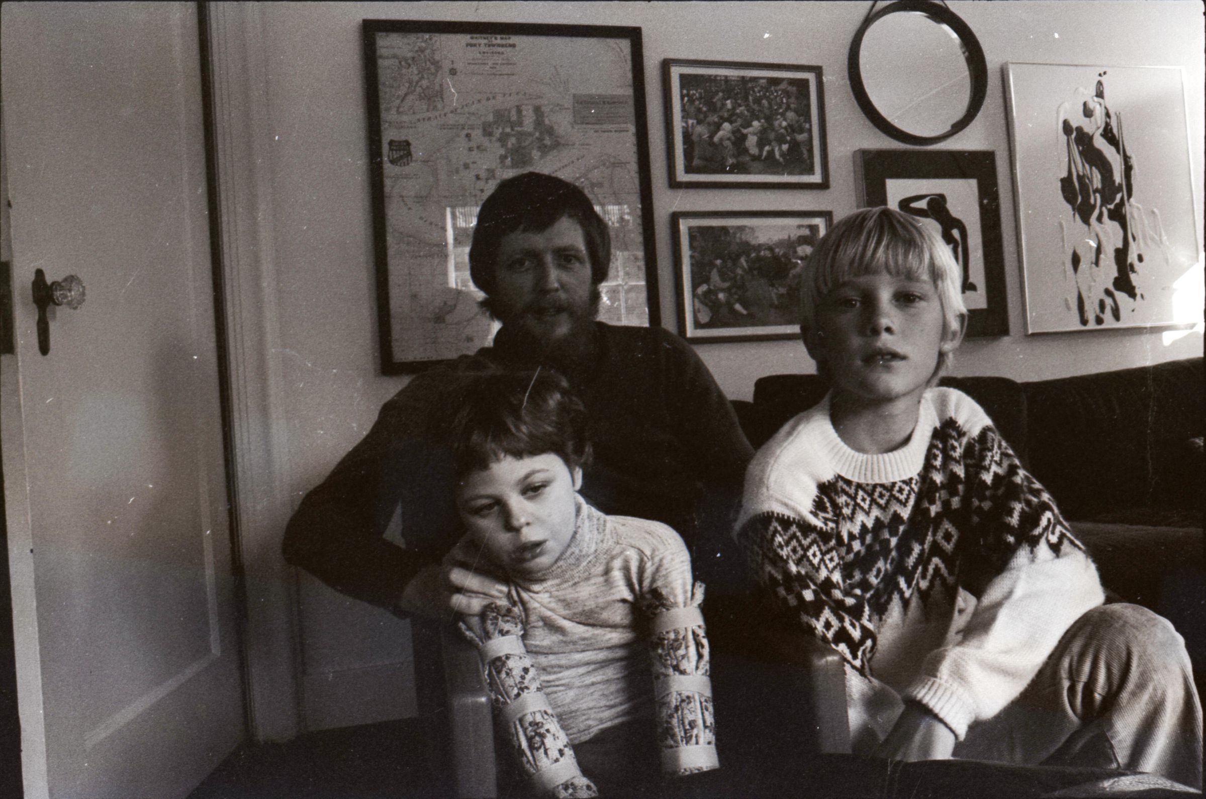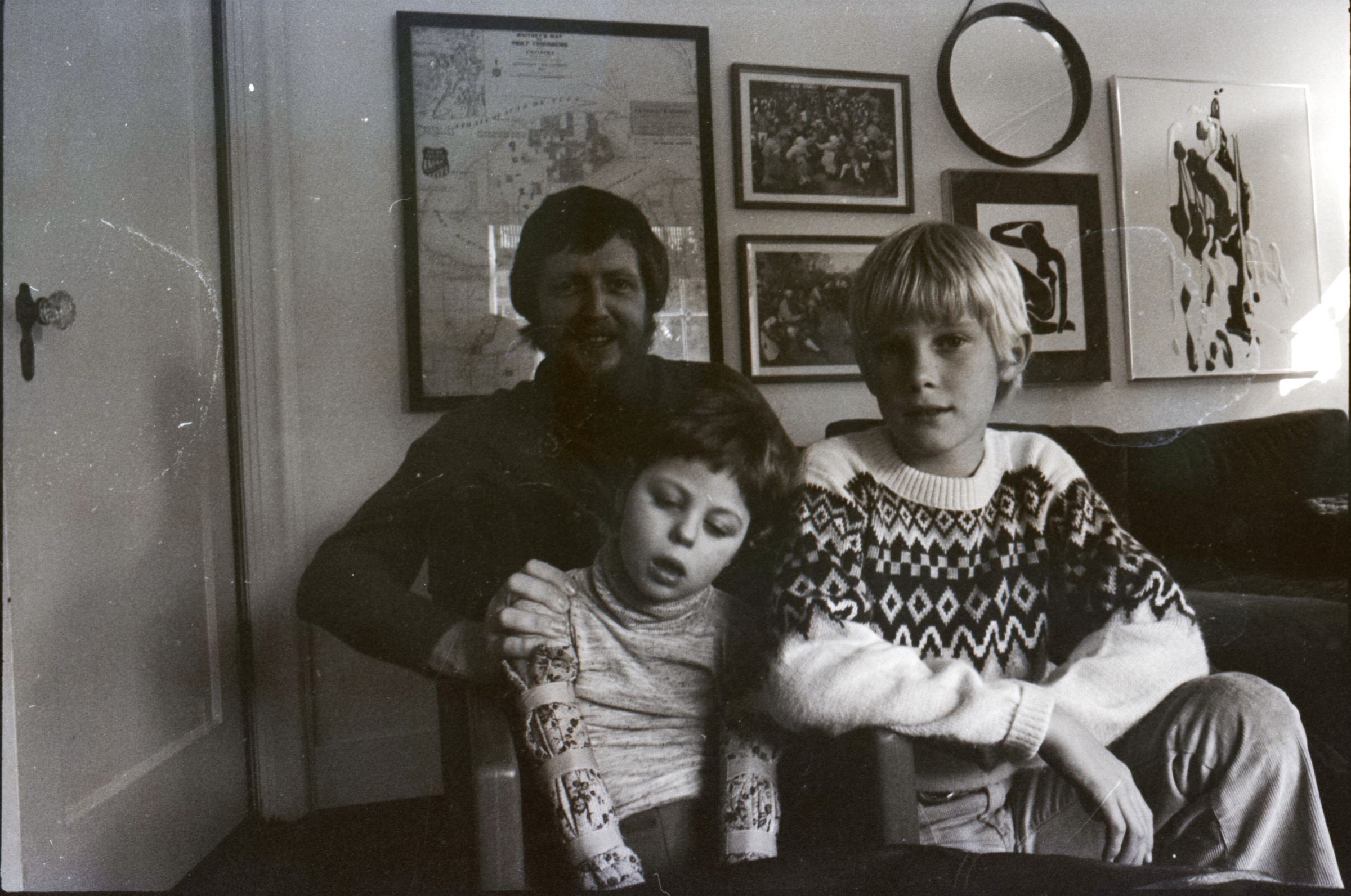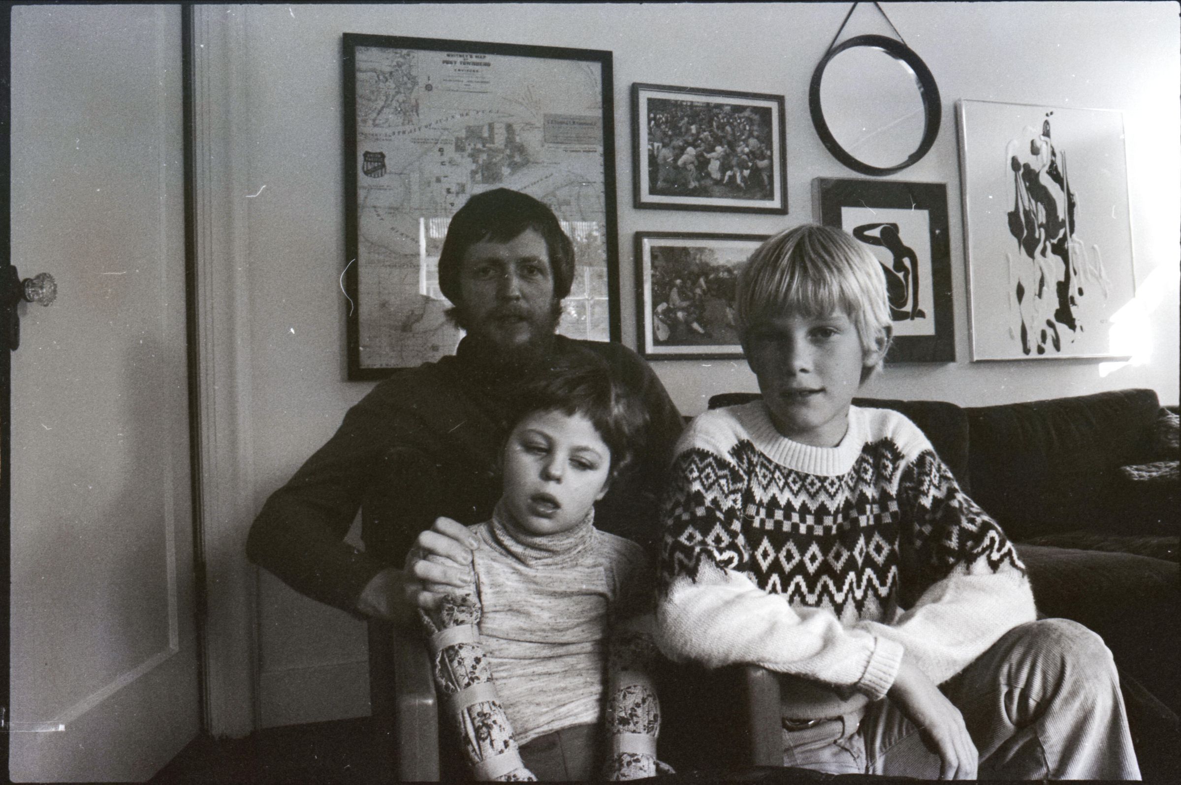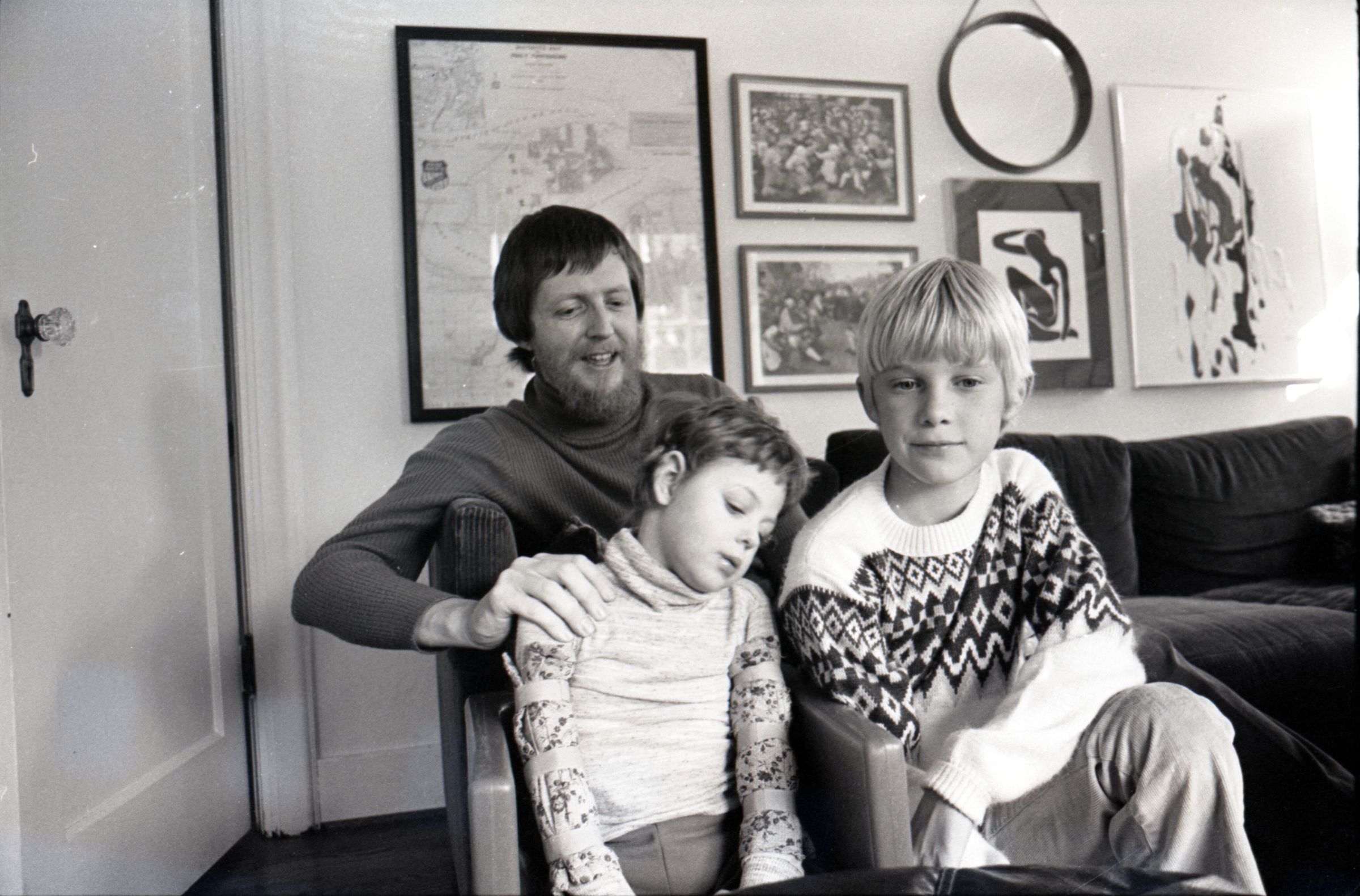Dr. Larry Jones, SMC, 1978. These two black and white film negative strips were created for the Lacey Leader newspaper. These images show a man with a beard (Dr. Larry Jones) and two children in what appears to be a private home. Image 38 shows the man seated on a couch. The two children are in front of him. The older child is on the right kneeling down in front of the couch. The younger child is seated in a small chair in front of the couch. This younger child appears to have a disability. The man is helping to hold the younger child up with his right hand. The younger child's head is tipped to their left. All three people are looking toward the camera. Image 39 is nearly identical to the previous image. Image 40 is very similar to the previous two images, but here the younger child's head is tipped to their right. Image 41 is very similar to images 38 and 39, but here the younger child's face is turned more toward the older child. Image 42 is nearly identical to image 41. Image 43 shows the younger child sitting on a carpet on the floor. The child's hands are on the floor in front of them. The man is kneeling behind the child and is touching the child's sides lightly with both hands. The man is looking down at the child, and the child is looking to the left of the camera. Image 44 is very similar to the previous image, but here the younger child and the man are looking toward the right-hand side of the image. The older child is partially visible at the right-hand edge of the image. Image 1 is very similar to the previous two images, but here the man is resting his hands on the child's shoulders and looking downward.
