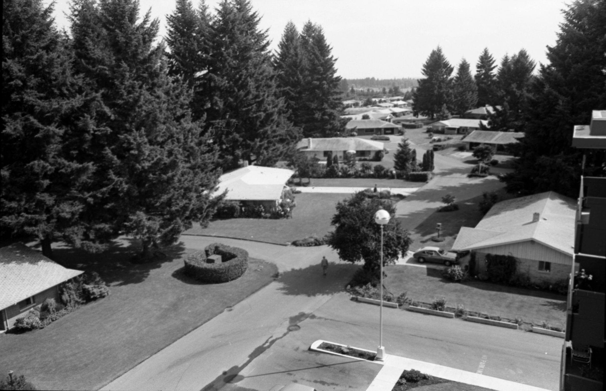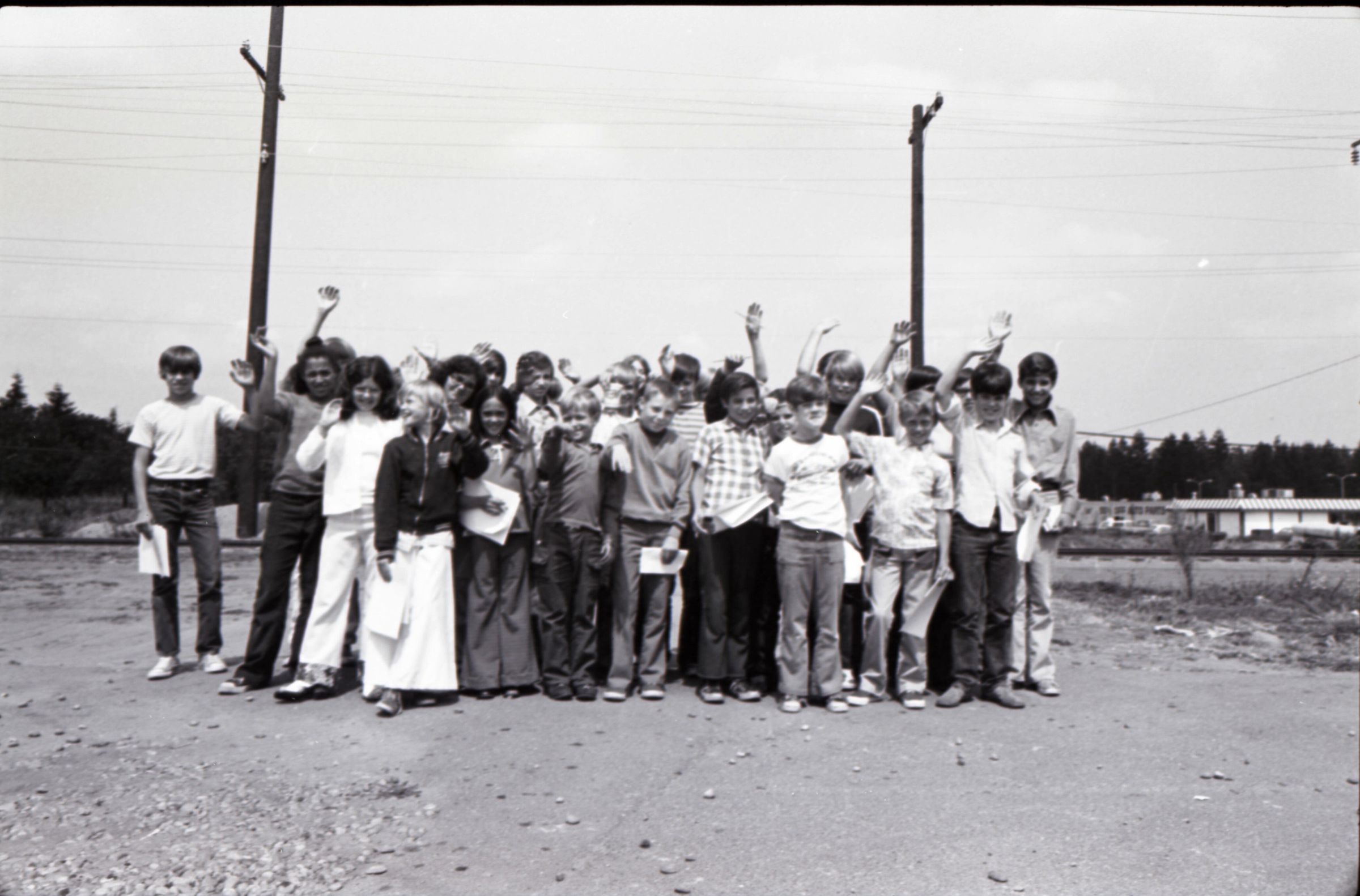 Maurice Twitchell and Carrier Children, 1973. These two black and white film negative strips were created for the Lacey Leader newspaper. These images show an aerial view of a portion of Panorama City, a man (Maurice Twitchell) posing for portrait-style photos, and approximately 30 children posing together for a group photo. Image 20 shows an aerial photo of a residential neighborhood in Panorama City with many large evergreen trees throughout the neighborhood. Image 21 shows Maurice Twitchell wearing a collared shirt with a flower pattern on it. His body is oriented partially toward the left-hand side of the image frame. He is shown from the waist up. Image 22 is very similar to the previous image, but here the Mr. Twitchell's body is oriented partially toward the right-hand edge of the image frame. Image 23 shows a group of approximately 30-40 children posing together for a group photo. These children were newspaper delivery employees of the Lacey Leader newspaper. This image appears to have been captured in a parking lot or other large, paved area. Two power poles are visible in the background. Some of the children are holding documents of some kind, which are likely newpspae subscription documents. Images 24 through 29 are nearly identical to image 23.