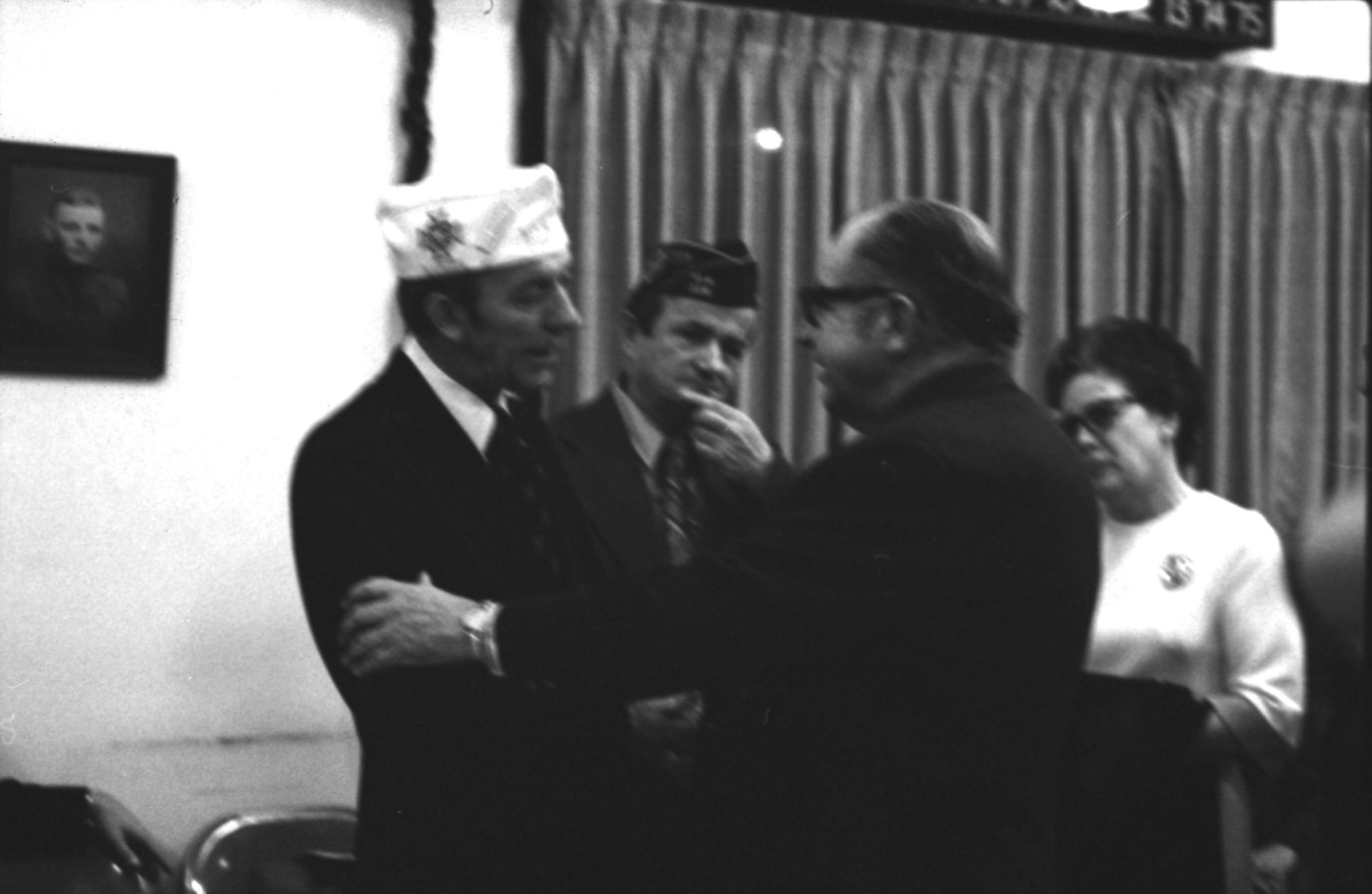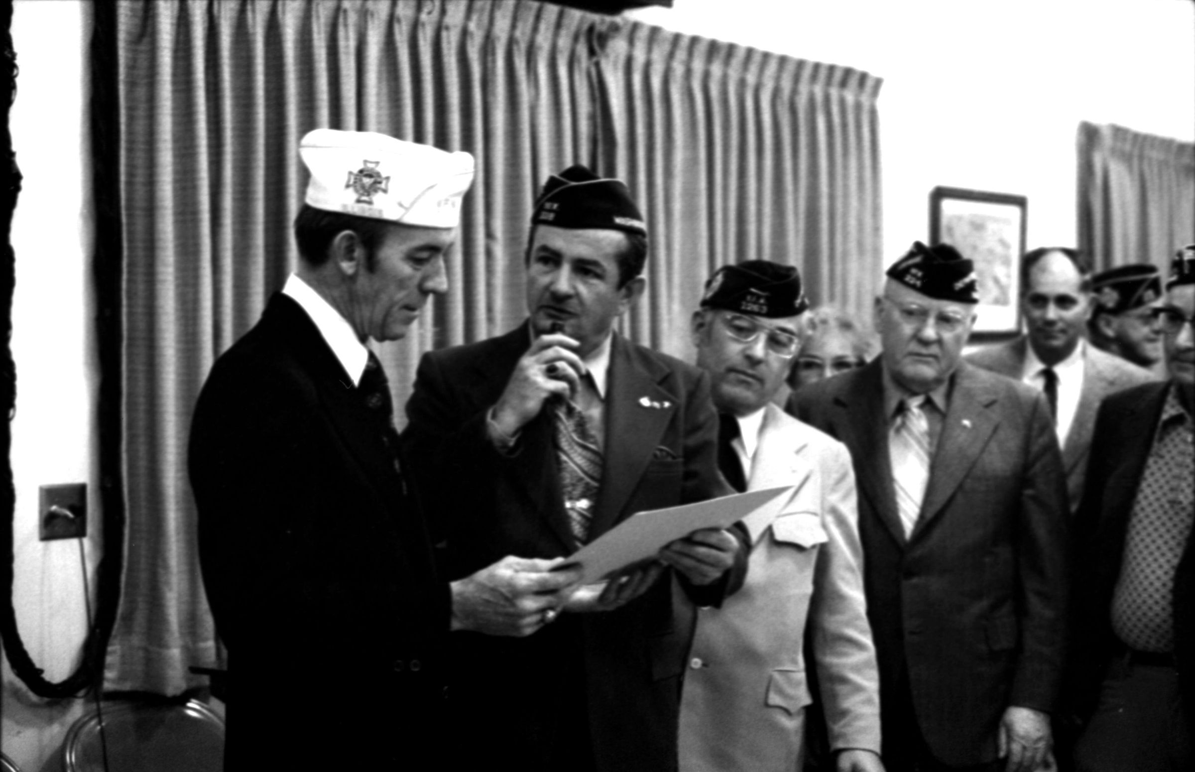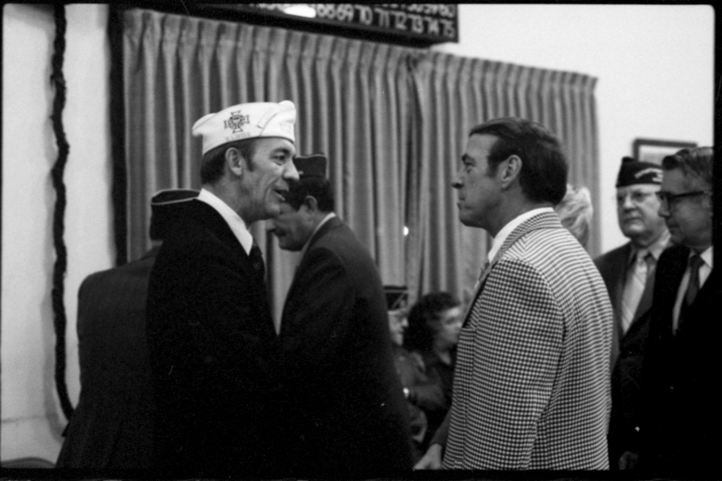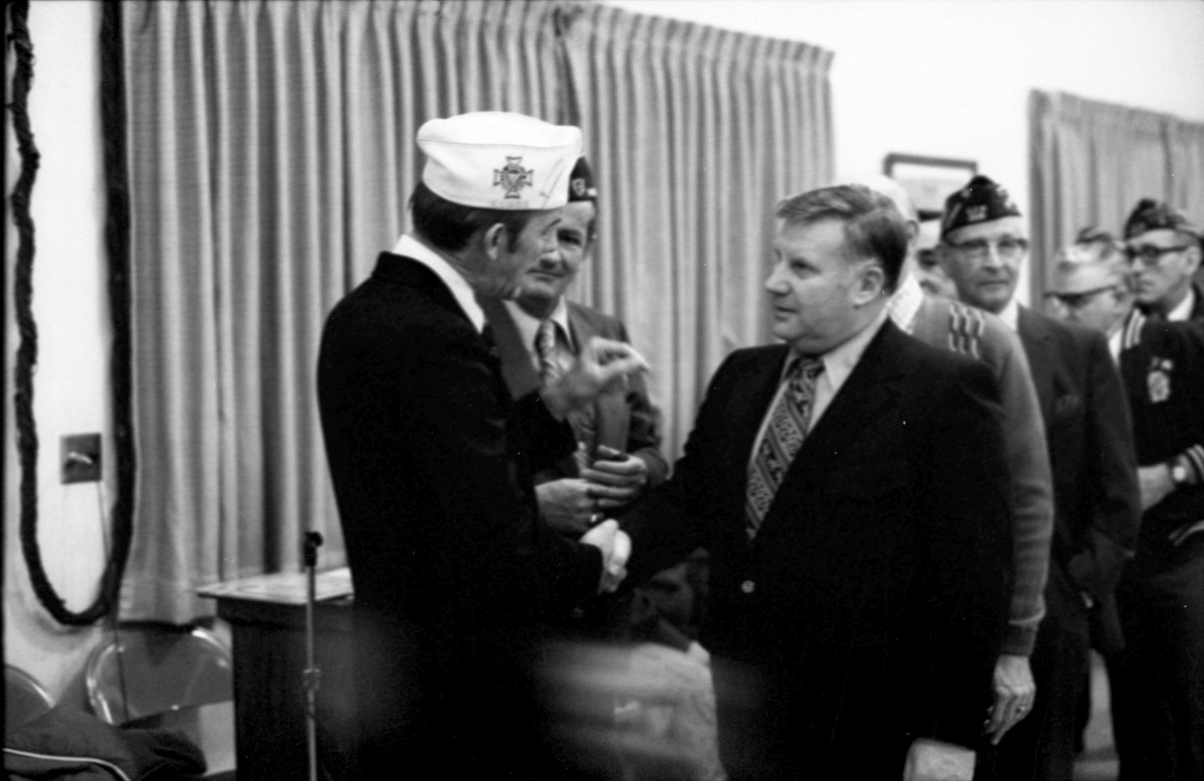 VFW National Commander, 1973. These two black and white film negative strips were created for the Lacey Leader newspaper. These images show various men individually speaking to a man wearing a garrison cap with a Veterans of Foreign Wars patch on the right-hand side (Raymond R. Soden). The man in the garrison cap is on the left-hand side of all of these images.Made/Created