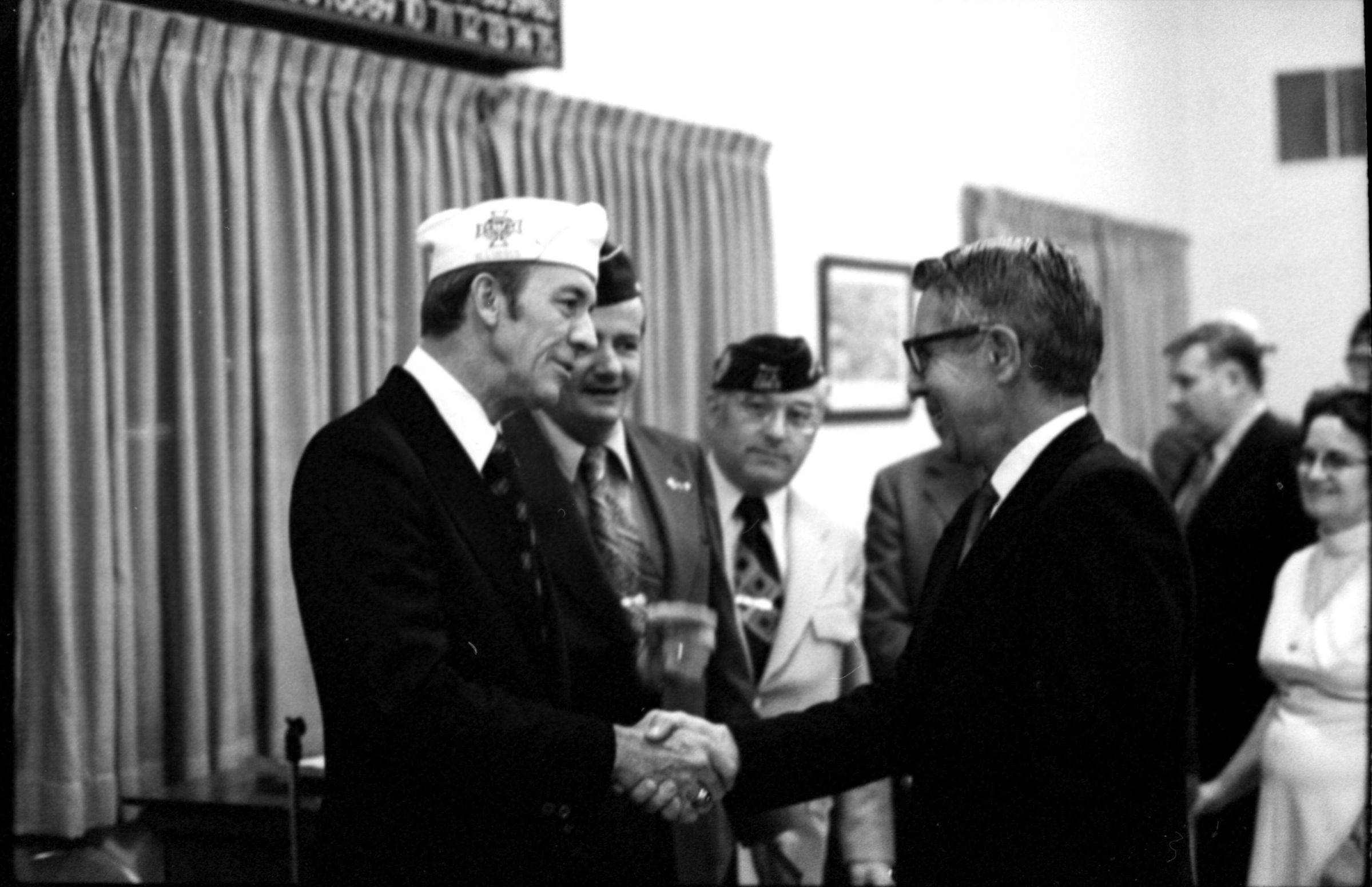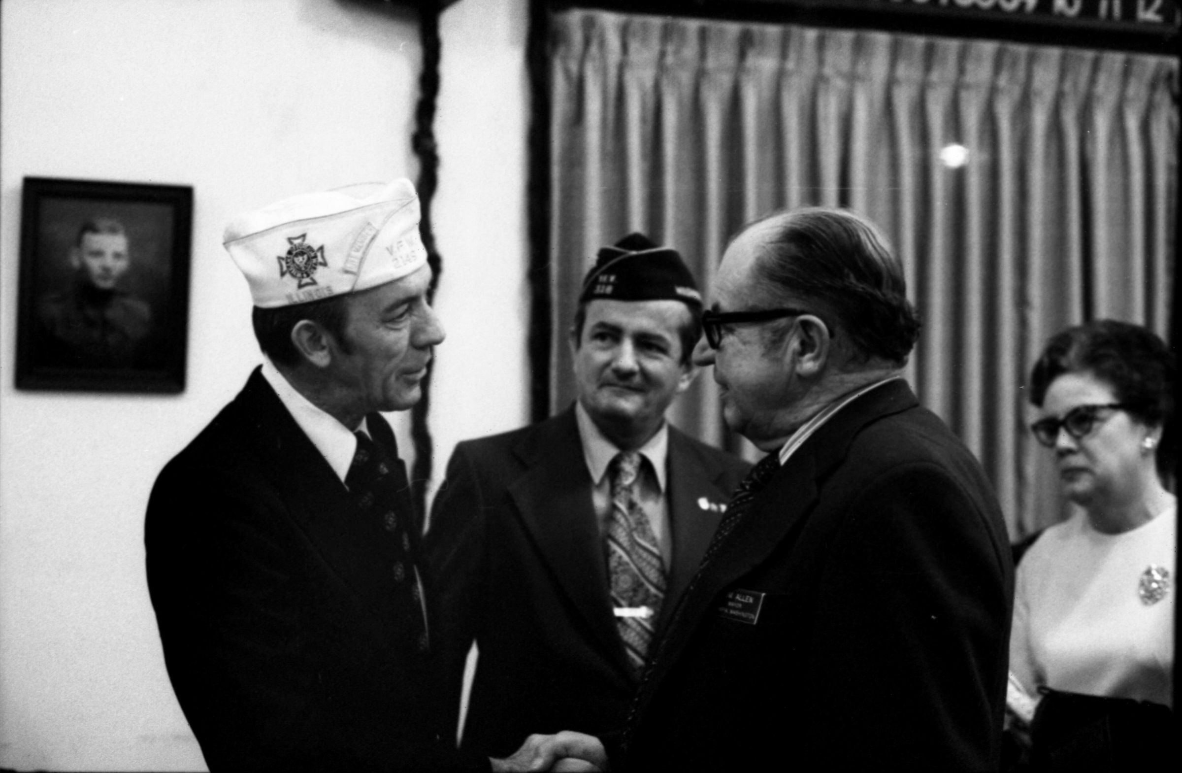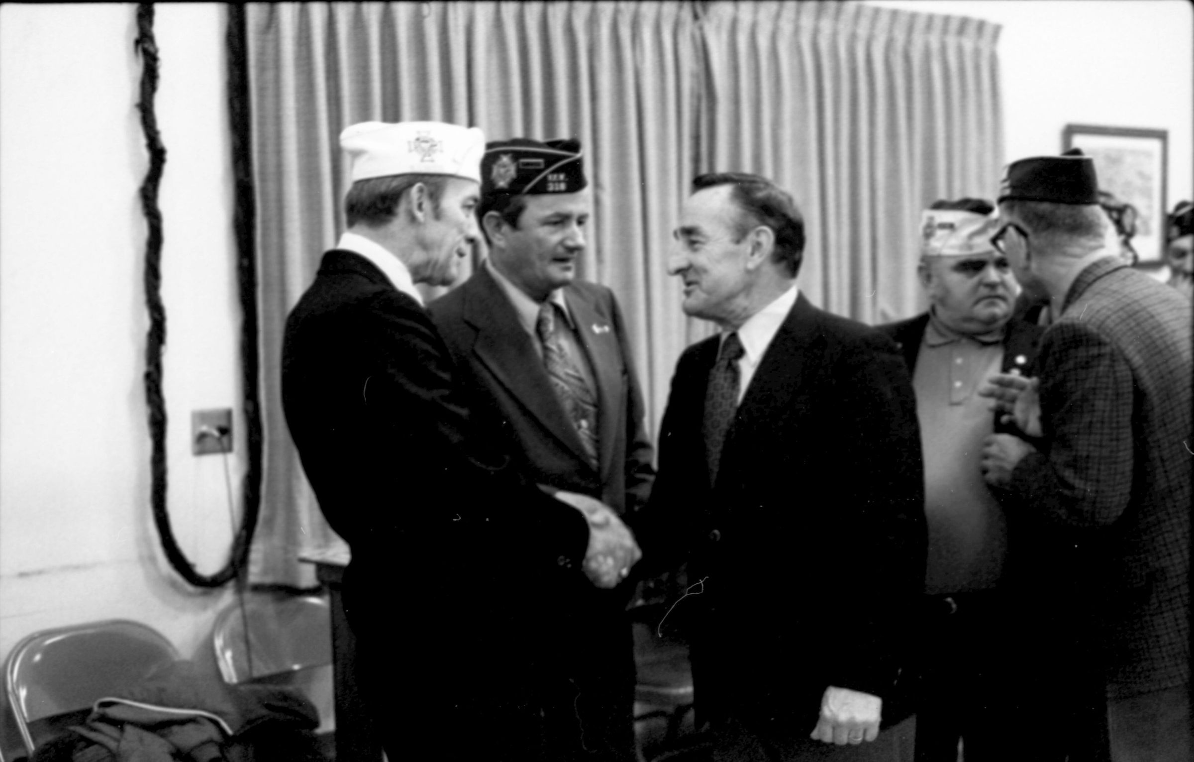 VFW National Commander, 1973. These two black and white film negative strips were created for the Lacey Leader newspaper. These images show various men individually speaking to a man wearing a garrison cap with a Veterans of Foreign Wars patch on the right-hand side (Raymond R. Soden). The man in the garrison cap is on the left-hand side of all of these images.Made/Created