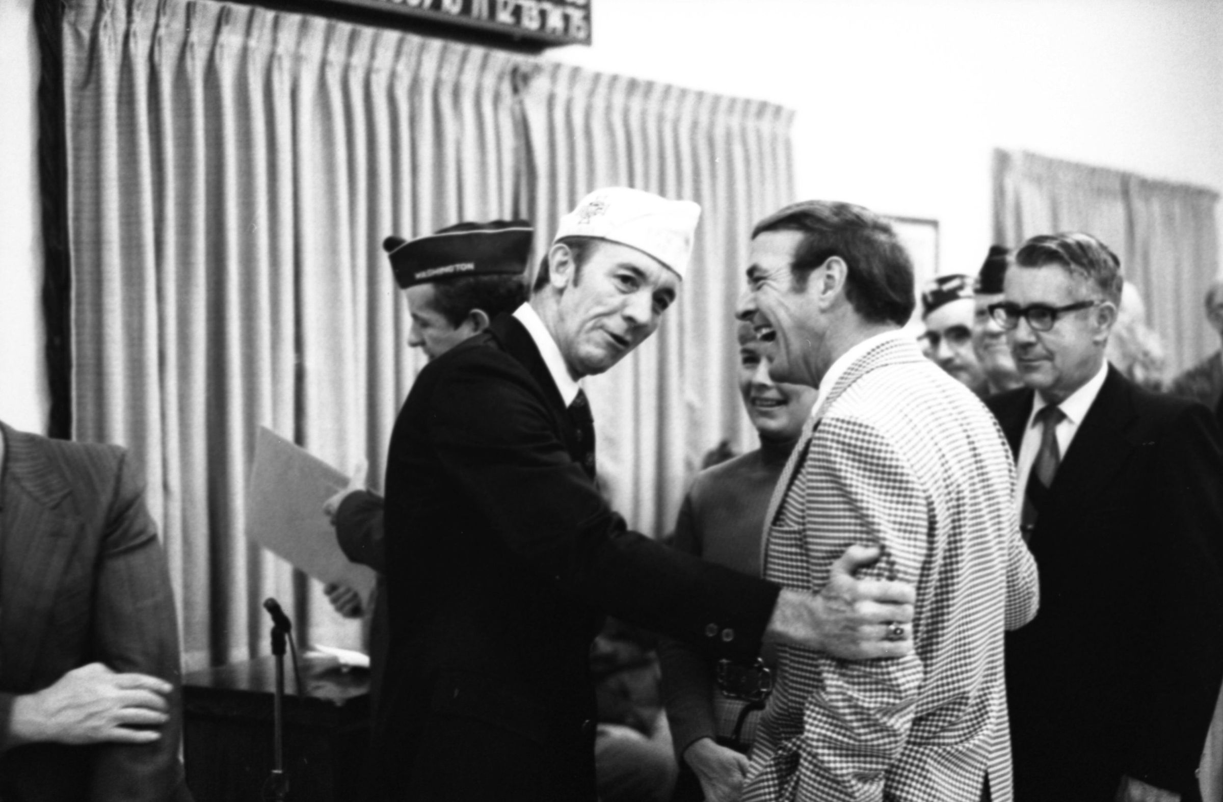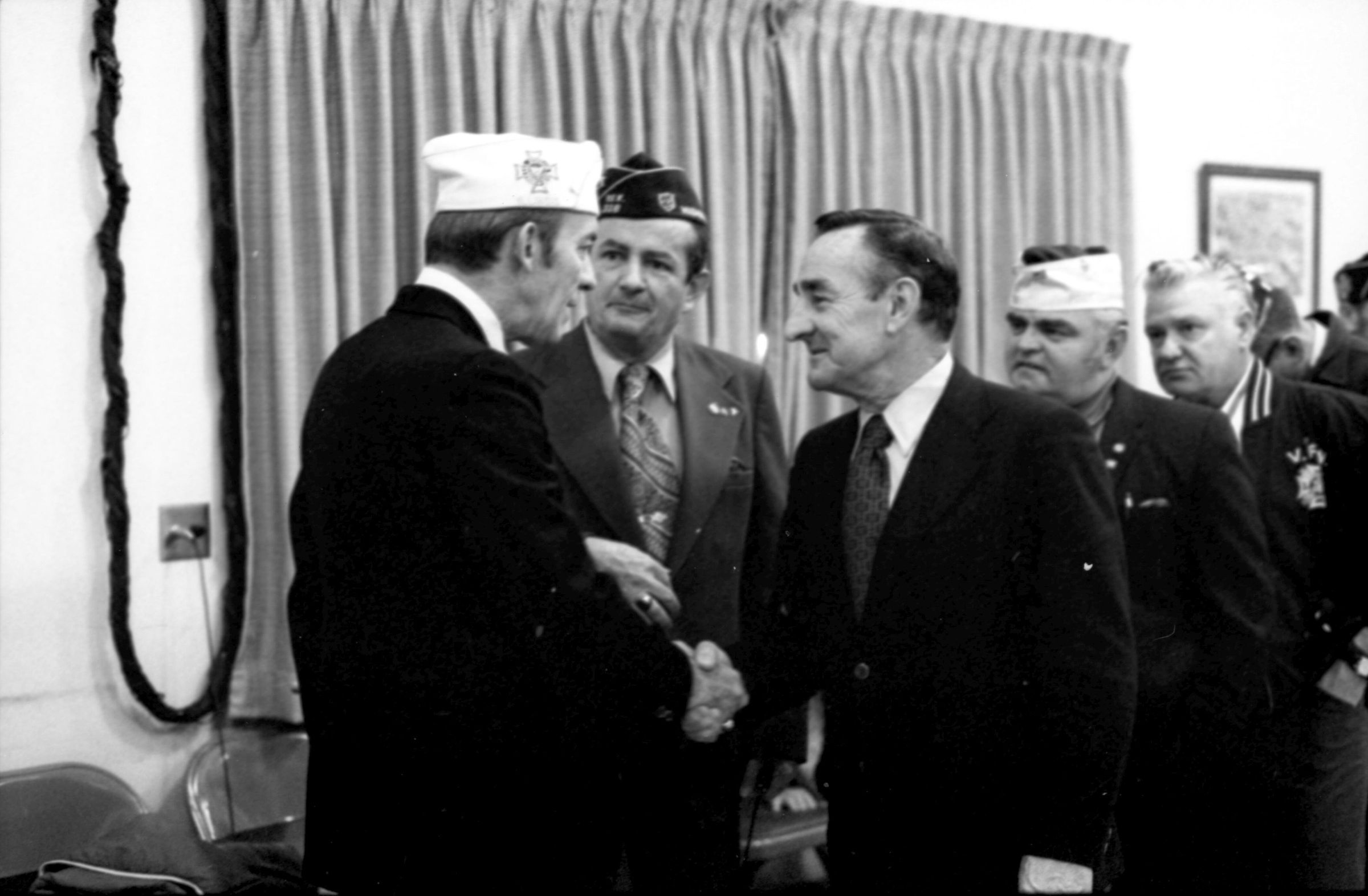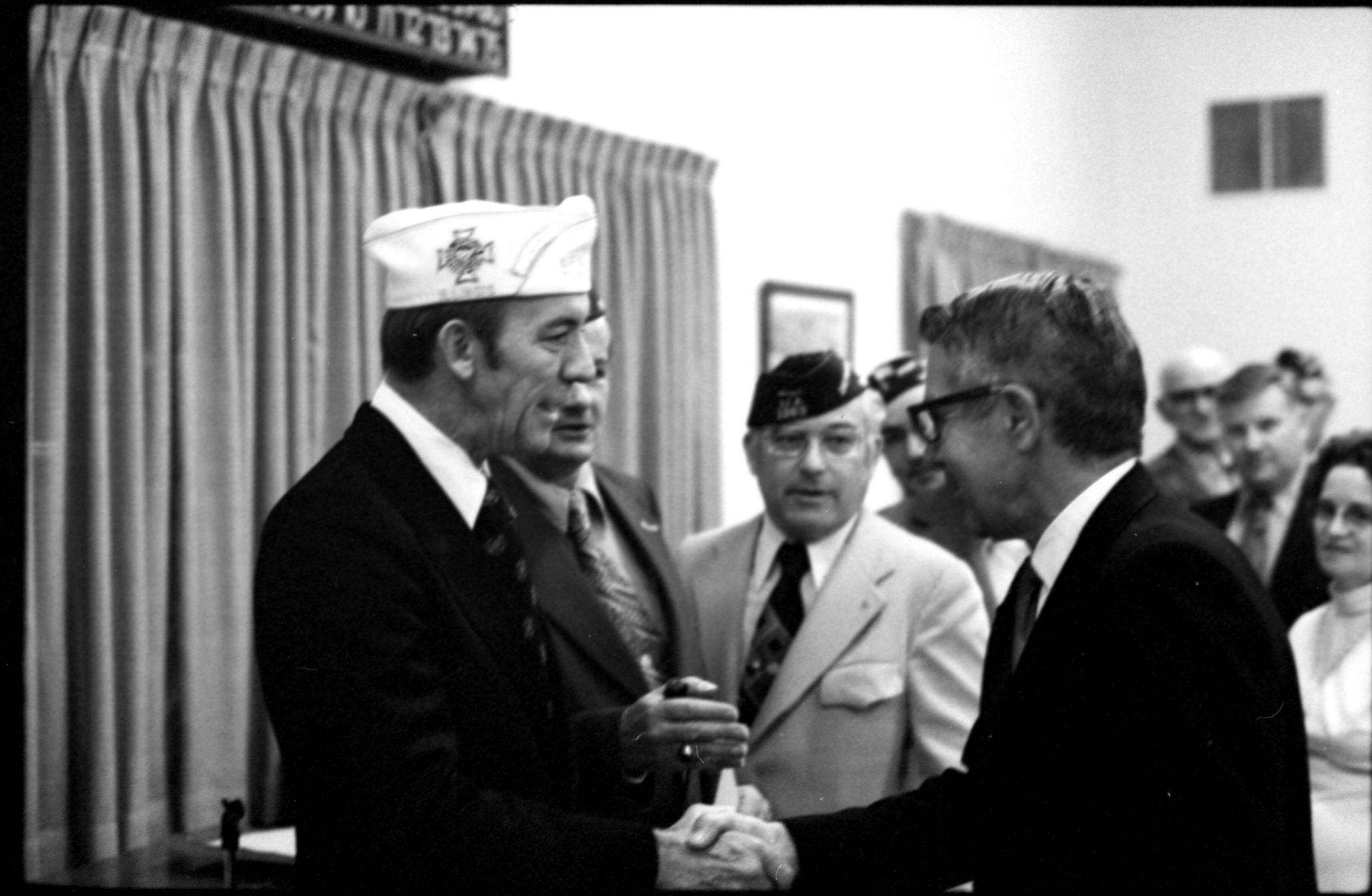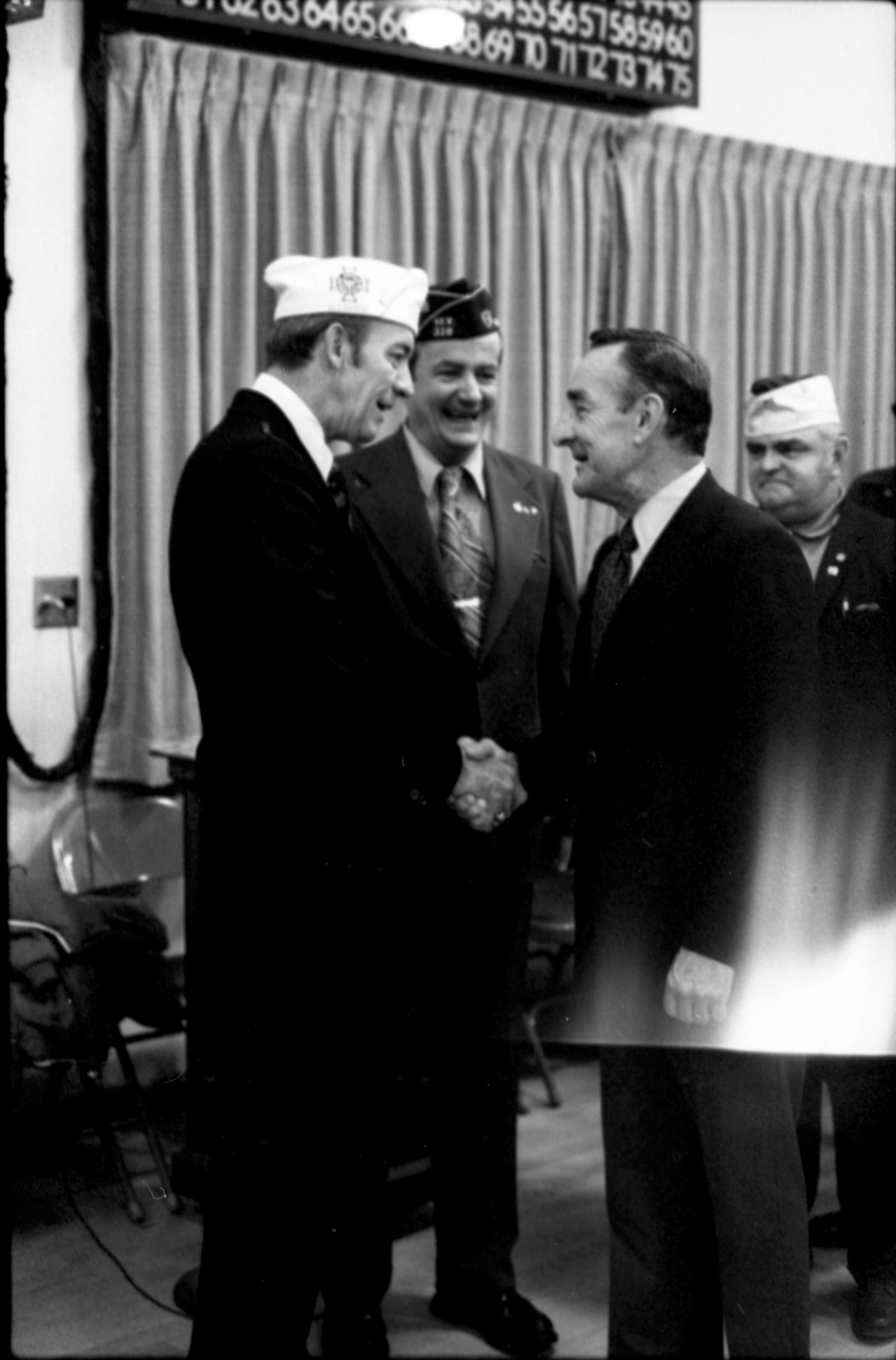 VFW National Commander, 1973. These two black and white film negative strips were created for the Lacey Leader newspaper. These images show various men individually speaking to a man wearing a garrison cap with a Veterans of Foreign Wars patch on the right-hand side (Raymond R. Soden). The man in the garrison cap is on the left-hand side of all of these images.Made/Created
