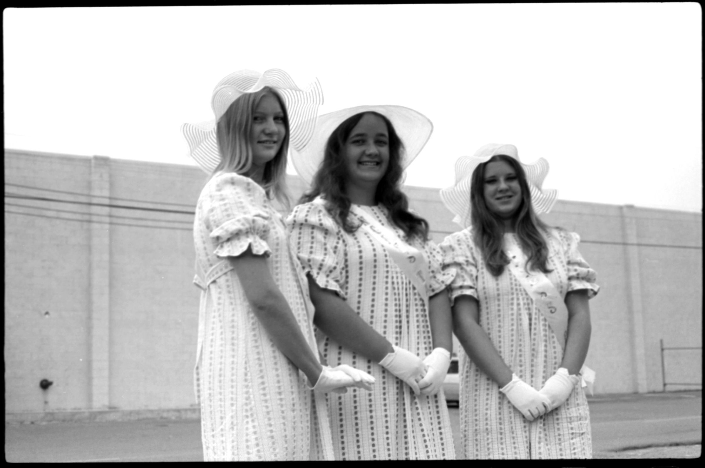 Tenino Labor Day Princesses, 1973. This single black and white film negative strip was created for the Lacey Leader newspaper. These images show three young women (from left to right: Pam Padgett, Tawanna Andrews and Pam Smith) posing together for group photos.Made/Created