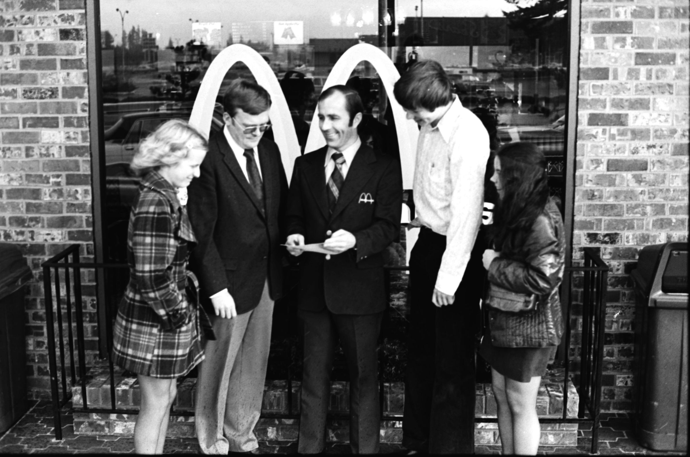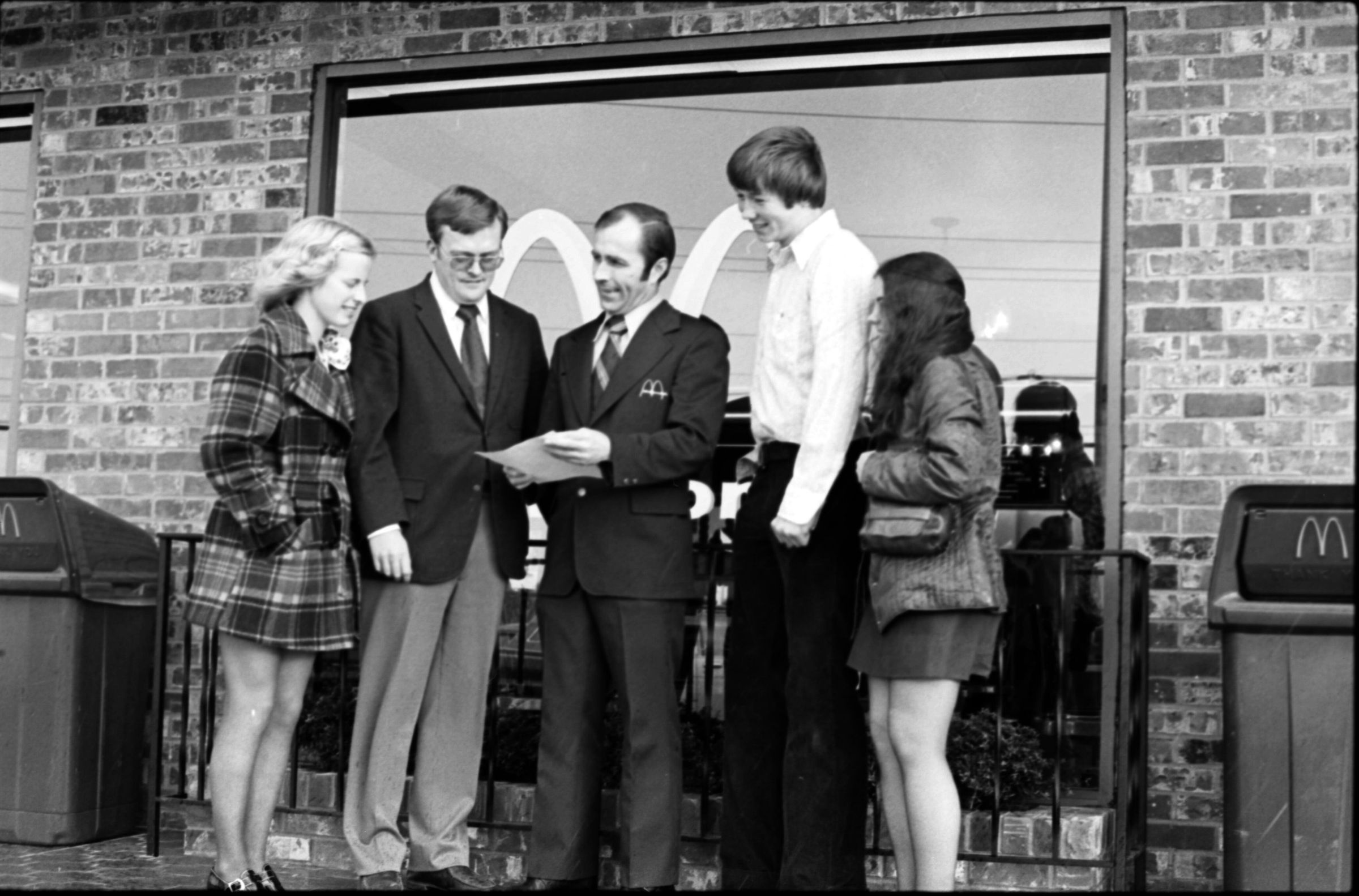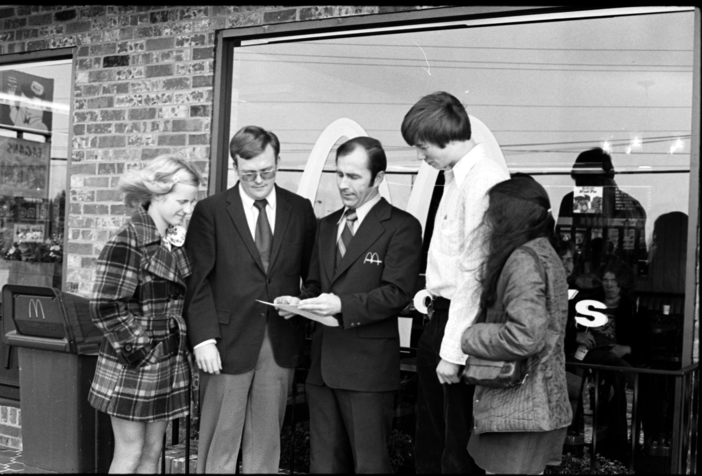 McDonald's, 1973. This single black and white film negative strip was created for the Lacey Leader newspaper. These images show, from left to right, a young woman in a plaid pea coat, a man with glasses wearing a suit and tie, a man in a blazer with the McDonald's logo on the left breast, a tall young man in a dress shirt and tie, and a young woman in a jacket holding a purse. The man in the McDonald's blazer is holding a document out in front of himself. The four other people are looking toward the document. All of these images were captured immediately in front of a window of a McDonald's restaurant. All of the images are nearly identical.Made/Created