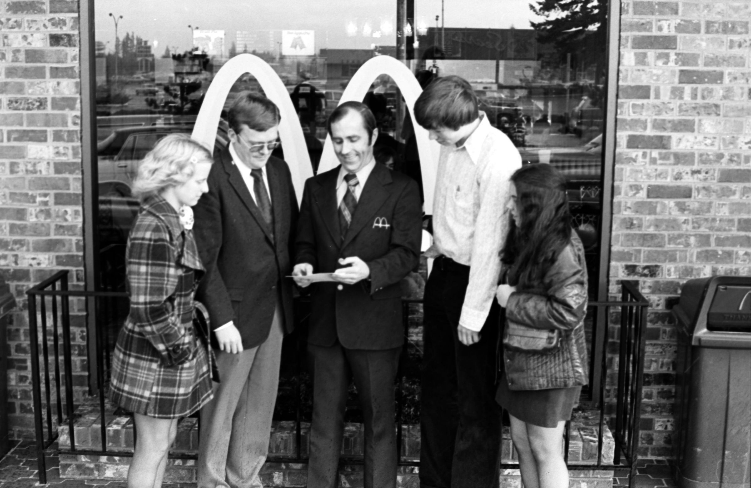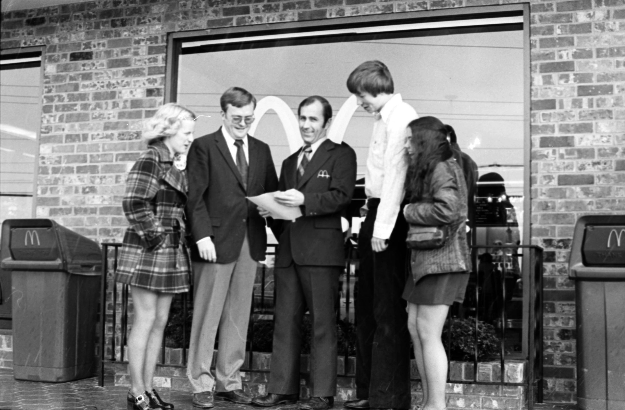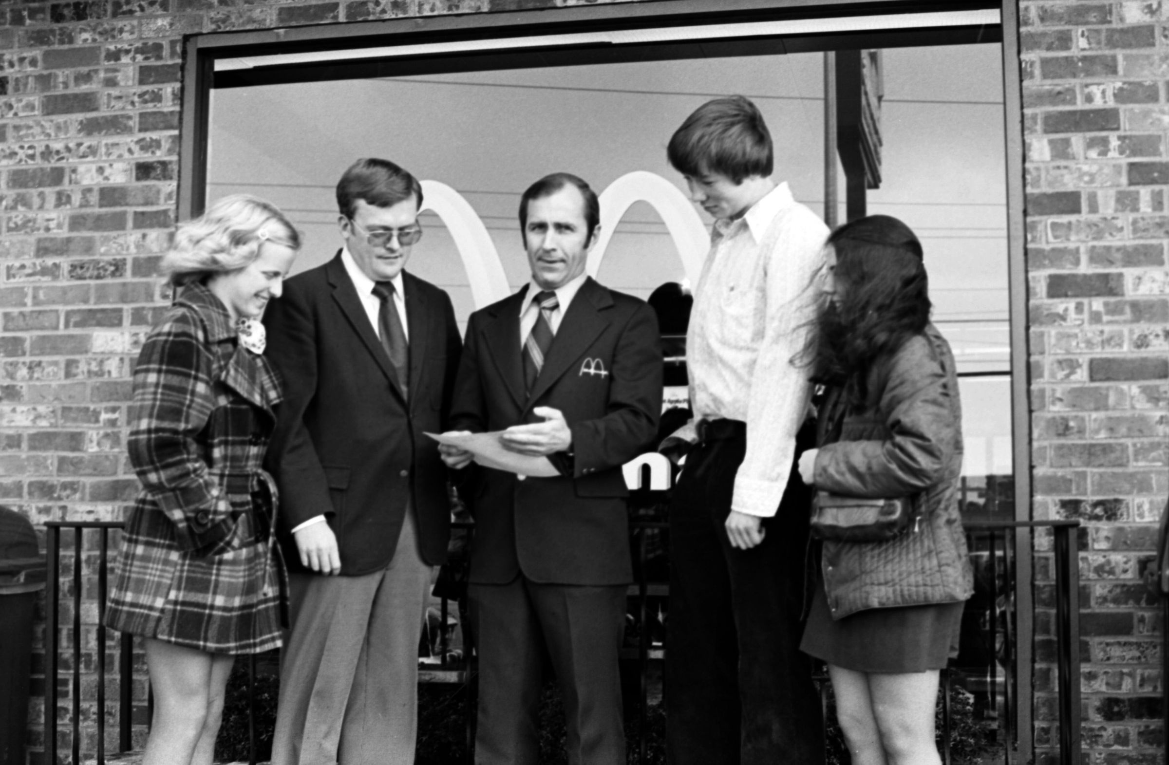 McDonald's, 1973. This single black and white film negative strip was created for the Lacey Leader newspaper. These images show, from left to right, a young woman in a plaid pea coat, a man with glasses wearing a suit and tie, a man in a blazer with the McDonald's logo on the left breast, a tall young man in a dress shirt and tie, and a young woman in a jacket holding a purse. The man in the McDonald's blazer is holding a document out in front of himself. The four other people are looking toward the document. All of these images were captured immediately in front of a window of a McDonald's restaurant. All of the images are nearly identical.Made/Created
