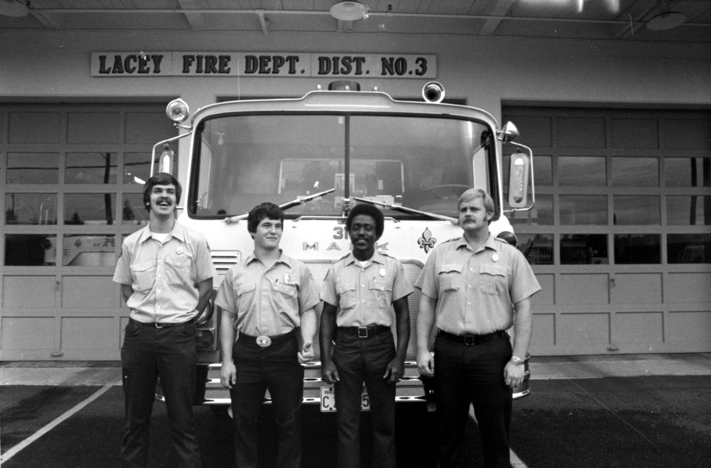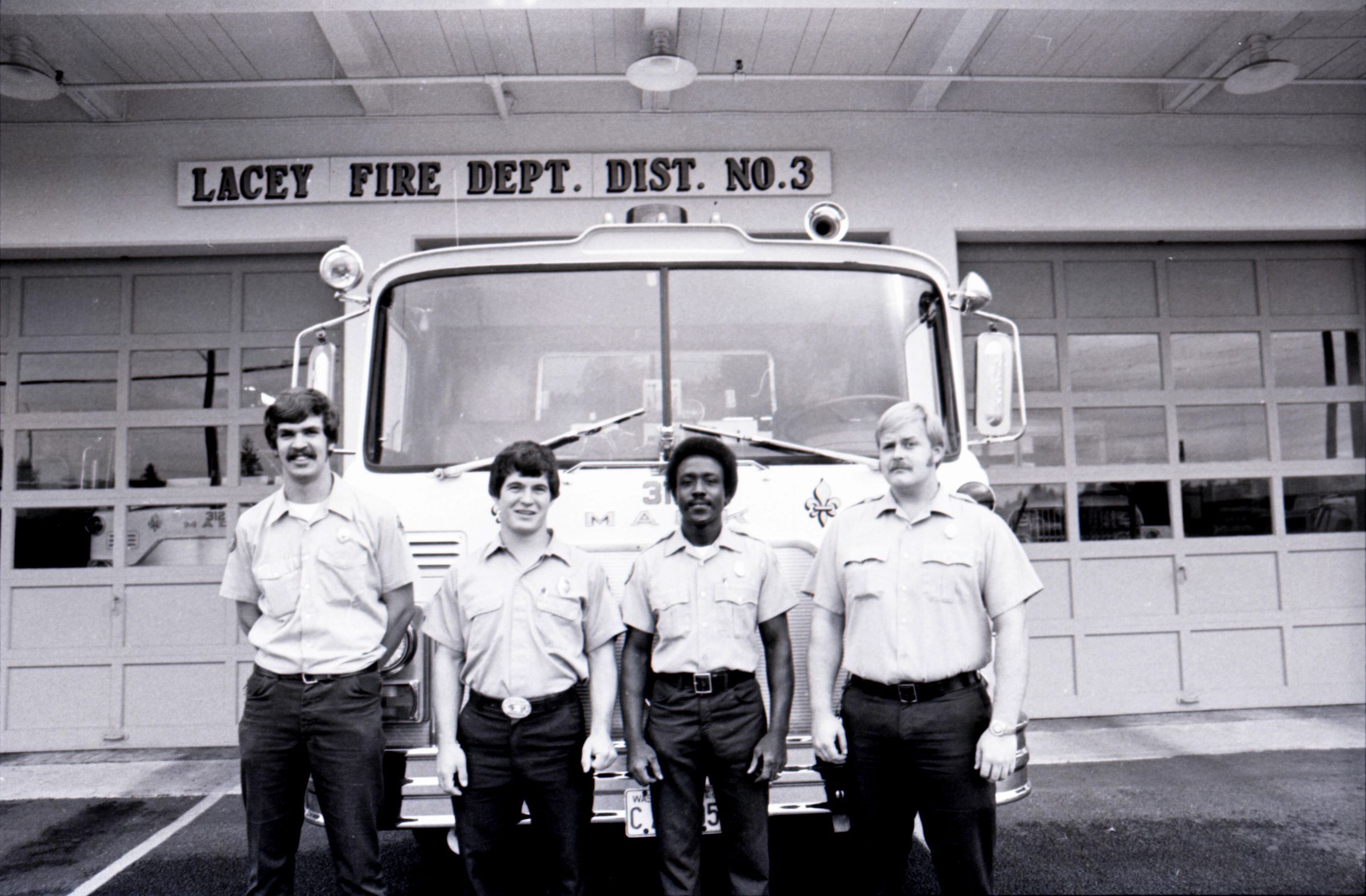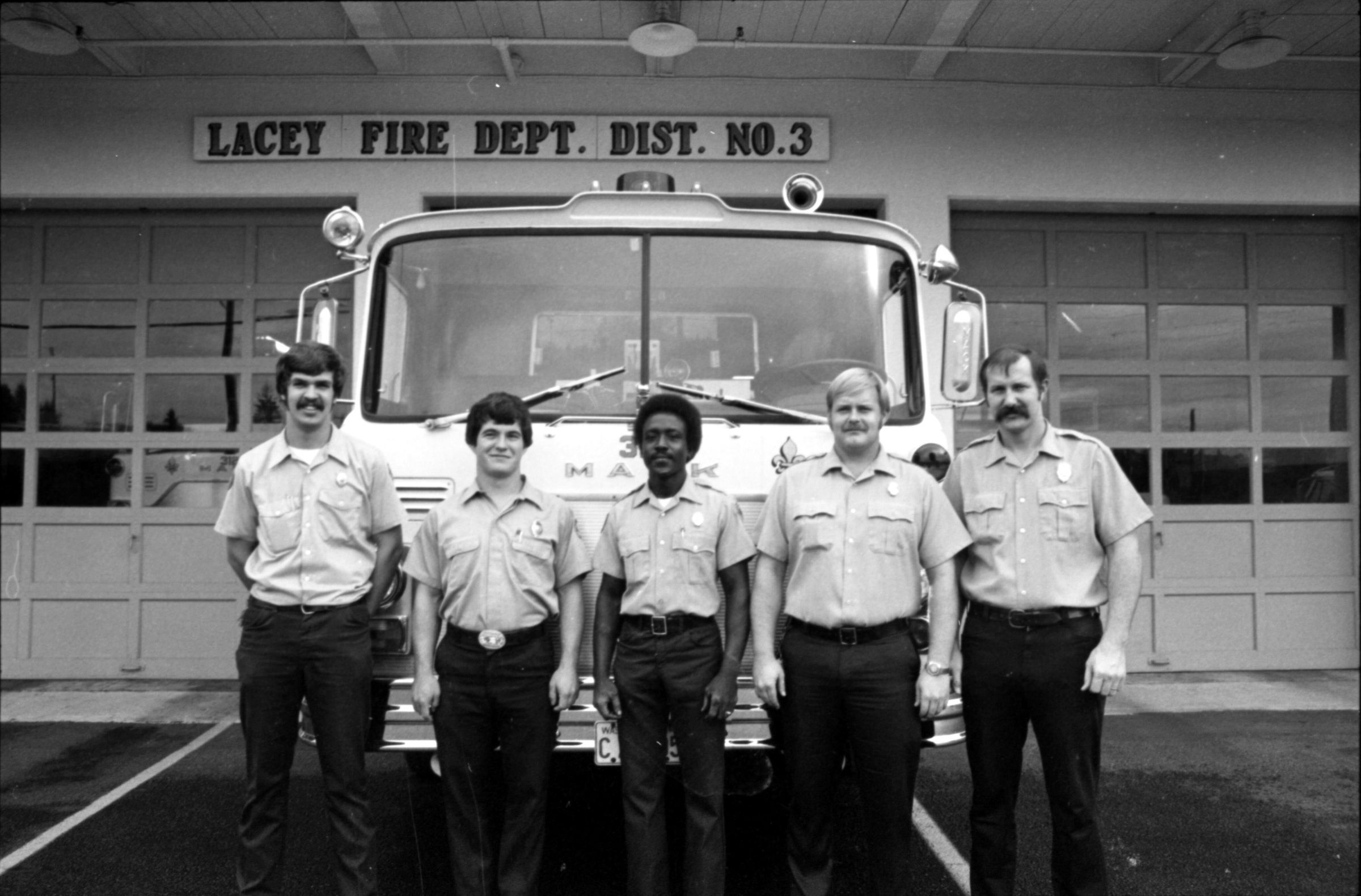 Lacey Fire District #3, 1978. This single black and white film negative strip was created for the Lacey Leader newspaper. These images show four men in matching outfits standing in a row along the front end of a fire engine. Each of these men is wearing a metal star-shaped badge on the left breast of their shirts. A building with at least three large garage doors occupies the background of the image. A sign on the building visible over the top of the fire engine is "LACEY FIRE DEPT. DIST. NO. 3." All of the images are virtually identical.Made/Created