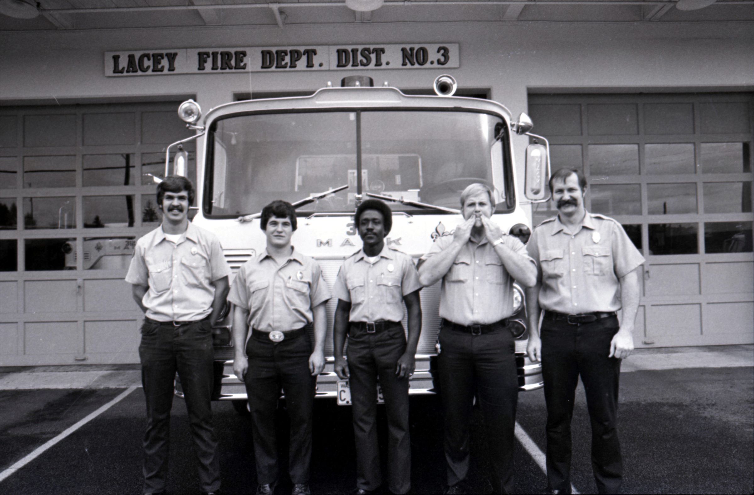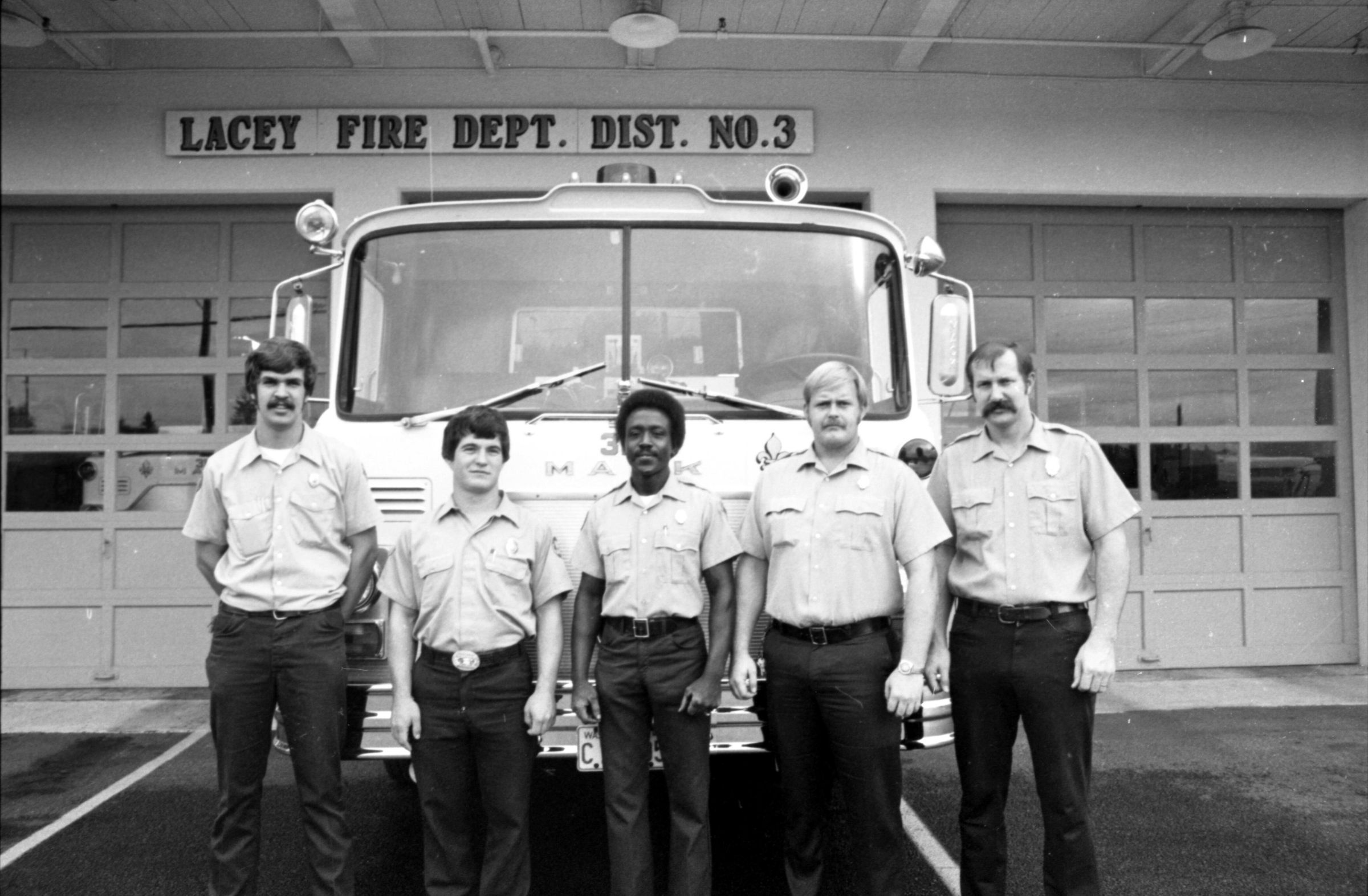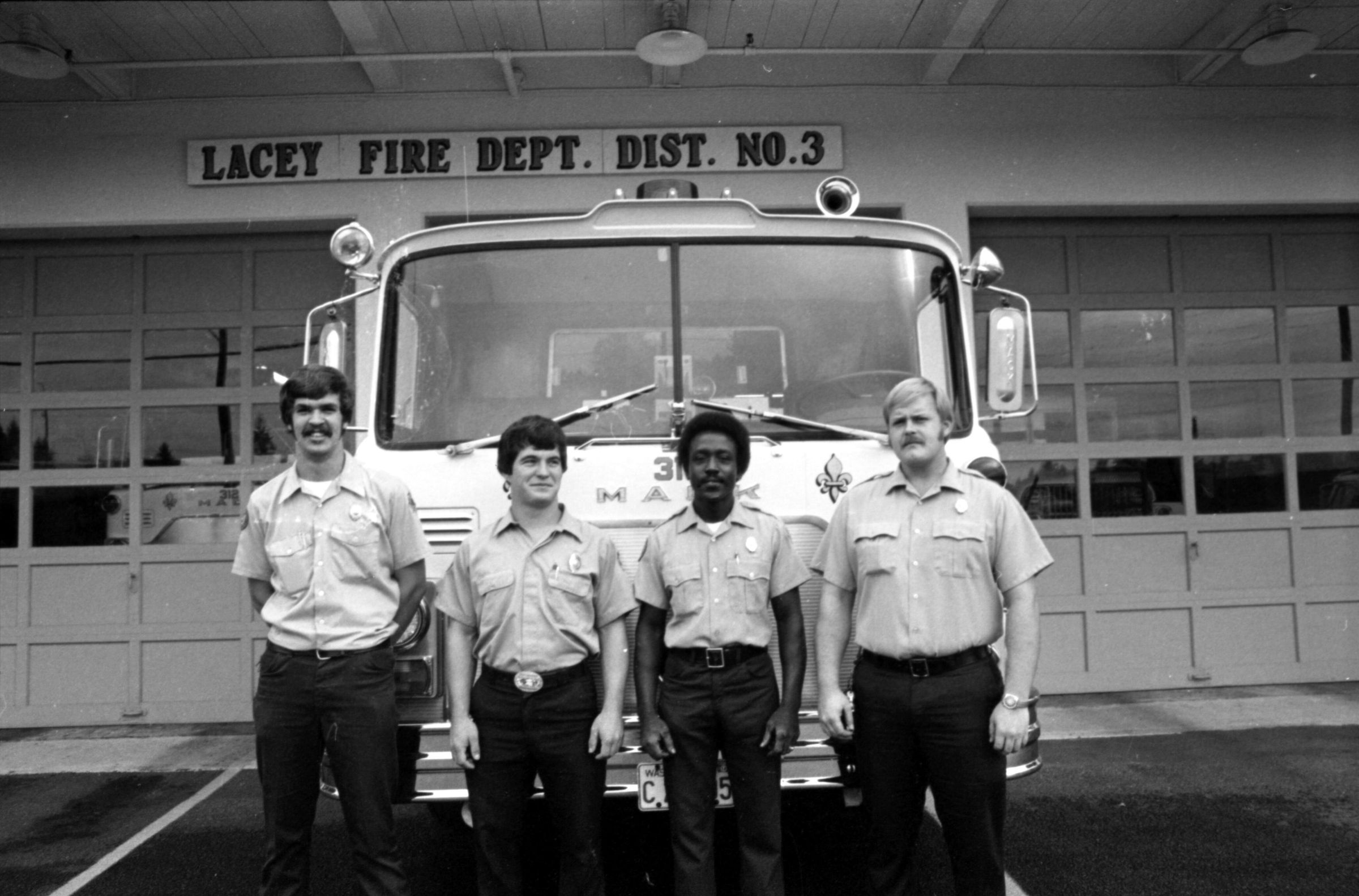Lacey Fire District #3, 1978. This single black and white film negative strip was created for the Lacey Leader newspaper. These images show four men in matching outfits standing in a row along the front end of a fire engine. Each of these men is wearing a metal star-shaped badge on the left breast of their shirts. A building with at least three large garage doors occupies the background of the image. A sign on the building visible over the top of the fire engine is "LACEY FIRE DEPT. DIST. NO. 3." All of the images are virtually identical.Made/Created