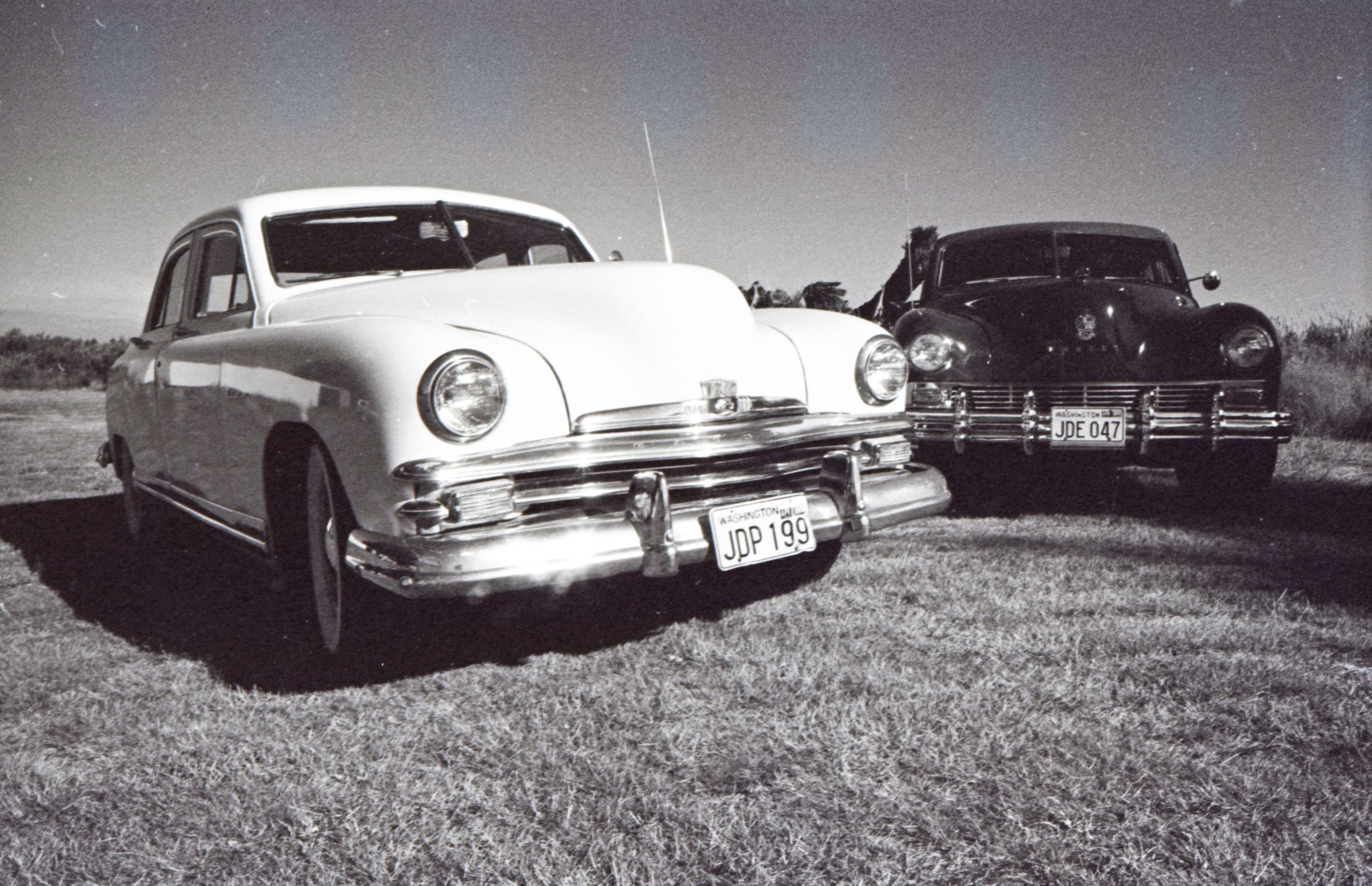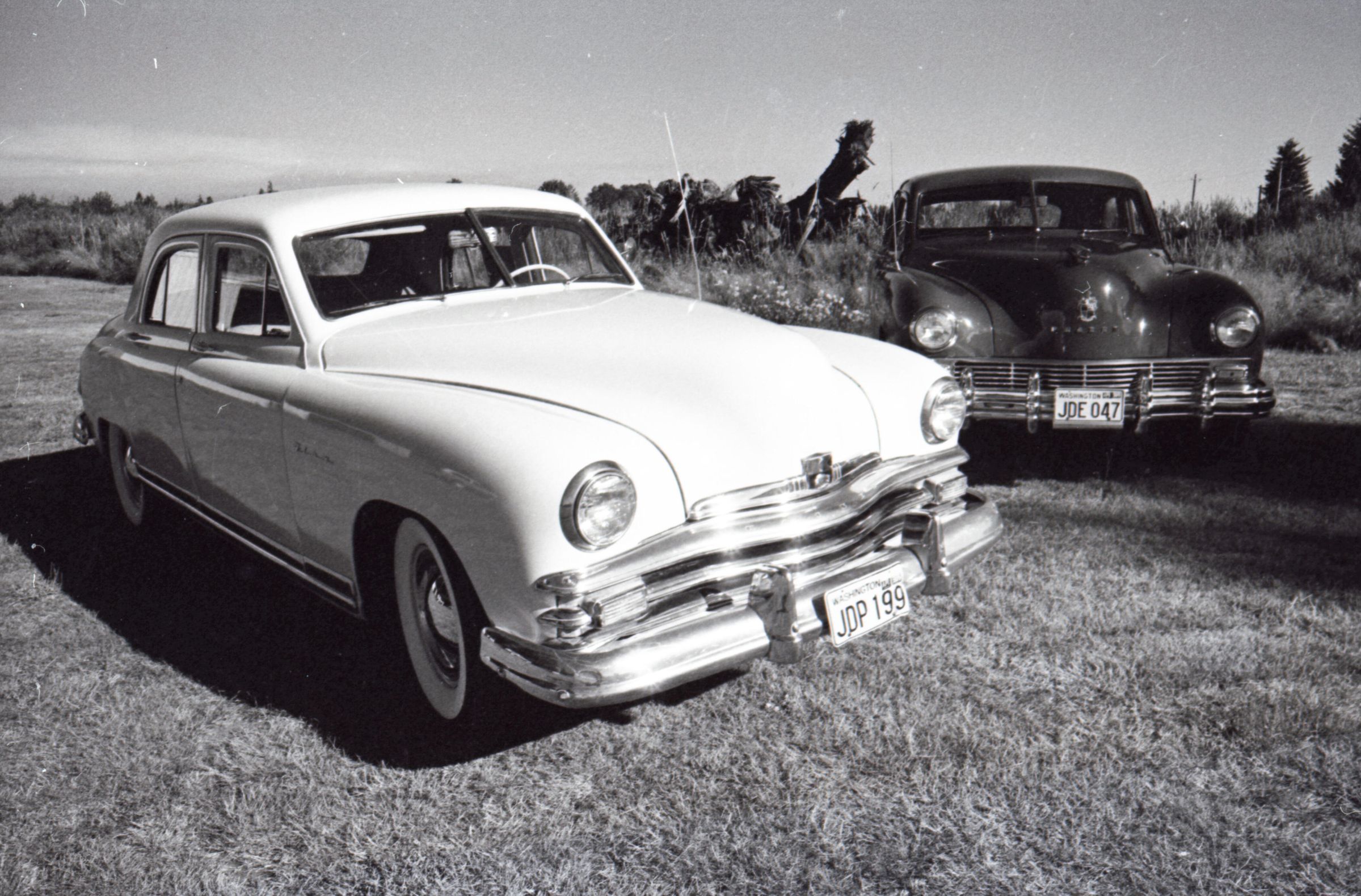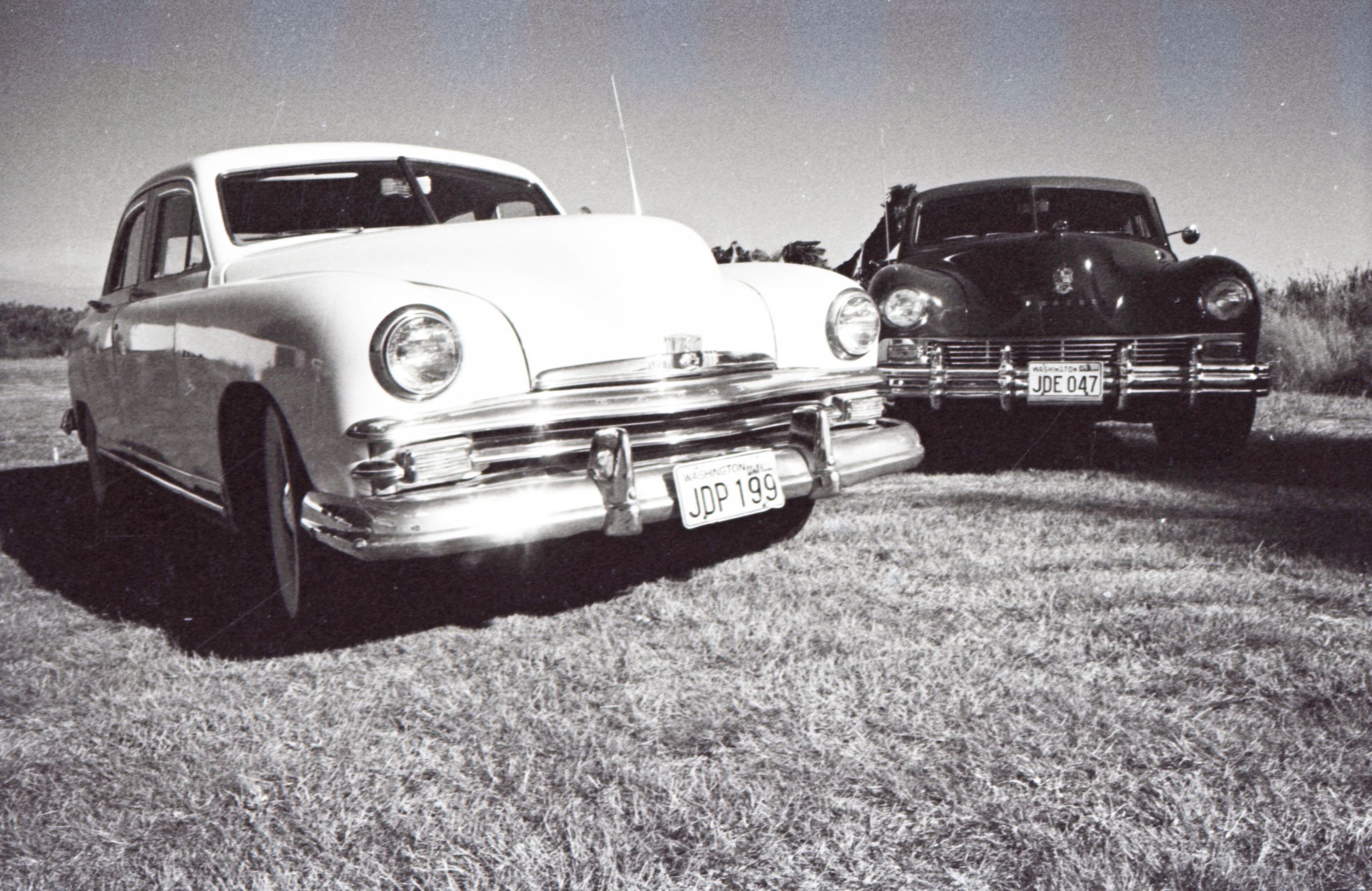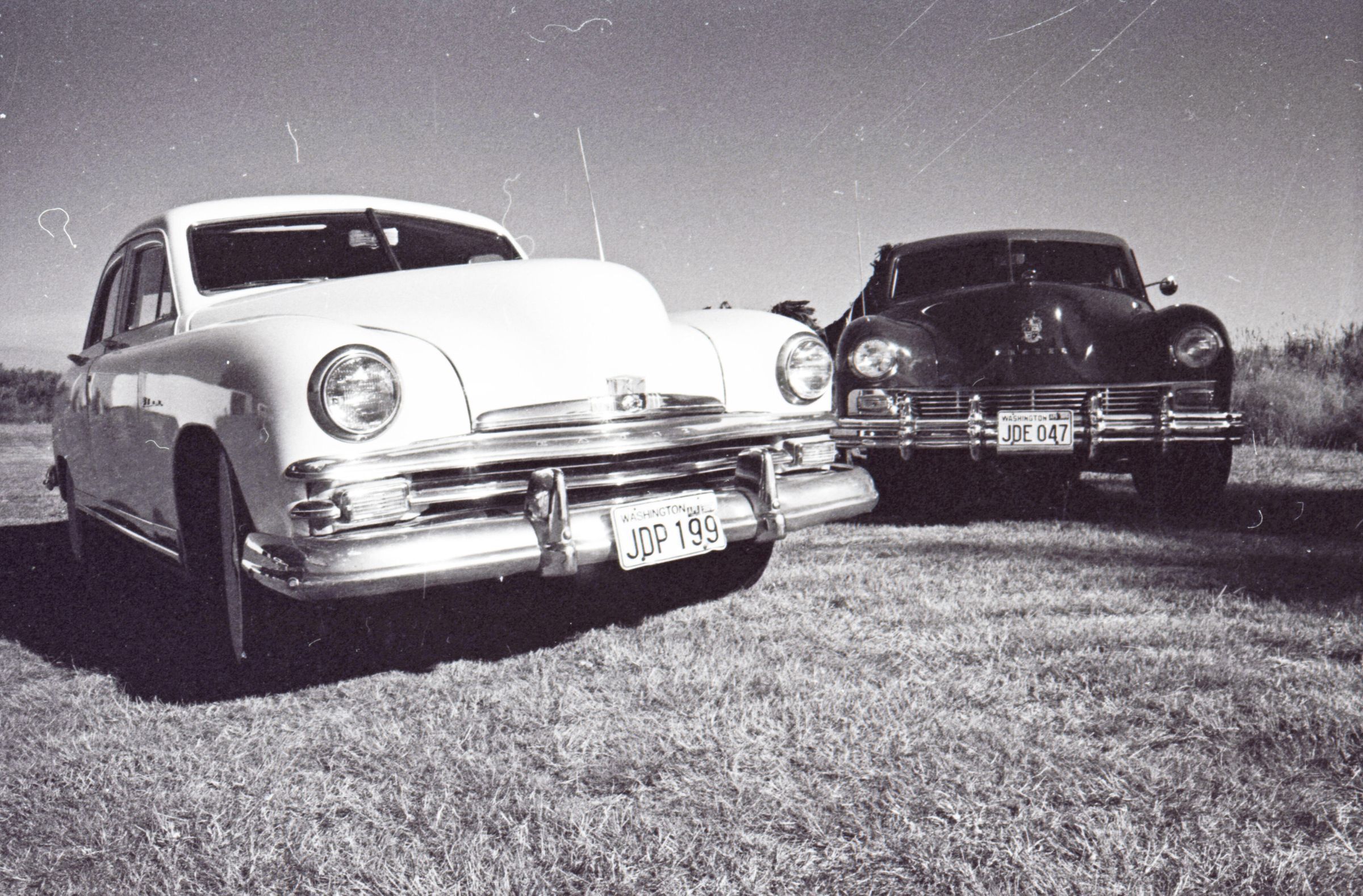 Old Cars, 1978. These two black and white film negative strips were created for the Lacey Leader newspaper. These images show two automobiles produced by the Kaiser-Frazer Corporation, likely in the early 1950s. The car on the left has a Kaiser Motors logo on it and it reads "KAISER" along the top portion of the front bumper. The car on the left has a coat-of-arms logo on the front of the hood, and under this logo it reads "FRAZER." The cars are parked next to eachother with their front ends closer together than their back ends. They are parked on a grassy lawn. Image 2 shows the two cars. The front end and the passenger side of the car on the left is visible, while only the front end of the car on the right is visible. What appears to be the broken trunk of a tree is sticking up behind the two cars. Image 3 is similar to the previous image, but here the photographer has moved approximately 25 feet to their right. Here the front end and the driver's side of both of the cars are visible. A garage or small barn is visible in the background. This building has a open garage-sized door on its left-hand side. Image 4 shows the two cars, but here the photographer appears to only be approximately 10-12 feet away from the car on the left. The front, passenger side corner of this car is the corner nearest to the camera. Image 5 was taken from a very similar position to that of image 4, but here the photographer has stooped down toward the ground. Images 6 and 7 are nearly identical to image 5. Images 8 and 9 are nearly identical to image 4.Made/Created