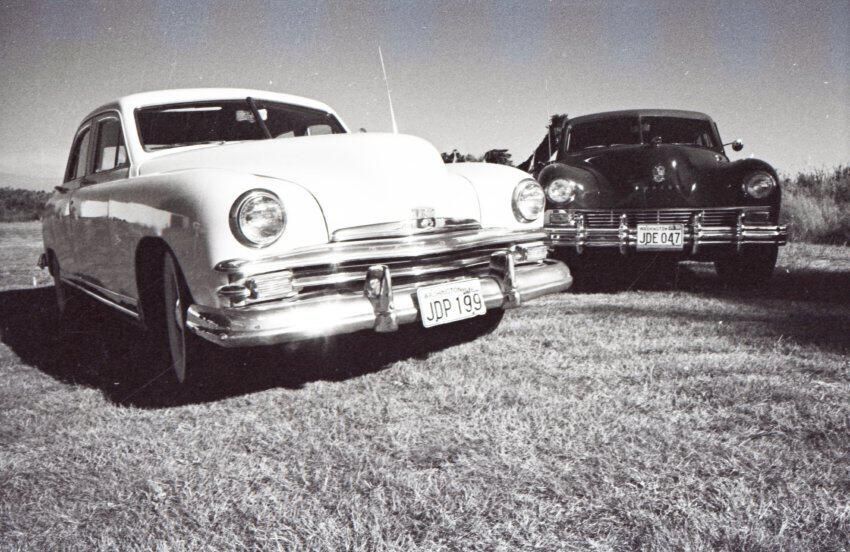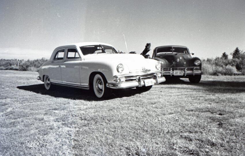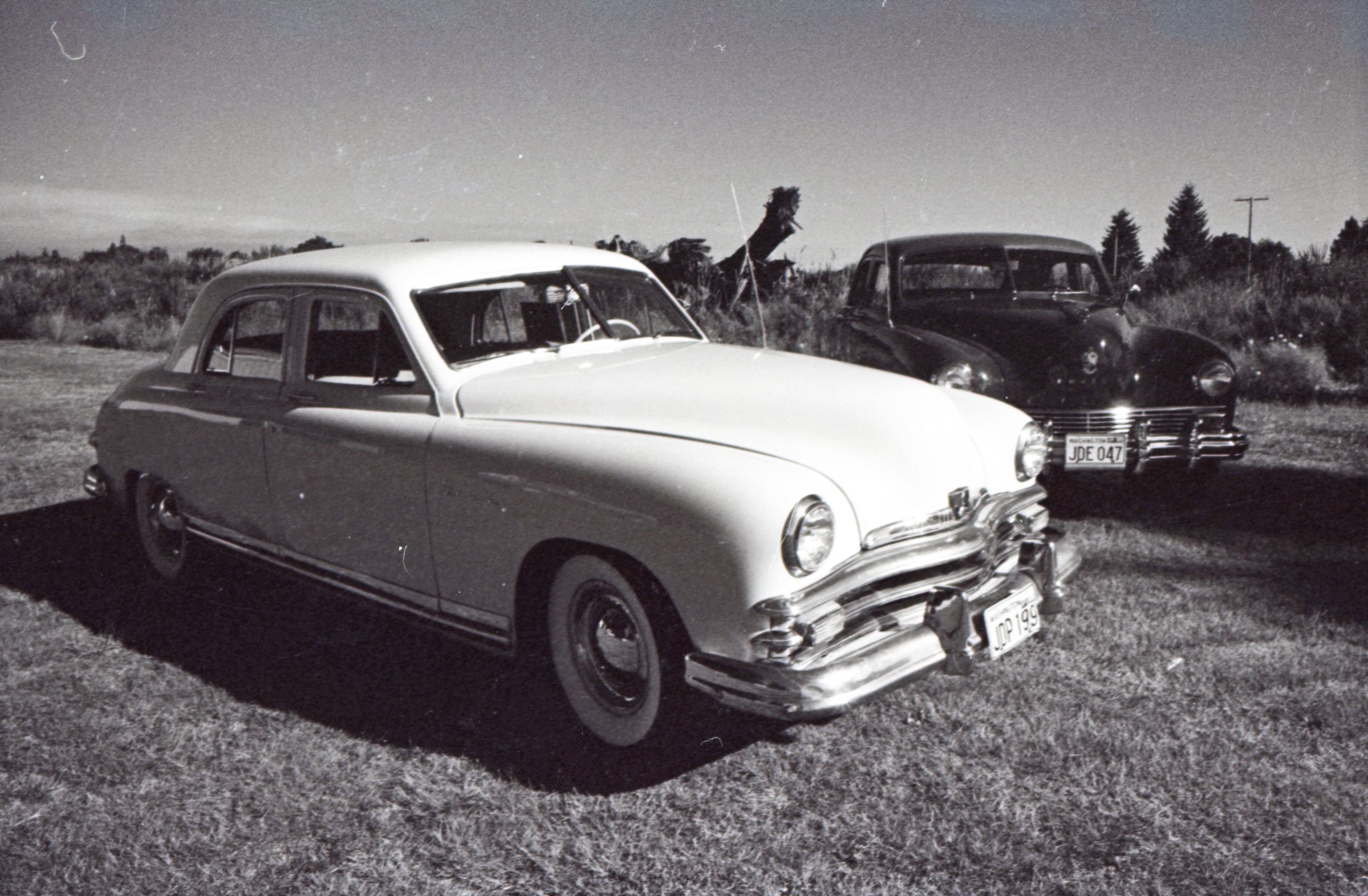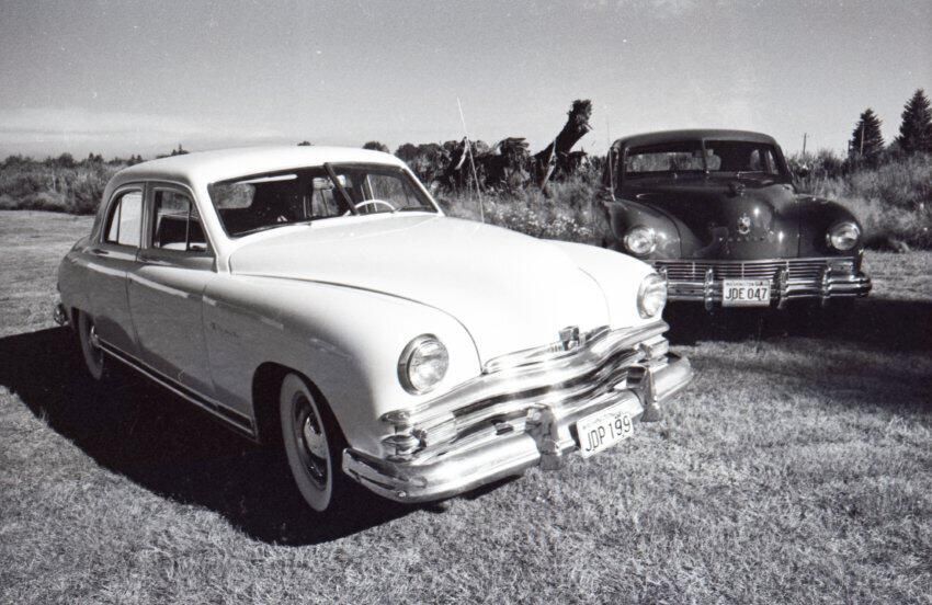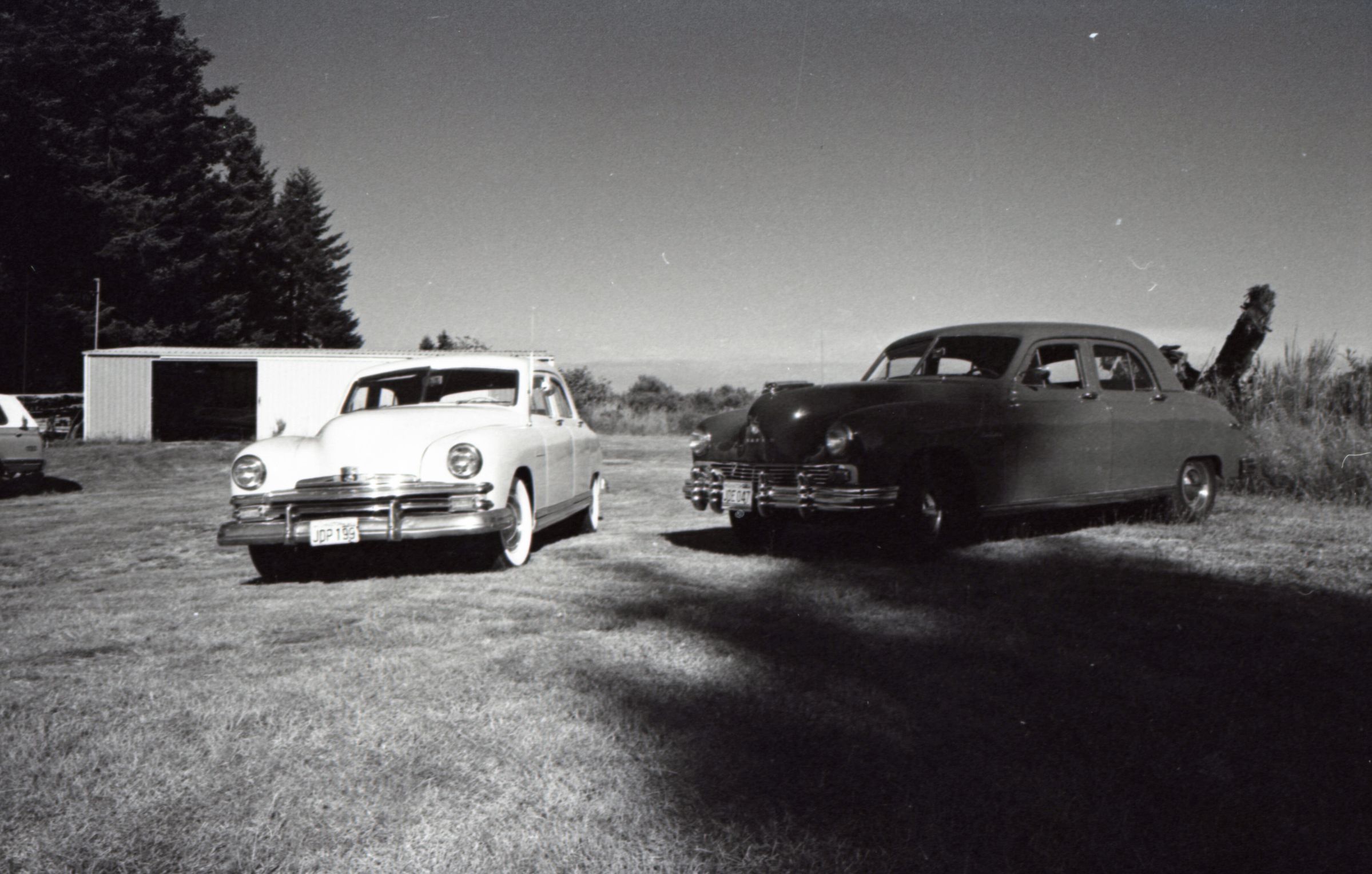 Old Cars, 1978. These two black and white film negative strips were created for the Lacey Leader newspaper. These images show two automobiles produced by the Kaiser-Frazer Corporation, likely in the early 1950s. The car on the left has a Kaiser Motors logo on it and it reads "KAISER" along the top portion of the front bumper. The car on the left has a coat-of-arms logo on the front of the hood, and under this logo it reads "FRAZER." The cars are parked next to eachother with their front ends closer together than their back ends. They are parked on a grassy lawn. Image 2 shows the two cars. The front end and the passenger side of the car on the left is visible, while only the front end of the car on the right is visible. What appears to be the broken trunk of a tree is sticking up behind the two cars. Image 3 is similar to the previous image, but here the photographer has moved approximately 25 feet to their right. Here the front end and the driver's side of both of the cars are visible. A garage or small barn is visible in the background. This building has a open garage-sized door on its left-hand side. Image 4 shows the two cars, but here the photographer appears to only be approximately 10-12 feet away from the car on the left. The front, passenger side corner of this car is the corner nearest to the camera. Image 5 was taken from a very similar position to that of image 4, but here the photographer has stooped down toward the ground. Images 6 and 7 are nearly identical to image 5. Images 8 and 9 are nearly identical to image 4.Made/Created