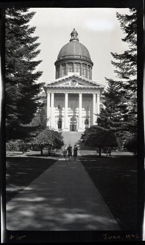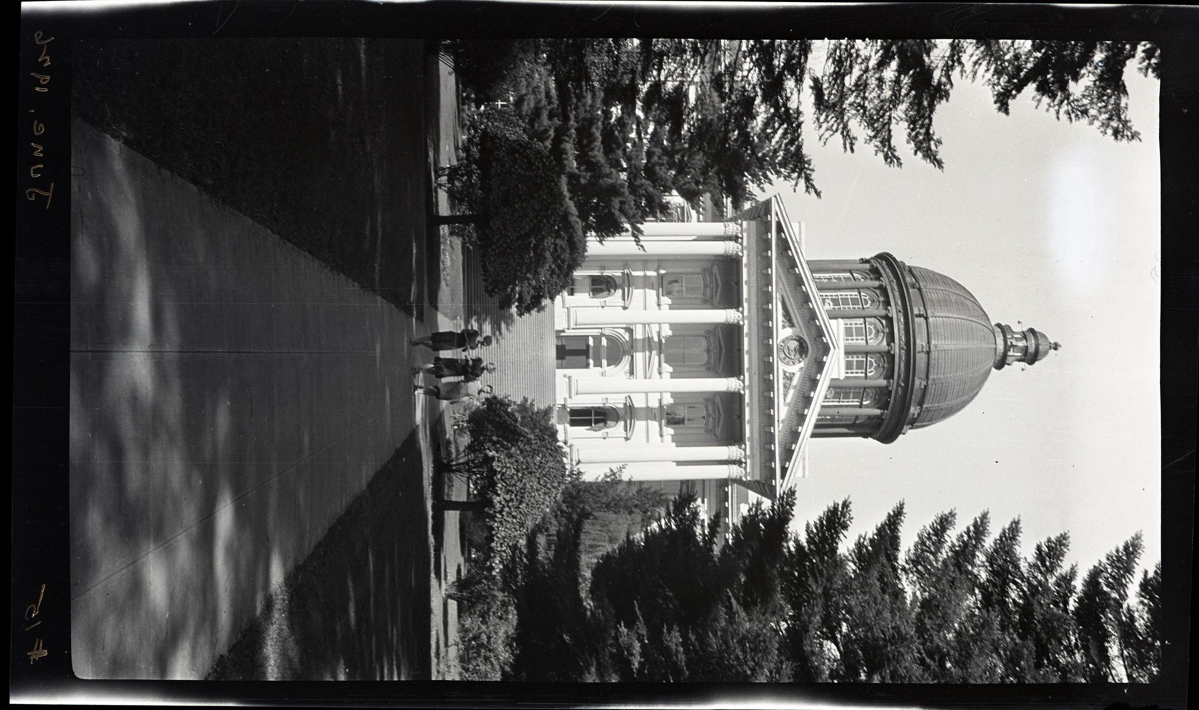 Black and white negative of the Oregon State Capitol Building. This negative produced print 2012-002-0811.2a. There is a portico with columns over which is a dome with a cupola. There is a sidewalk from the bottom of the print to steps leading to the entrance. Three individuals are on the sidewalk. There are decorative trees on each side of the sidewalk and taller trees at the sides of the print.