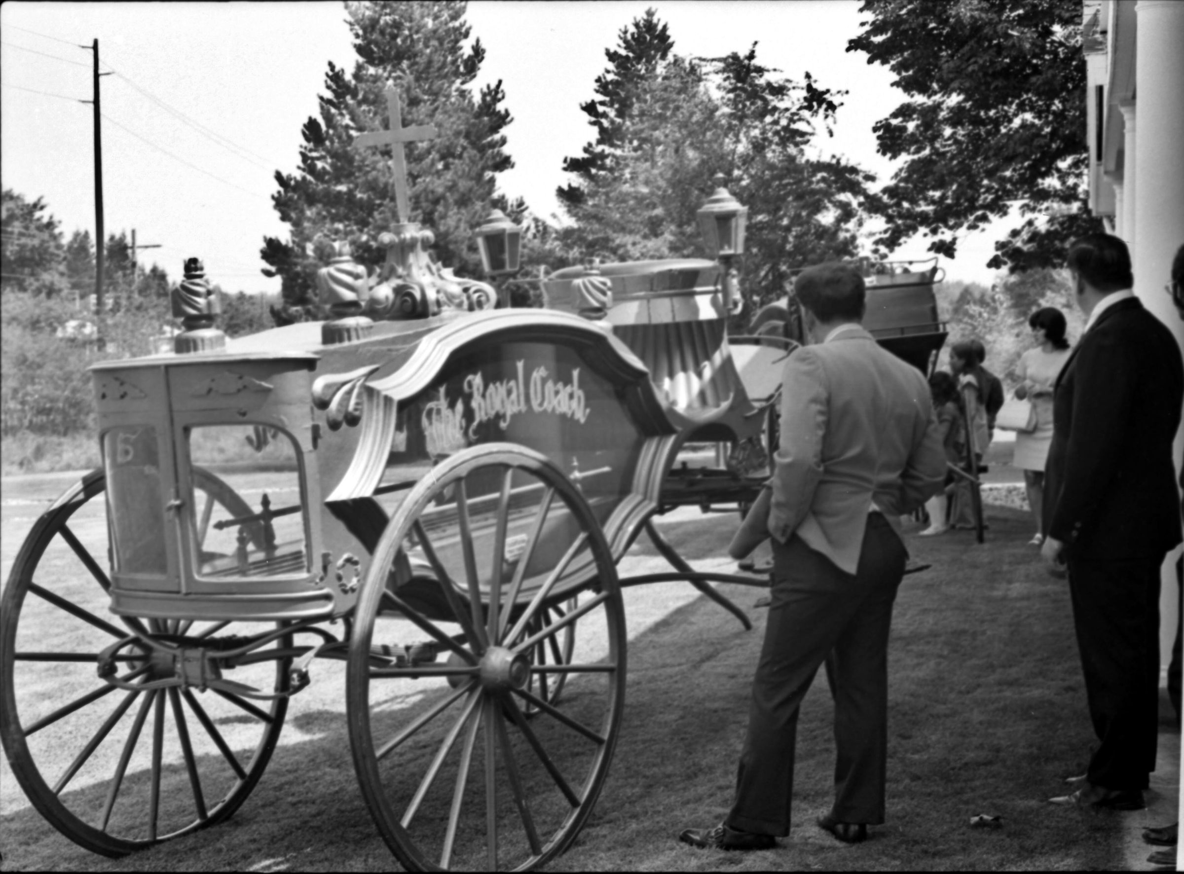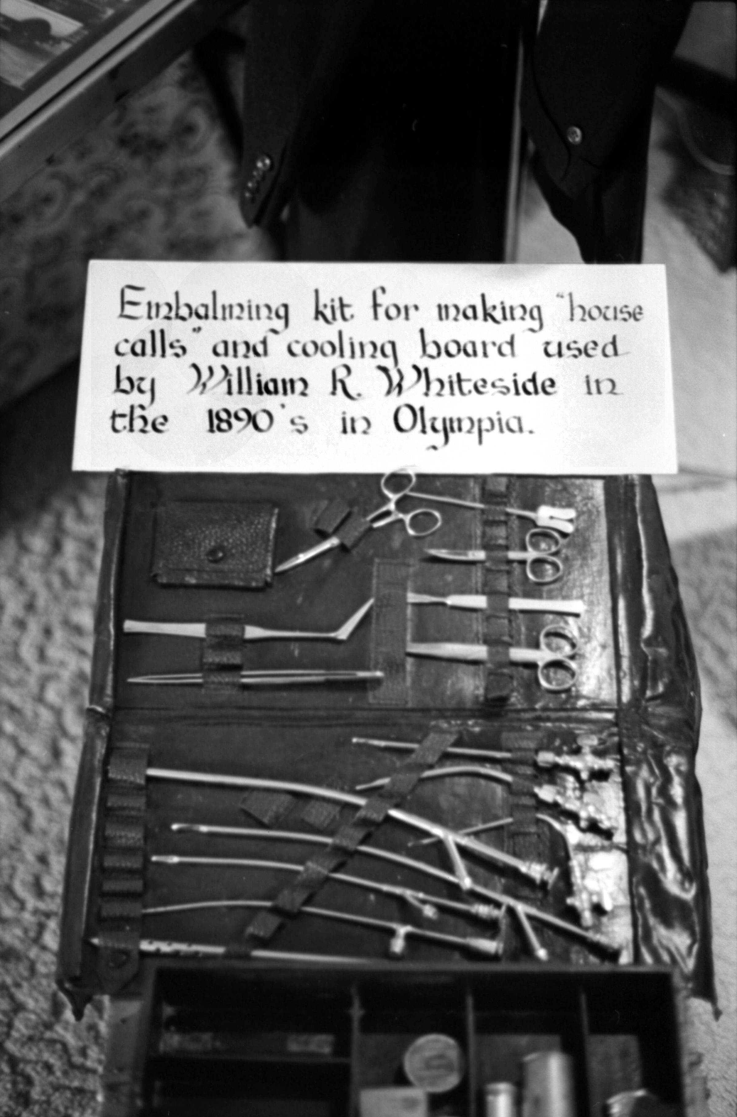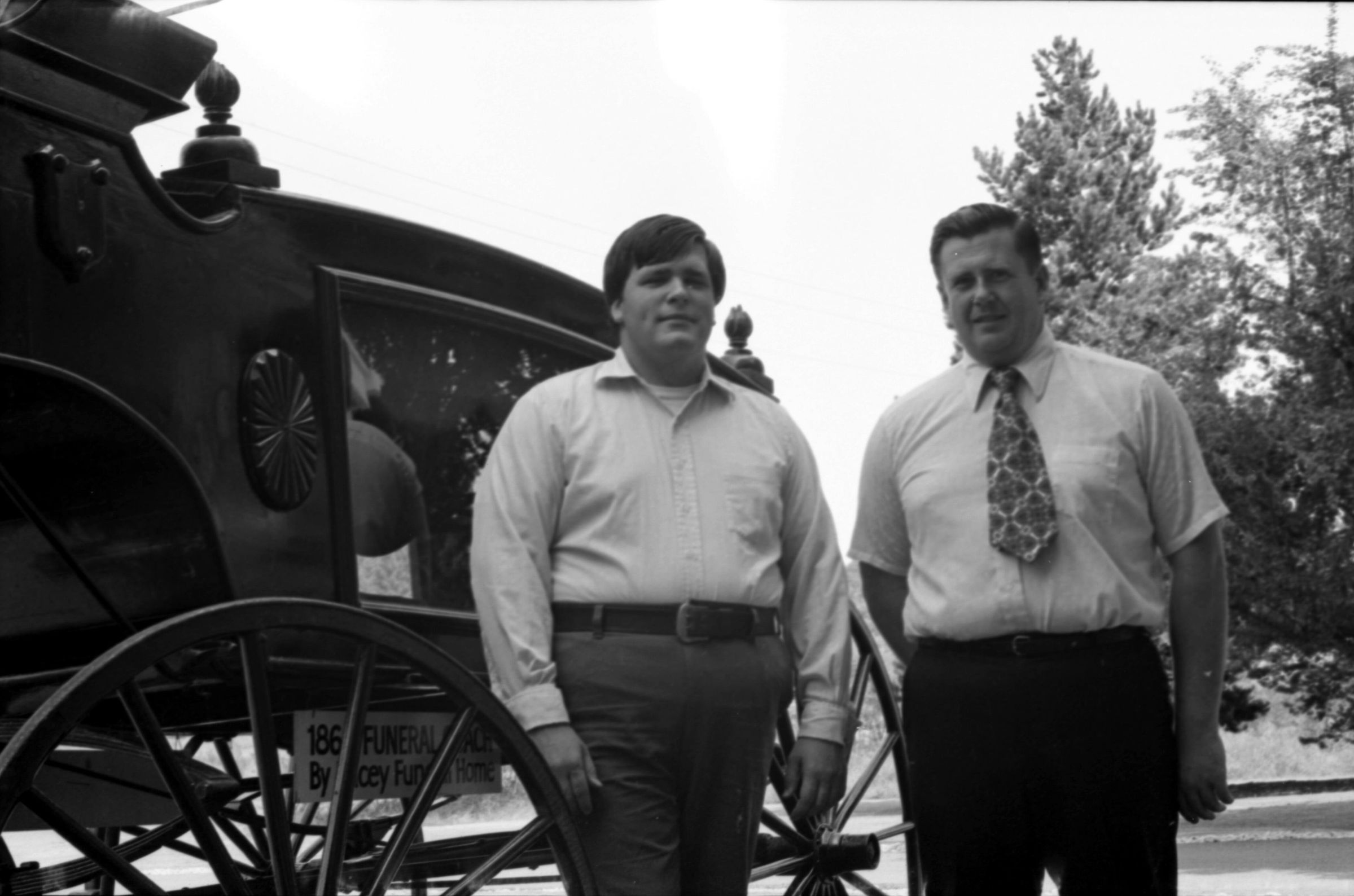 Lacey Funeral Home Open House, 1973. These two black and white film negative strips were created for the Lacey Leader newspaper. These images show a set of late-19th century embalming tools and two men posing next to two or three different horse-drawn carriages.Made/Created