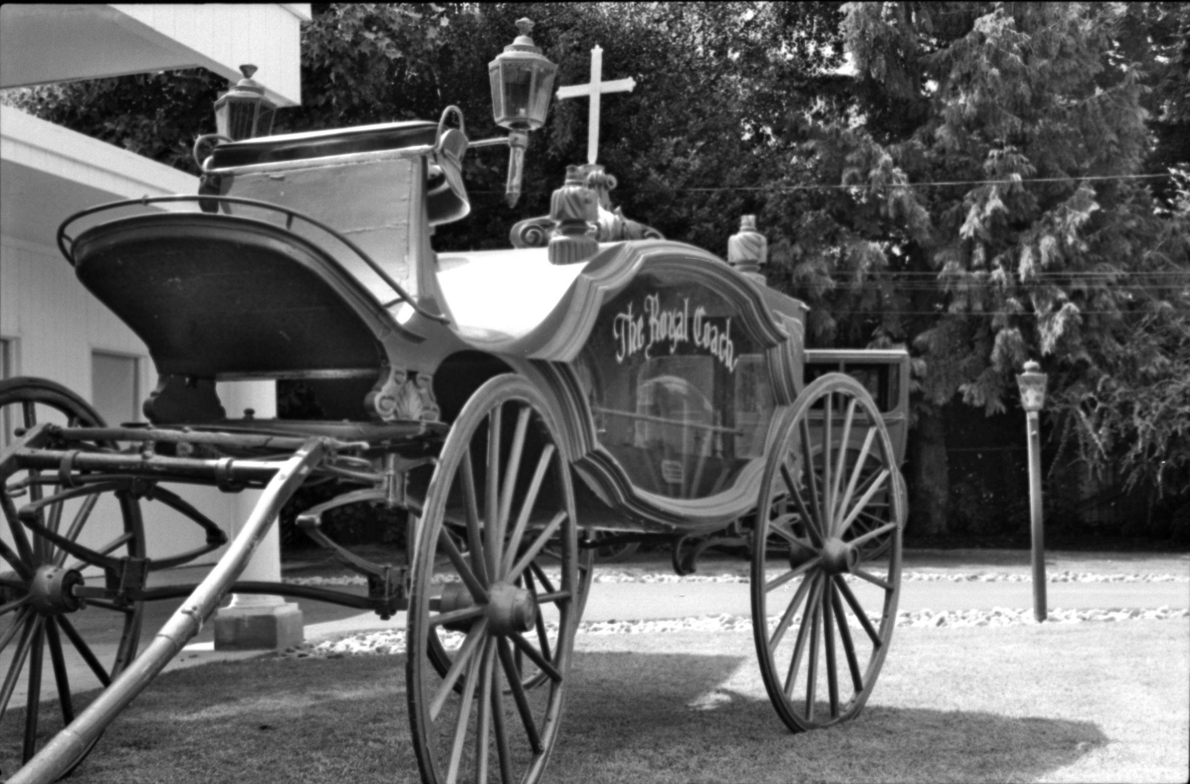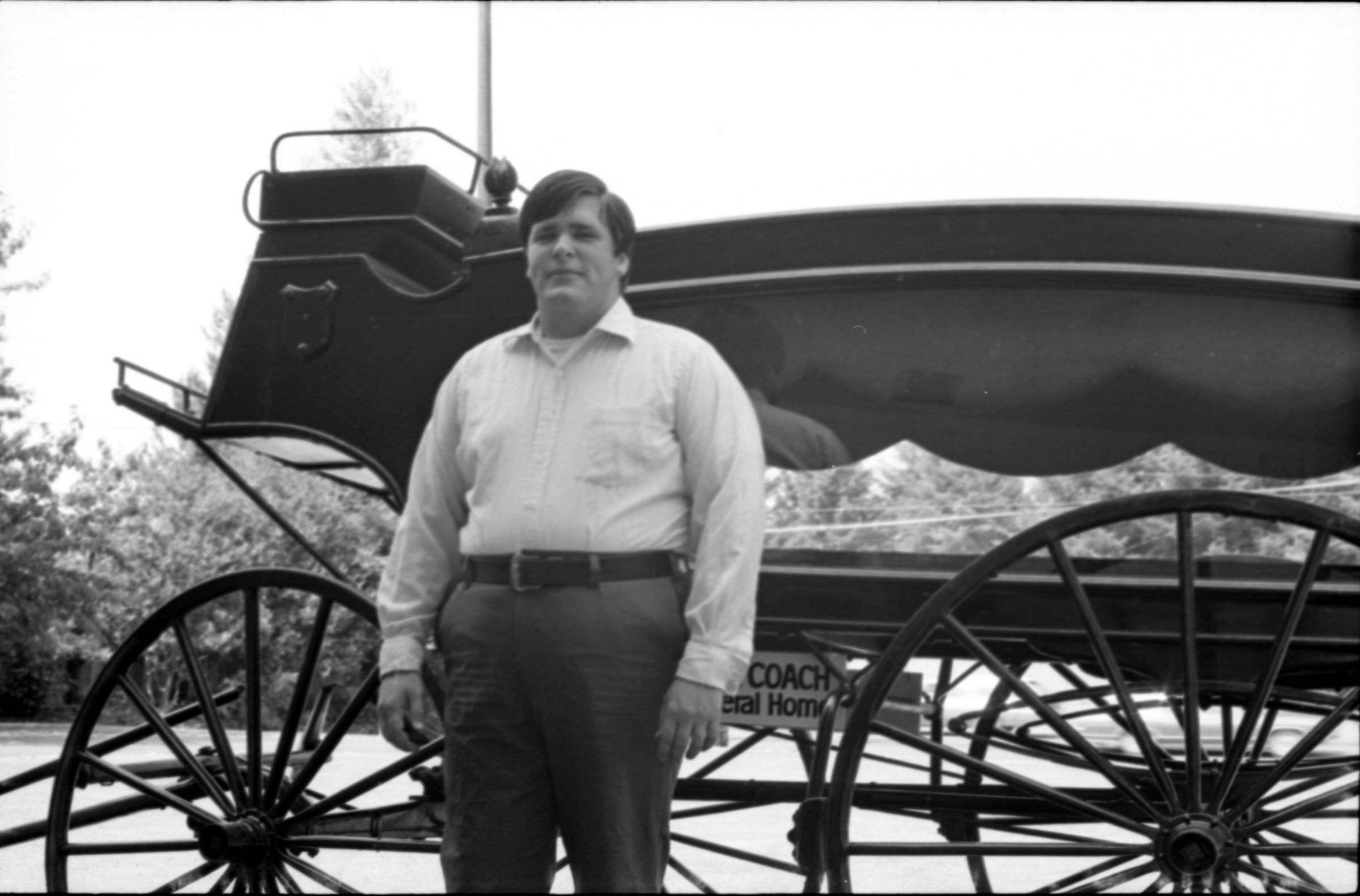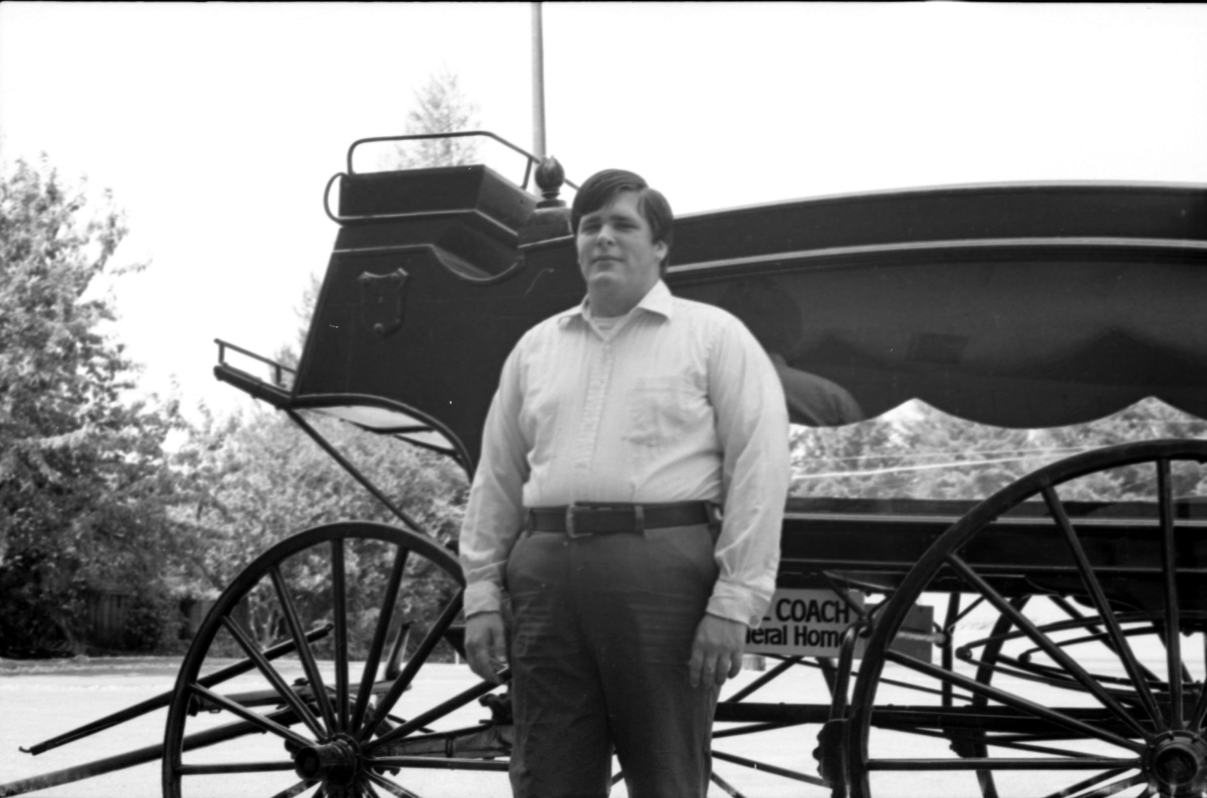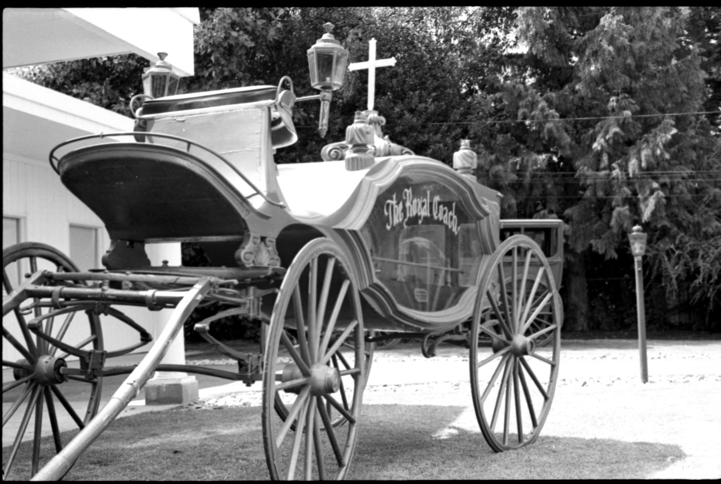 Lacey Funeral Home Open House, 1973. These two black and white film negative strips were created for the Lacey Leader newspaper. These images show a set of late-19th century embalming tools and two men posing next to two or three different horse-drawn carriages.Made/Created
