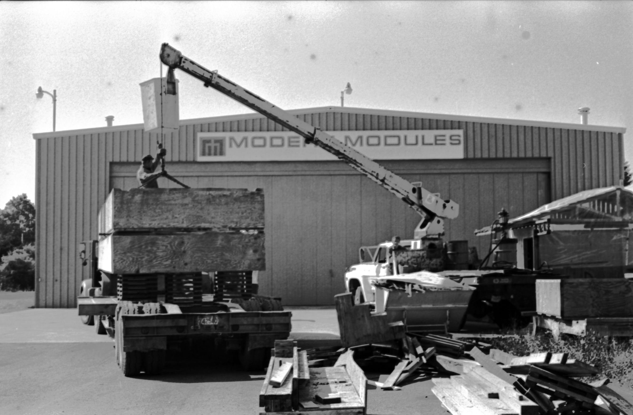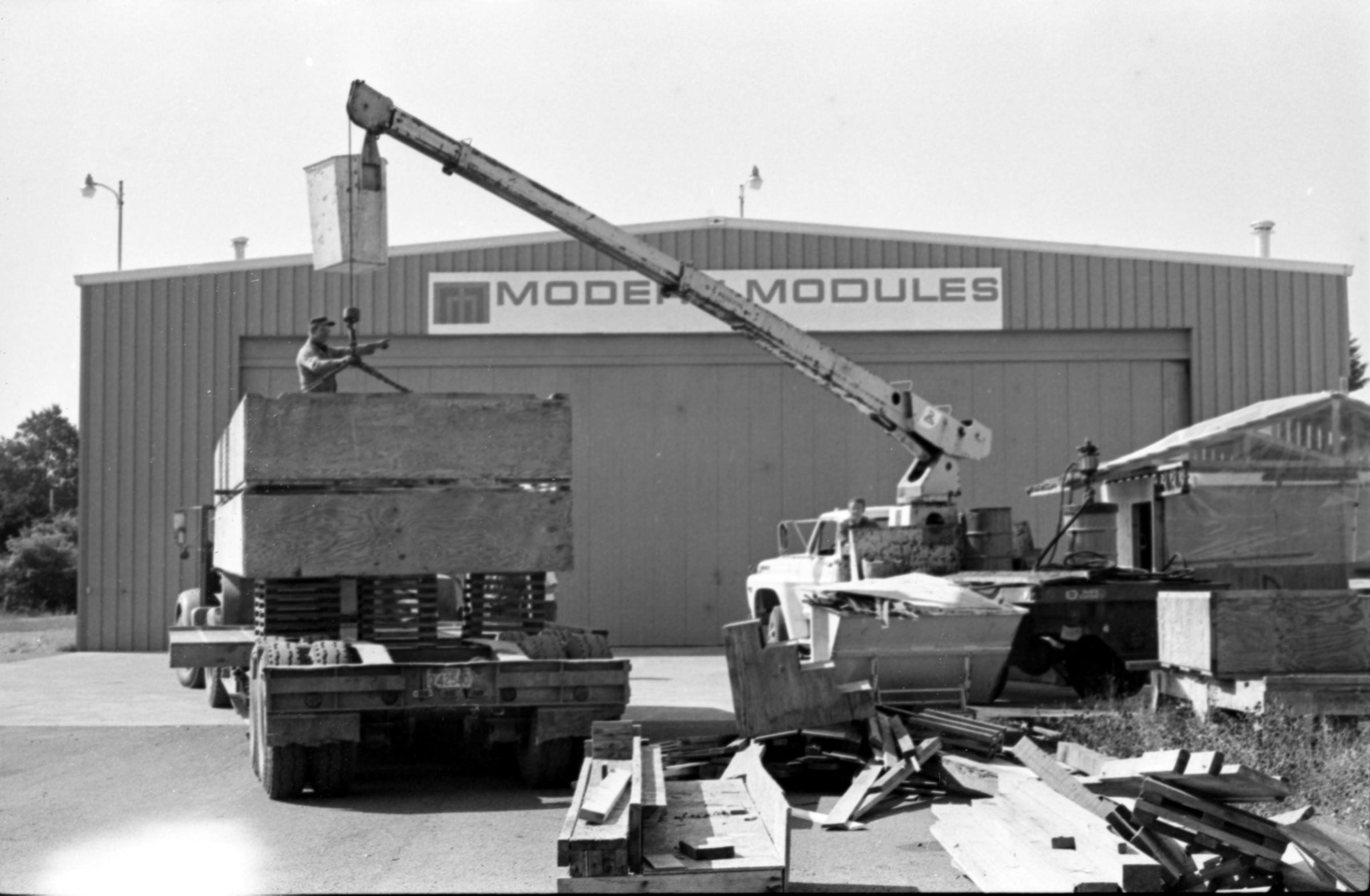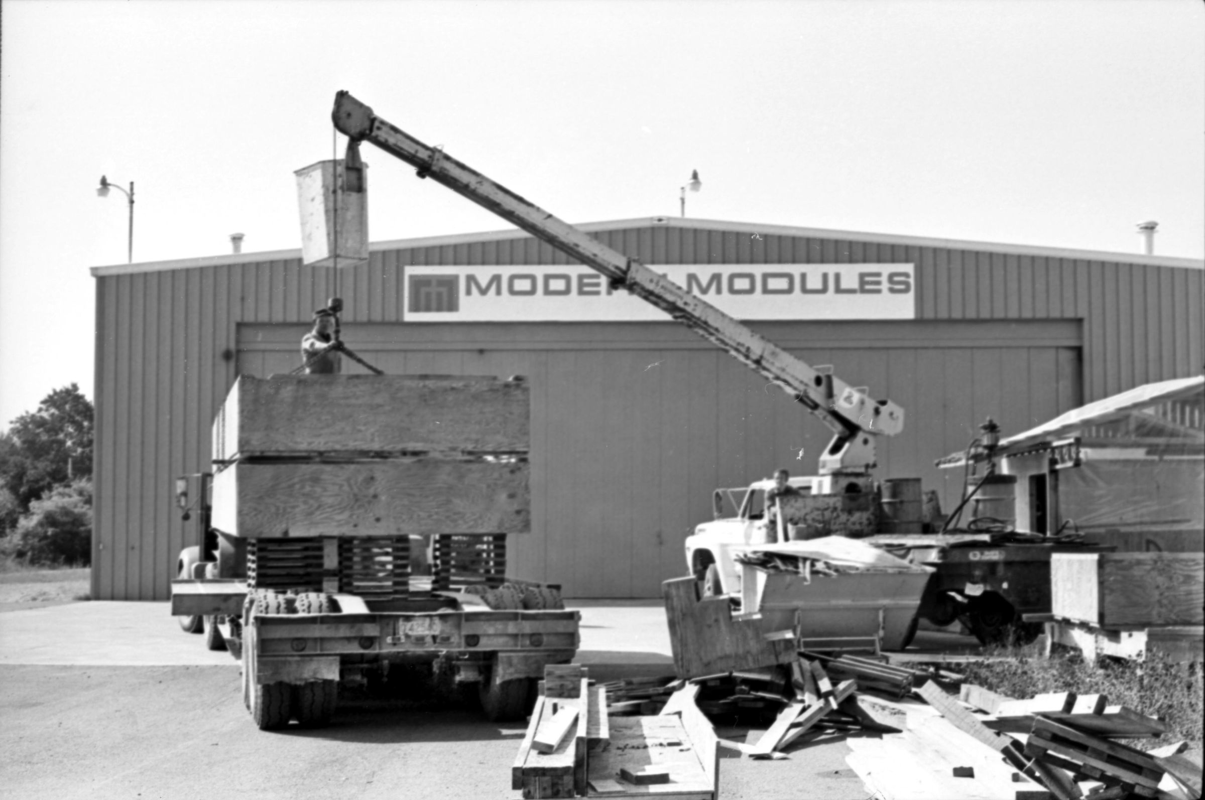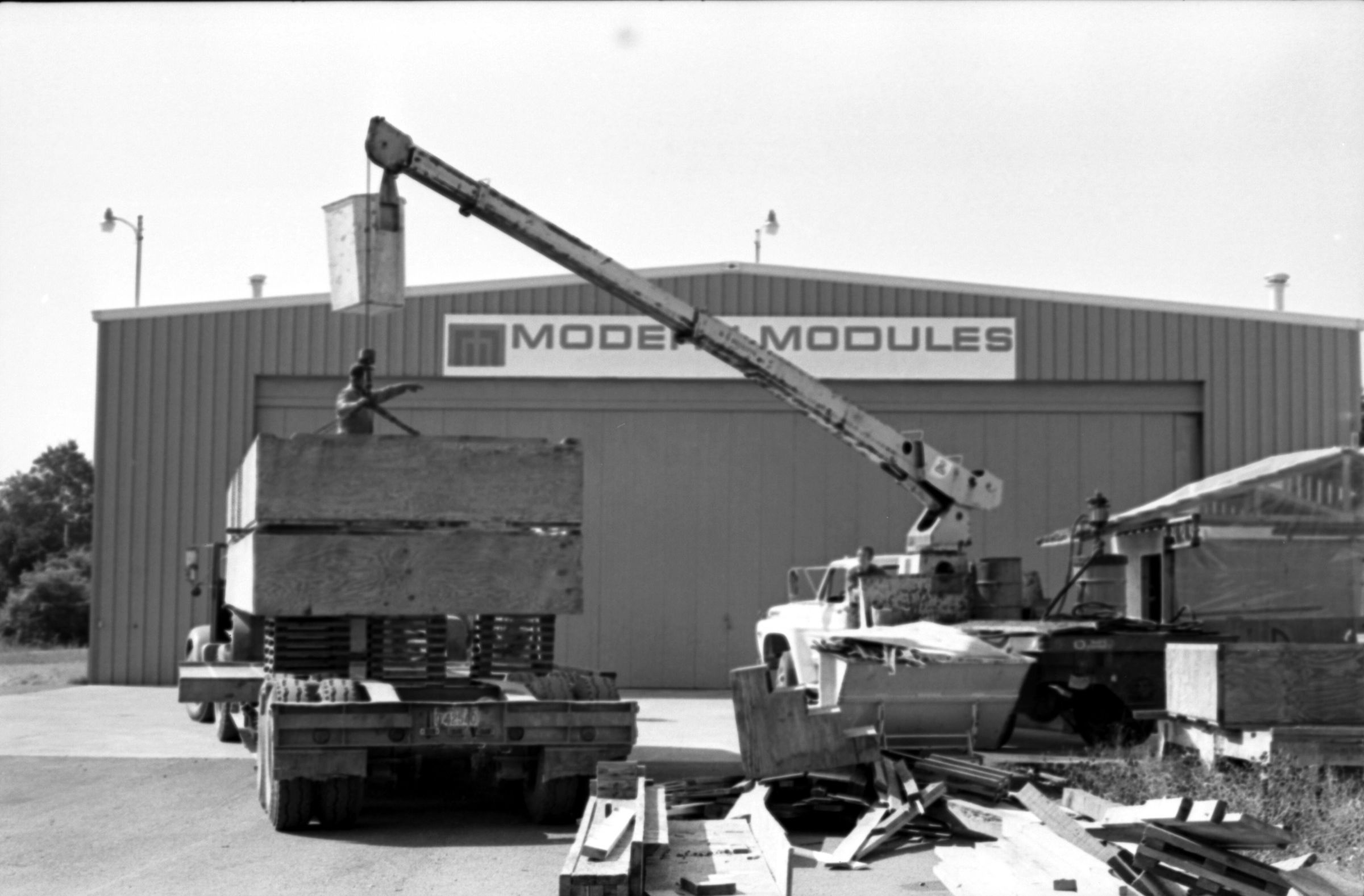 Modern Modules, 1973. These two black and white film negative strips were created for the Lacey Leader newspaper. These images show a crane either picking up or setting down a very large wooden box onto the bed of a semi truck. In the background is a large corrugated metal building with a sign reading "MODERN MODULES" near the top. Two of the images also show three men posing in front of the scene described above.Made/Created