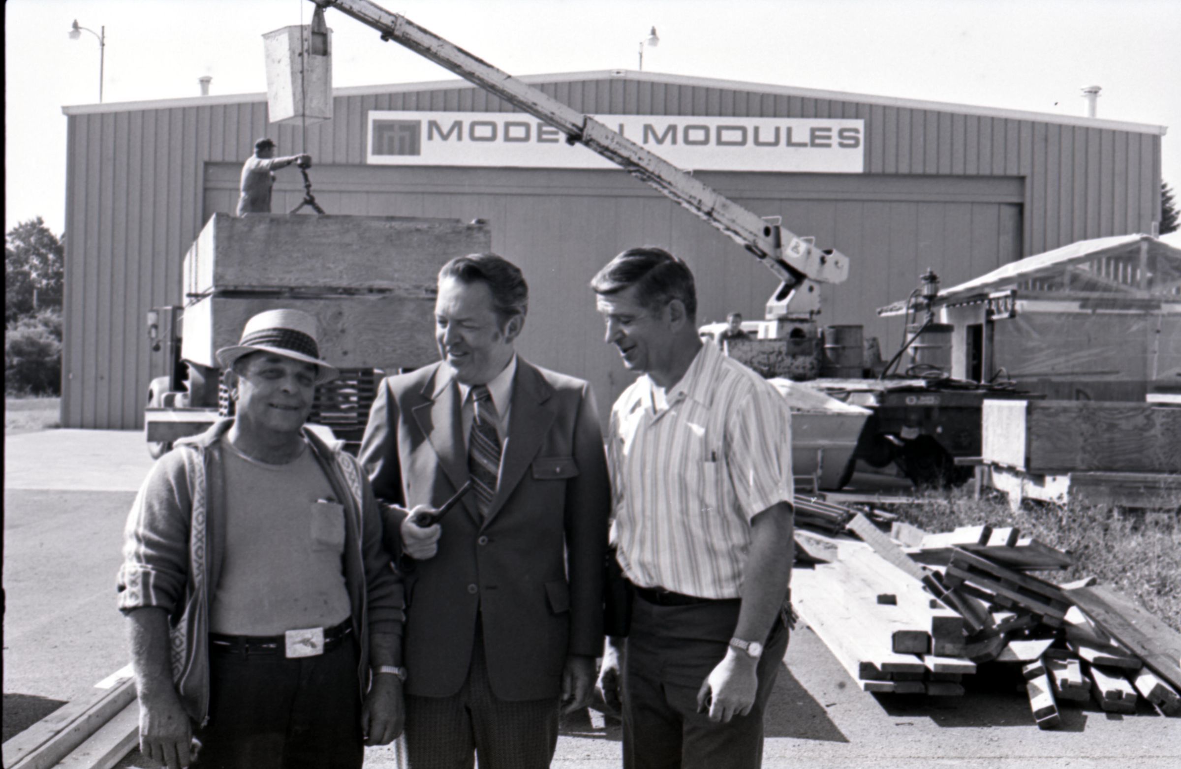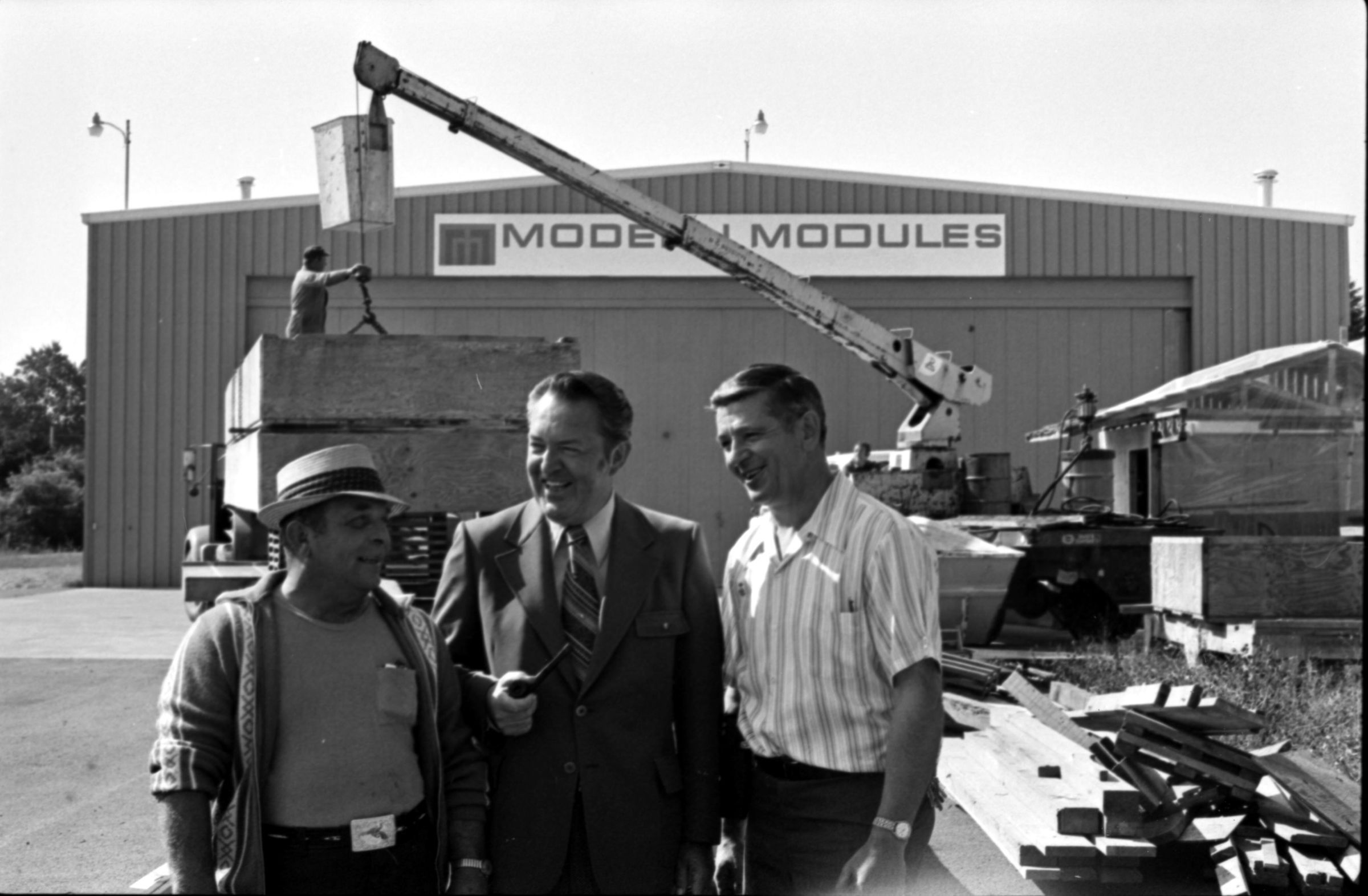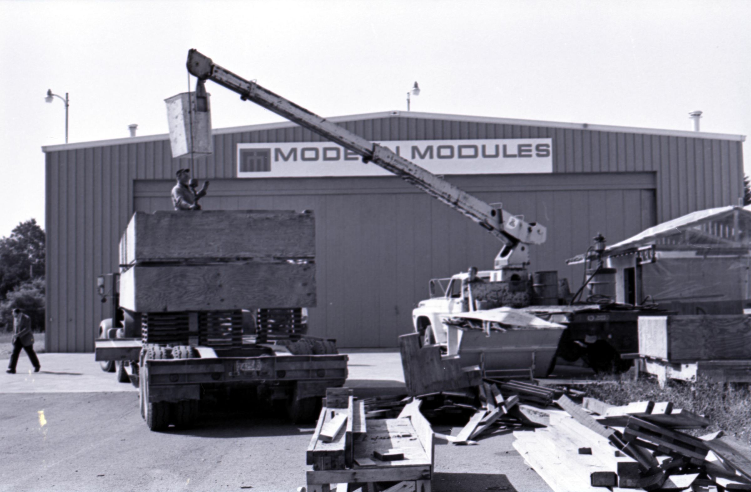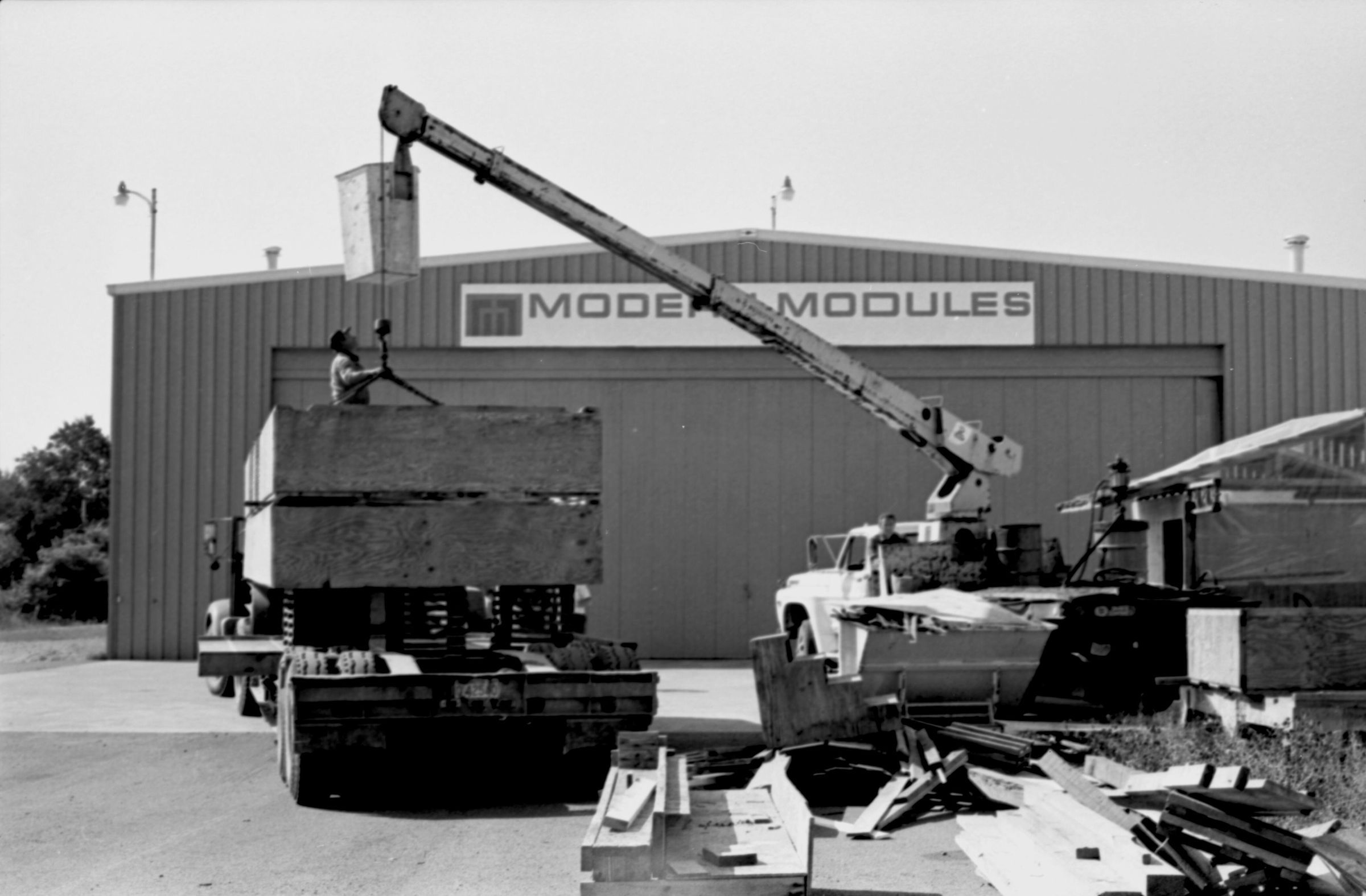 Modern Modules, 1973. These two black and white film negative strips were created for the Lacey Leader newspaper. These images show a crane either picking up or setting down a very large wooden box onto the bed of a semi truck. In the background is a large corrugated metal building with a sign reading "MODERN MODULES" near the top. Two of the images also show three men posing in front of the scene described above.Made/Created