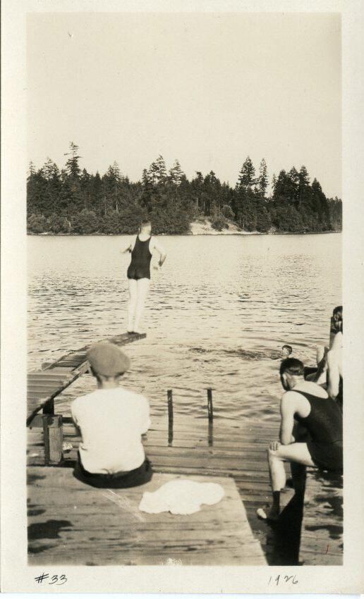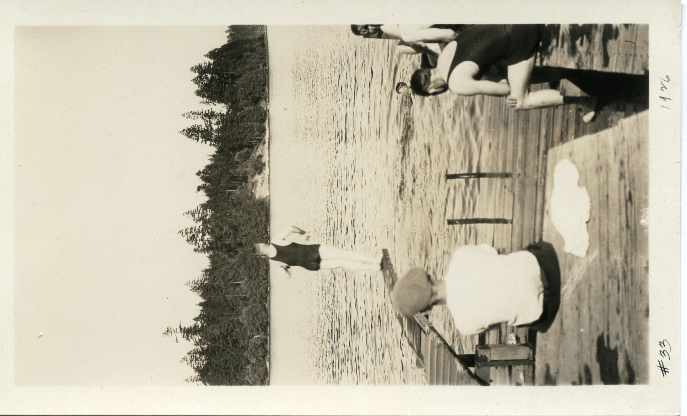 Black and white photo of bathers at Hicks Lake. In the foreground is a platform with a man sitting on it with his back to the camera. At the right side are several people in bathing gear. At the left is a spring board with a woman in a bathing suit standing at the end. Beyond the water are trees. There is a white border on all sides and in the bottom border is "#33" and "1926". On the back is "6954".