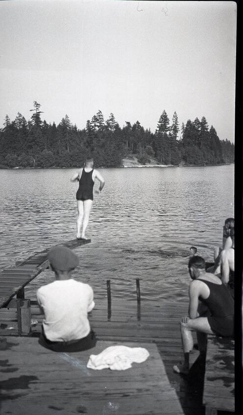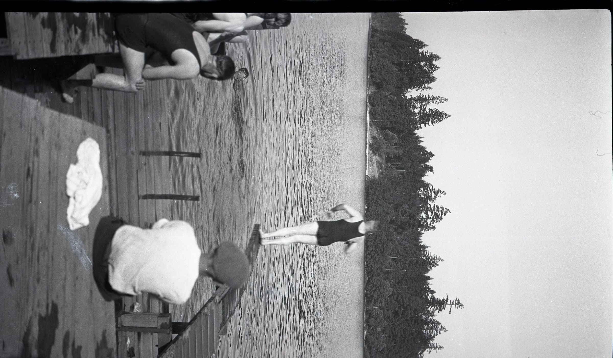Black and white negative of bathers at Hicks Lake. In the foreground is a platform with a man sitting on it with his back to the camera. At the right side are several people in bathing gear. At the left is a spring board with a woman in a bathing suit standing at the end. Beyond the water are trees.