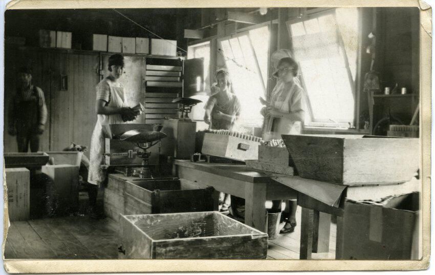 Women at Dynamite Plant, 1933 or '34. This image shows three women and one man working in one of the buildings of the J.A. Denn Powder Company in Hawks Prairie near Lacey, Washington in either 1933 or 1934. The walls and floor of the room are wood, and the wall visible at the right-hand side of the image has three large windows in it. These windows open by tipping inward with a hinge at the bottom. The two windows nearest to the camera are open. Along the wall at the rear of the image are several large wooden cabinets. The cabinet door at the far right of this row of cabinets is open, and visible inside are ten flat, wide boxes. Seven smaller cube-shaped boxes are on top of this row of cabinets. Near the center of the image is a long, short wooden table around which the three women are working. Visible on the table is a large weight scale and two boxes filled with dynamite cylinders. Two of the women are standing immediately next to this table, on the opposite side of the table as the camera. Both of these women are blurred from movement when the image was captured. The closer of these women to the camera is wearing glasses. A third woman is standing on the opposite side of the table from the other two women. She is holding five sticks of dynamite in her hands, and she is wearing a brimless hat or a headband. This woman is standing next to a large wooden box or trunk which is being used as a work surface. On top of this box is a second weight scale and a wooden box. Several other boxes are visible to the left of this woman. All three of the women are wearing aprons and are looking toward the camera. The man is standing in front of the wooden cabinets in the background of the image next to the left-hand edge of the image frame. The man is blurred, and he is wearing coveralls over a long-sleeved shirt. He appears to be wearing a hat.