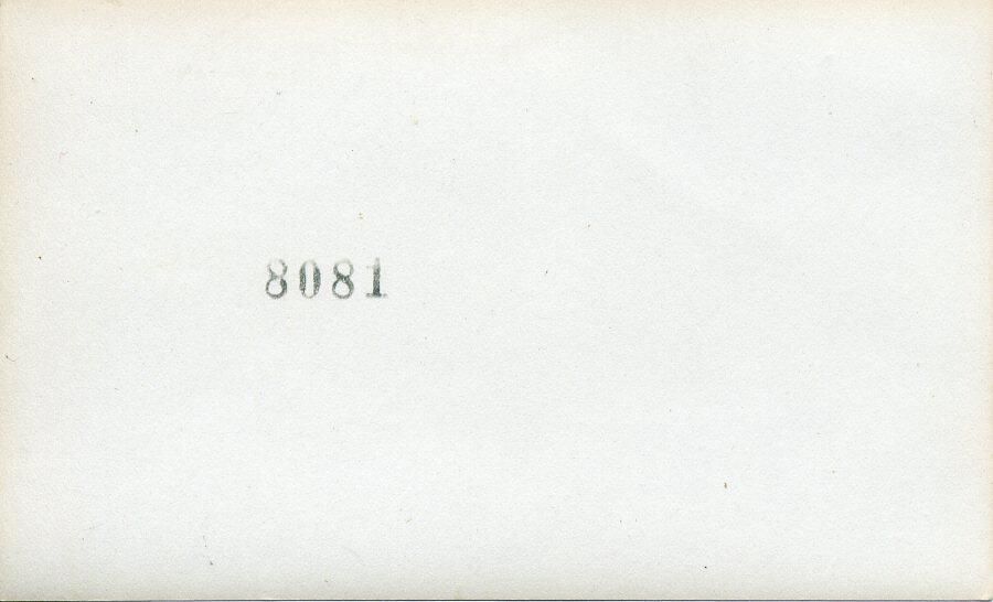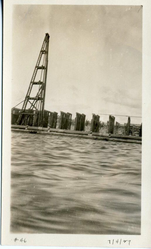 Black and white photo of a pile driver at the Port of Olympia. There is water in the foreground. Only a portion of the driver is shown. It is located behind horizontal logs and upright pilings. Most of the pilings have a cross piece at the top. There is a white border on all sides, and in the bottom border is "#46" and "7/4/27". On the back is "8081".