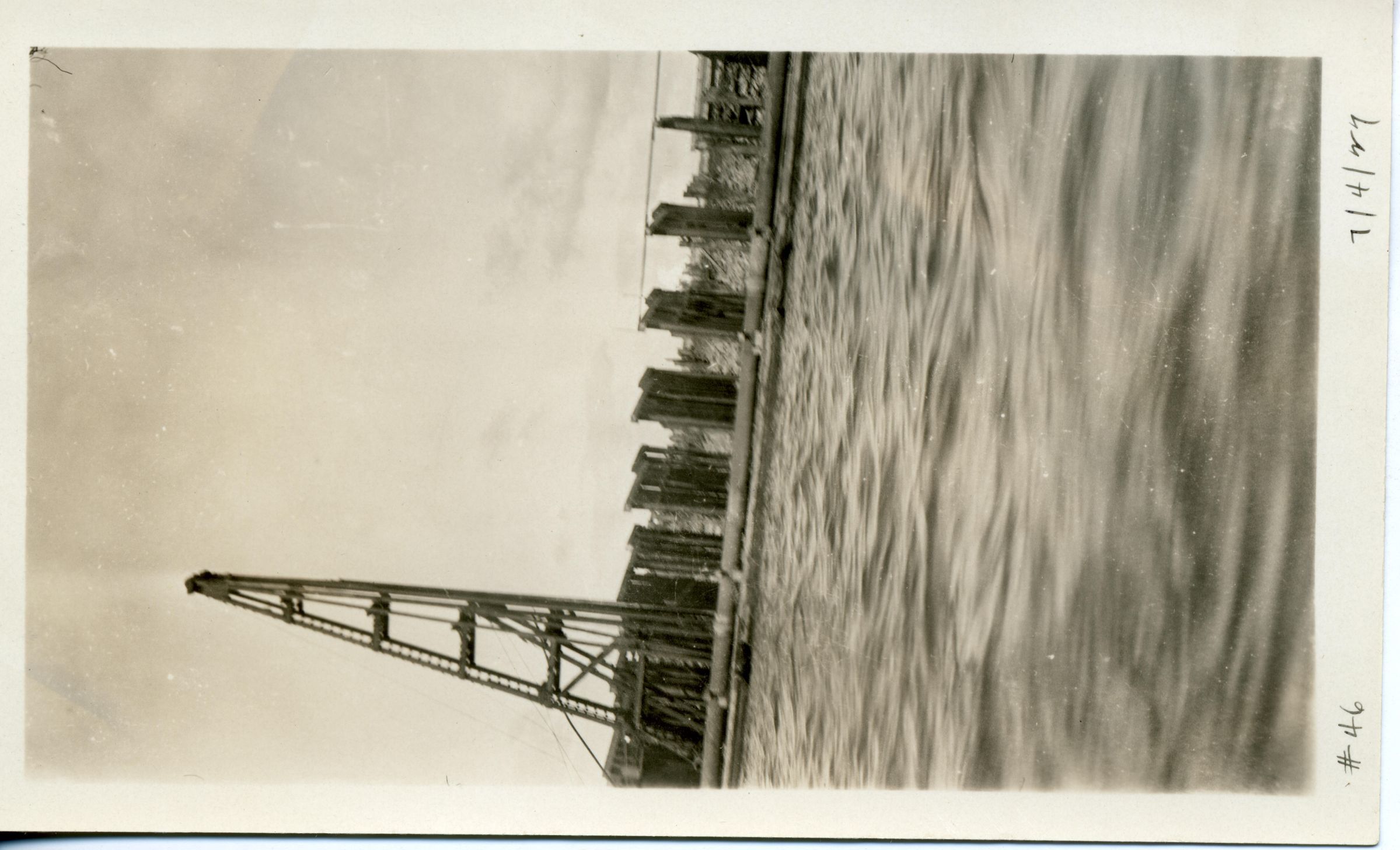 This print is inserted in a brown envelope along with a negative of the image. Typed on the envelope is "Olympia Pile Driver at Port Dock July 4, 1927". Stamped is "46" and "indexed".Made/Created