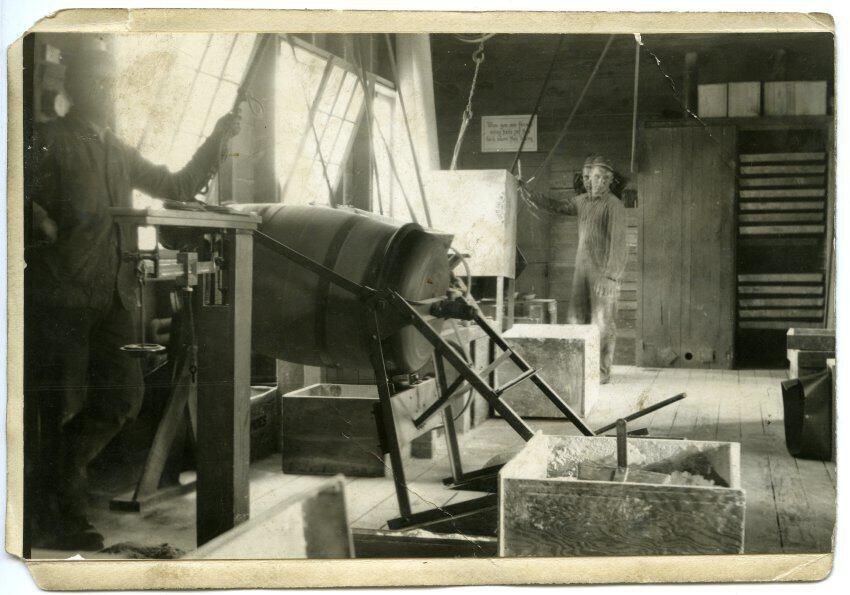 Men at Dynamite Plant, 1933 or '34. This image shows two men working in one of the buildings of the J.A. Denn Powder Company dynamite plant in Hawks Prairie near Lacey, Washington in either 1933 or 1934. The men are working in a room with wood walls and a wood floor. The wall at the left-hand side of the image has three windows in it. These windows open inward from the top, and are hinged at the bottom. The two windows nearest to the camera are open. One of the men is standing immediately at the left-hand edge of the image. His left foot is cocked backward slightly, with only the toe touching the floor. In his left hand he is grasping a rope which hangs from somewhere above the upper edge of the image. He is wearing a long-sleeved, button-up work shirt. His face is very blurred. In front of this man is an approximately four foot tall weight scale. To the right of and partially behind this scale is a woodeen barrel laying on its side in a metal framework. Several wooden boxes are partially visible beyond this barrel. A wooden box with a light-colored powder in it is visible in the image foreground near the bottom-right corner of the image. A second man is visible in the background standing near a box which is supported on thin wooden legs. The top edge of the box is at eye level with the man standing next to it. This man is looking in the general direction of the camera, and his head and body are both blurred. He is wearing a v-neck sweater over a button-up, collared shirt. Visible on the wall behind this man is a sign which reads "When you are through using tools put them back where they belong." Approximately three feet to the right of this sign is a large wooden cabinet. The right-hand door of this cabinet is open, and inside are visible are twelve wide, flat boxes. Several ropes hang from the ceiling.