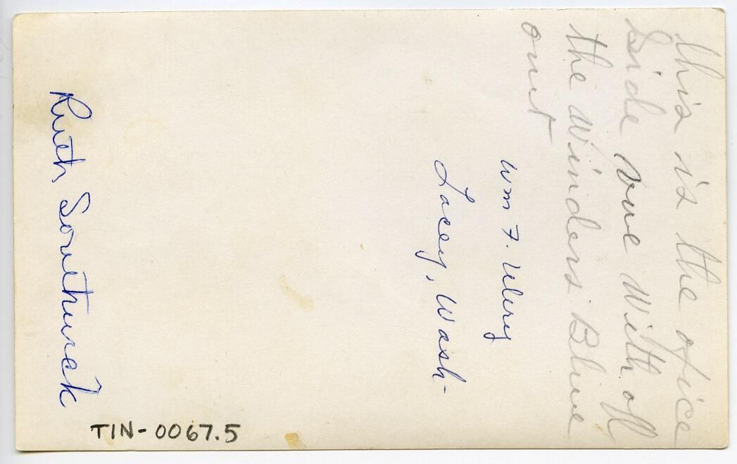 Written on the reverse side of this photograph is "this is the ofice Side vue With all the winders Blue out," "Wm F. Ulery, Lacey, Wash." and "Ruth Southwick."