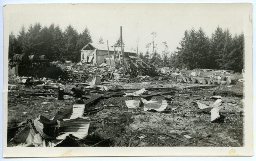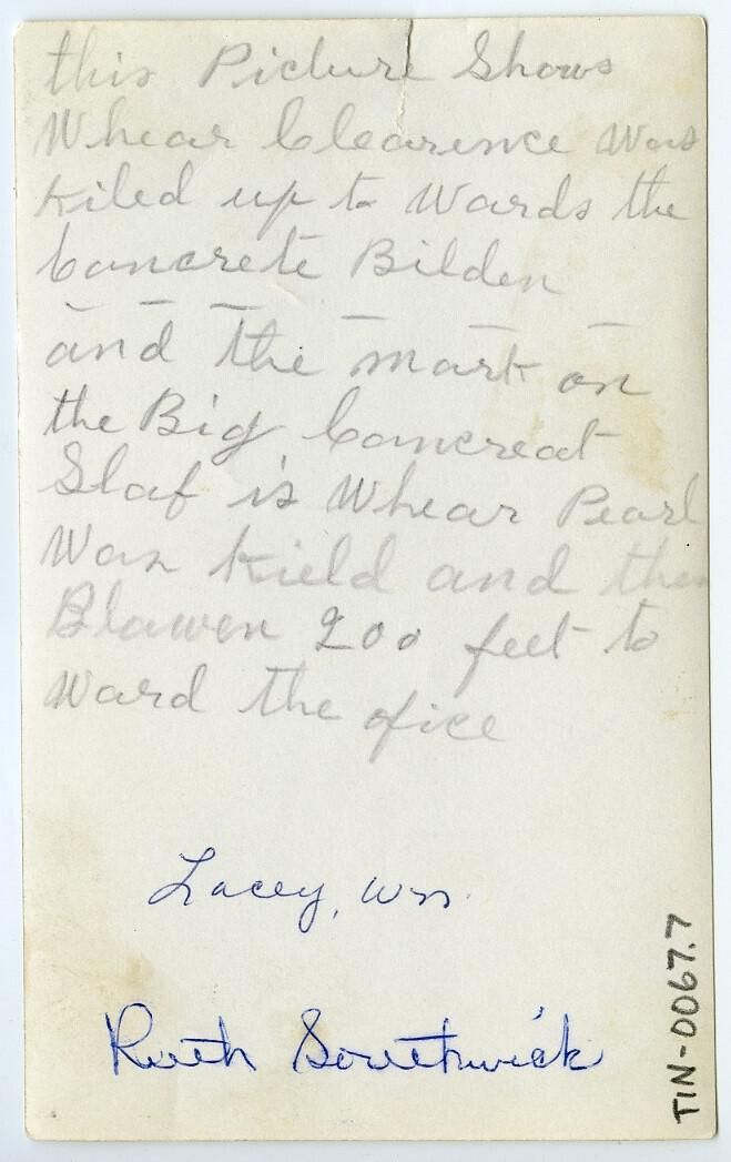 Written on the reverse side of this image is "this Picture Showd Whear Clearence Was Kiled up to Wards the Concrete Bilden." There is a dashed line between this text and some additional text, which reads " and the mark on the Big Concreat Shop is Whear Pearl Was Kield and then Blowen 200 feet to Ward the office." Additional text reads " Lacey, Wn." and "Ruth Southwick."