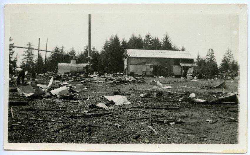 Building and Debris, 1934. This image was captured at what remained of the J.A. Denn Powder Company dynamite plant following two explosions which occurred on July 27, 1934. This image shows a large amount of wood and metal debris scattered across a large open area of ground in the foreground. This debris appears to consist mostly of wooden structural elements and corrugated sheet metal from the destroyed buildings. In the left-hand portion of the image, just above the horizontal center of the image, is a large metal vessel which appears to be cylindrical in shape. This cylinder is oriented horizontally, and a cylindrical stub comes vertically off the main body of the main vessel at its center point. It appears that a tall tree trunk, broken just above the vertical stub on the vessel, is coming out of the stub. This tree may in fact be behind the vessel and only appears to be coming out of the vessel. This "tree" could also be a bent smokestack coming out of the vessel. A metal smokestack rises vertically from the right-hand end of the vessel. To the right of this vessel is a large concrete building with a peaked roof. This is the same building visible in image TIN-0067.7. Large evergreen trees make up the background of the image.