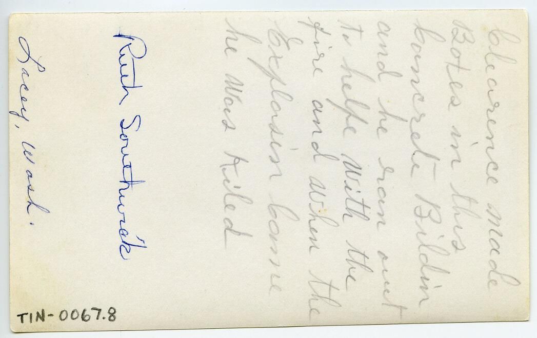 Written on the reverse side of this photograph is "Clearence made Boxes in this Concrete Bildin and he ran out to helpe With the fire and When the Explosion Come he Was Kiled." Also written on the reverse side is "Ruth Southwick" and "Lacey, Wash."