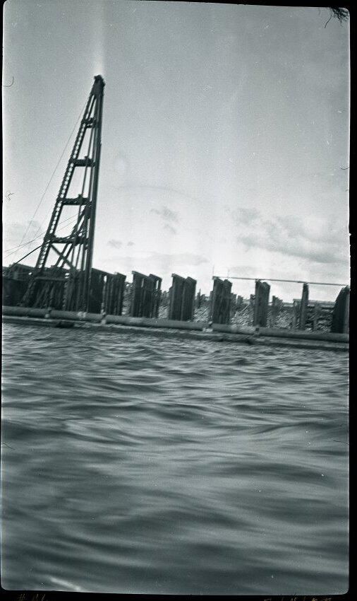 Black and white negative of a pile driver at the Port of Olympia. There is water in the foreground. Only a portion of the driver is shown. It is located behind horizontal logs and upright pilings. Most of the pilings have a cross piece at the top. There is a white border on all sides and in the bottom border is "#46" and "7/4/27."