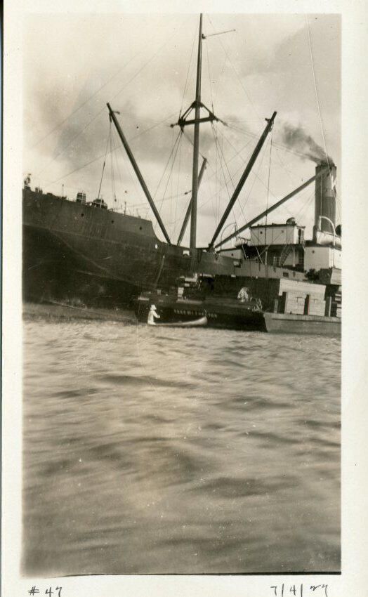 Black and white photo at the Port of Olympia. There is water in the foreground, and then there is a barge along side of a freighter. The barge is loaded with material that appears to be lumber. On the ship are booms and a mast, along with deck structure and a smoke stack with smoke. There is a white border on all sides, and in the bottom border is "#47" and "7/4/27". On the back is "8081".