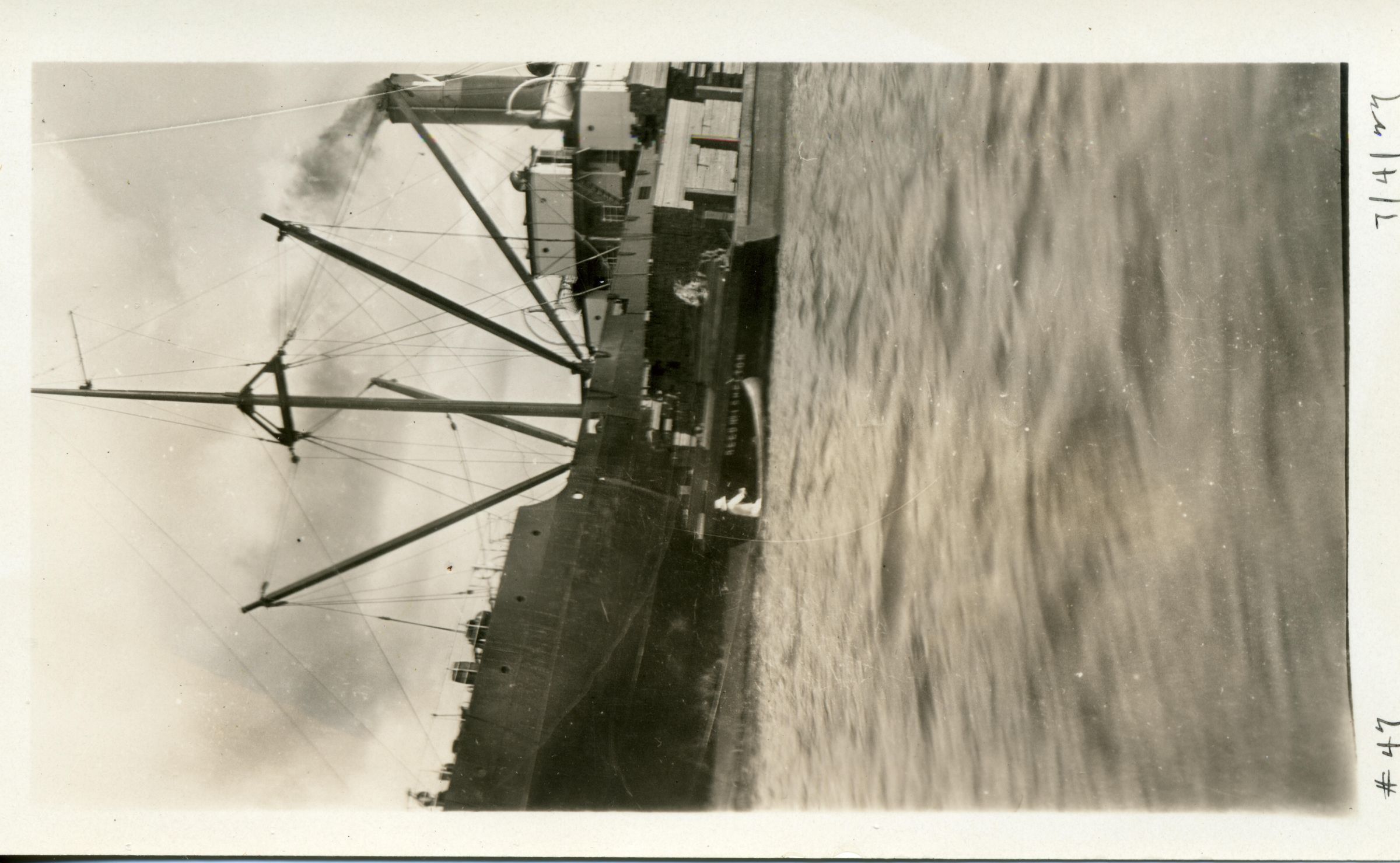 This print is inserted in a brown envelope along with a negative of the image. On the envelope is typed "Olympia July 4, 1927 Looking overside at Port Dock". Stamped is "47" and "indexed".Made/Created