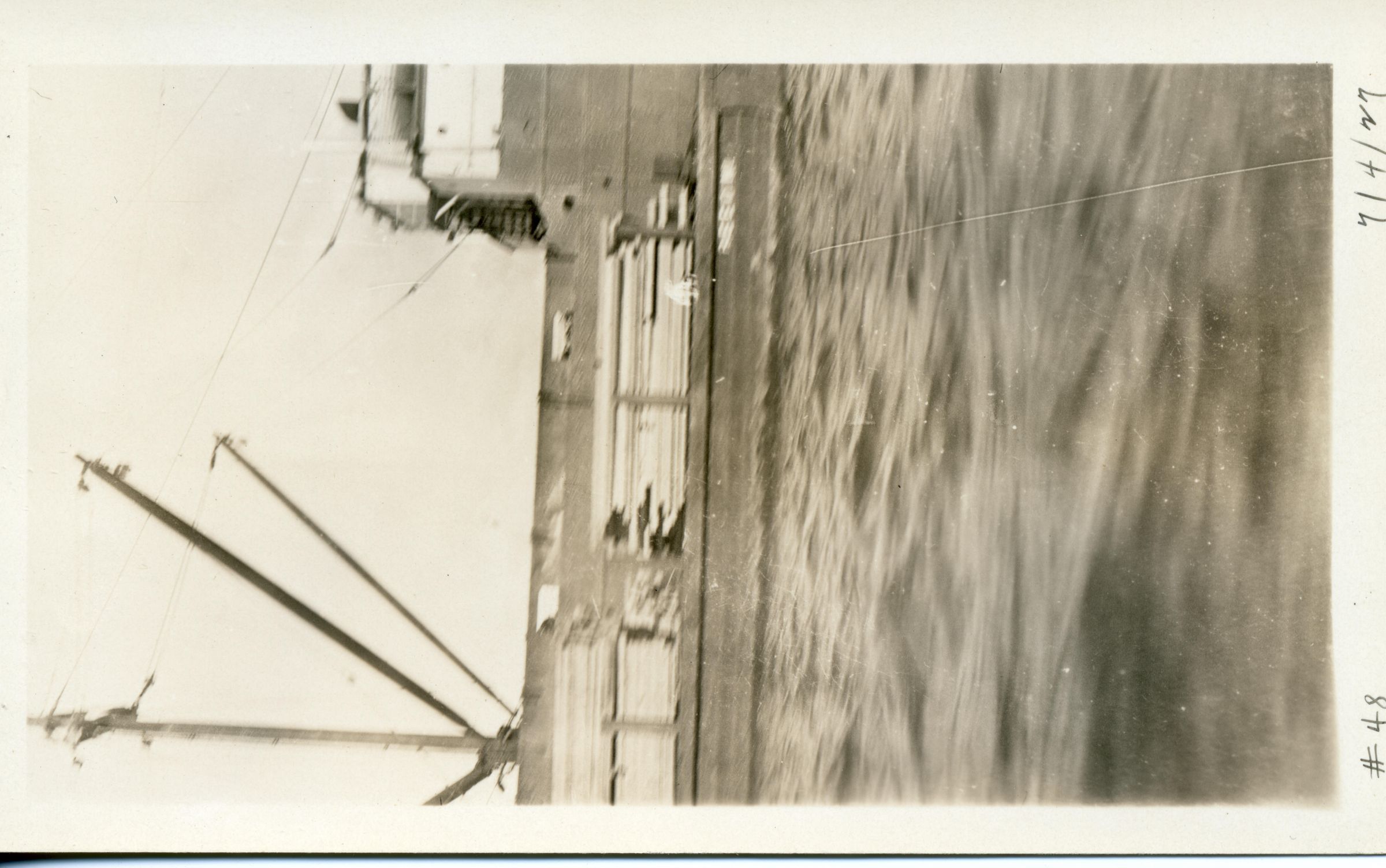 This print is inserted into a brown envelope along with a negative of the image. Typed on the envelope is "Olympia July 4, 1927 Barge alongside freighter at Port Dock". Stamped is "48" and "indexed".Made/Created
