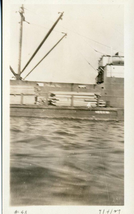 Black and white photo of shipping at the Port of Olympia. There is water in the foreground, and then a barge next to a freighter. On the barge is a stack of lumber. On the ship is visible booms and a mast along with deck structure. There is a white border on all sides, and in the bottom border is "#48" and "7/4/27". On the back is "8081".