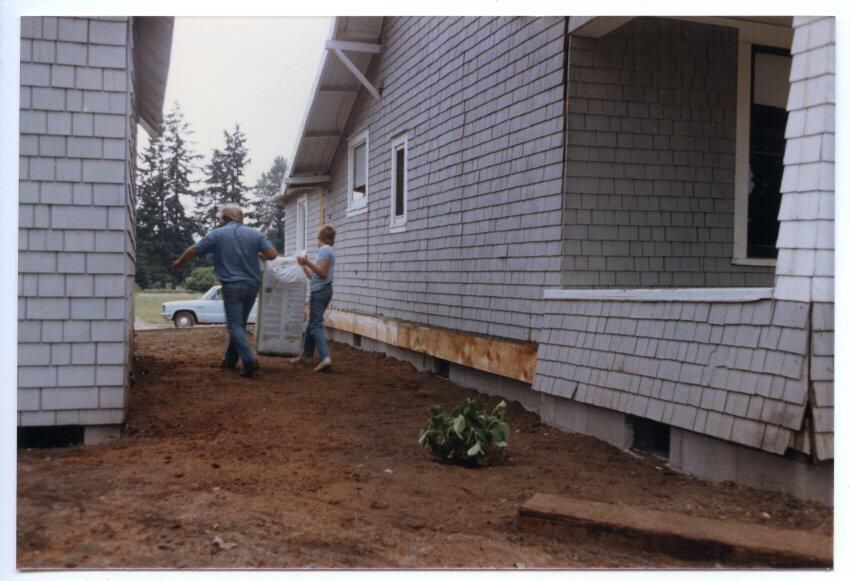 Gallagher House, c. 1986. This color photograph shows a man and a boy carrying a large white bag of what appears to be potting soil through the area between the Gallagher House and the shed immediately to the west of the house. The man is on the left, and he is wearing a blue button-up shirt with the sleeves rolled up past the elbow and blue jeans. The boy is on the right, and he is wearing a light blue or gray t-shirt and blue jeans. The man and the boy are walking away from the camera. The ground between the house and the shed is freshly-turned earth. There is a small plant which appears to be a rhododendron planted approximately two feet from the side of the house's front porch. A railroad tie is laying on the ground in the lower-right corner of the photo. A light blue pickup truck is visible in the background, and it is partially obscured behind the man and the bag of potting soil.