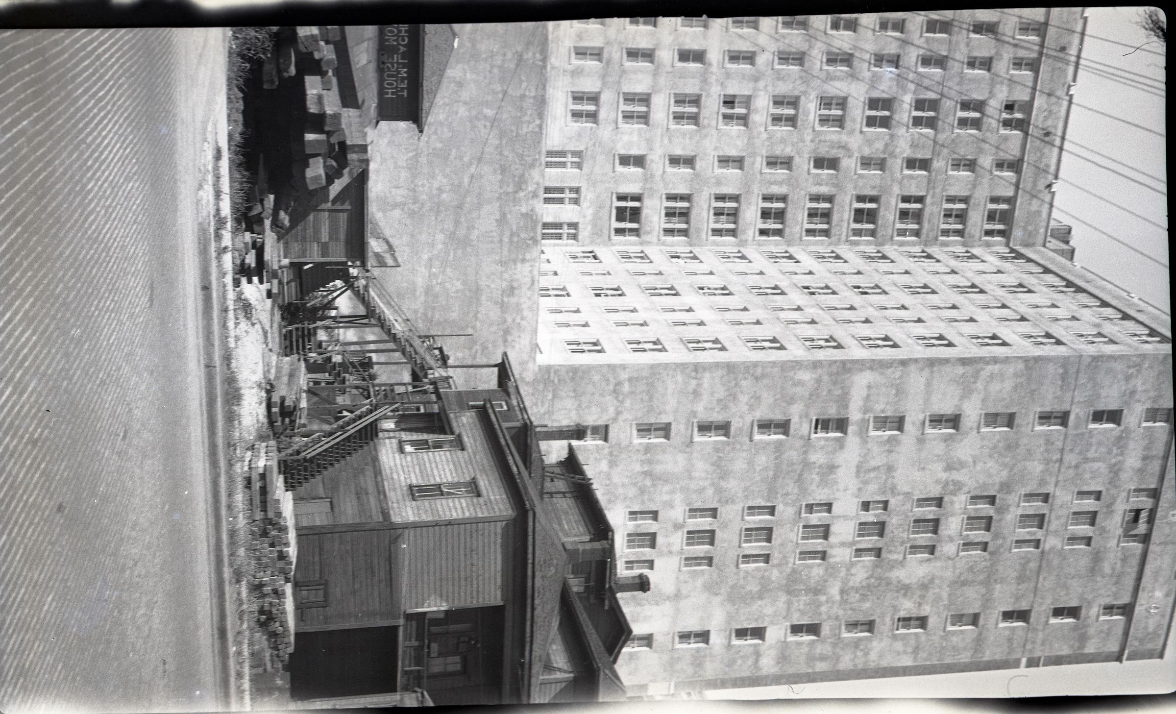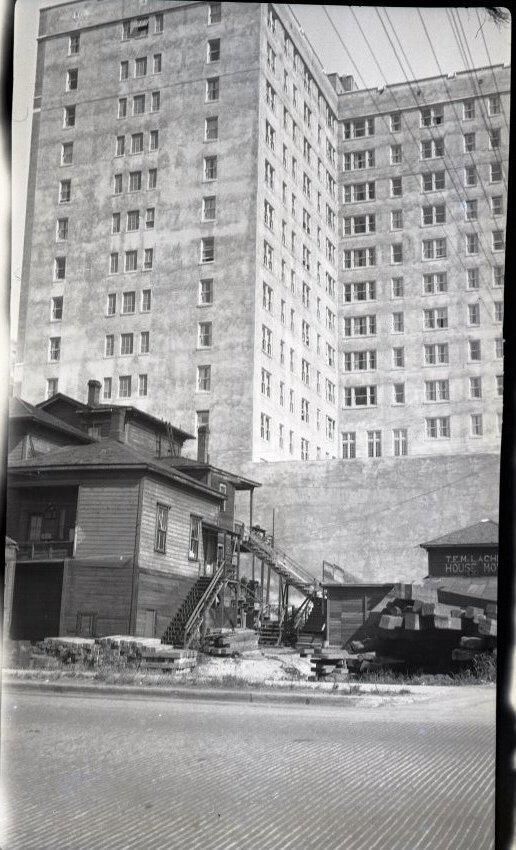 Black and white negative of the Exeter Hotel. A street is in the foreground, apparently paved with bricks. Beyond that is a house on the left that has two and a half stories and multiple stairways. At the right are other structures of unknown nature. Behind all that is the hotel. It is made of white masonry and is L-shaped with one leg angled to the left of the camera and the other extending to the right. The building has ten stories visible with more behind the houses in the foreground. There are multiple windows on each floor. There is a white border on all sides, and in the bottom border is "#77" and "1928".