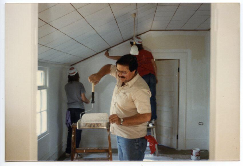 Painters at Gallagher House, c. 1986. This color photograph shows three men painting an interior room of the Gallagher House. The man nearest to the camera has dark hair and a mustache, and is wearing glasses. He is wearing an off-white short-sleeved button-up shirt and blue jeans. A red handkerchief is hanging out of the back pocket of his jeans. He is dipping a paint roller into a paint tray which is sitting on top of a short ladder. He is looking down at the paint tray and appears to be smiling. The two other men are at the far side of the room painting the wall. The man on the left is standing on the floor and the one on the right is standing on a step stool. Both are facing away from the camera. Both have shoulder-length brown hair and are wearing white and red caps and blue jeans. The man on the left is wearing a gray t-shirt and the man on the right is wearing a red t-shirt. A doorway is visible at the far end of the room, and a window is partially visible at the left-hand edge of the image. The walls are painted white and the ceiling is white acoustic tile.
