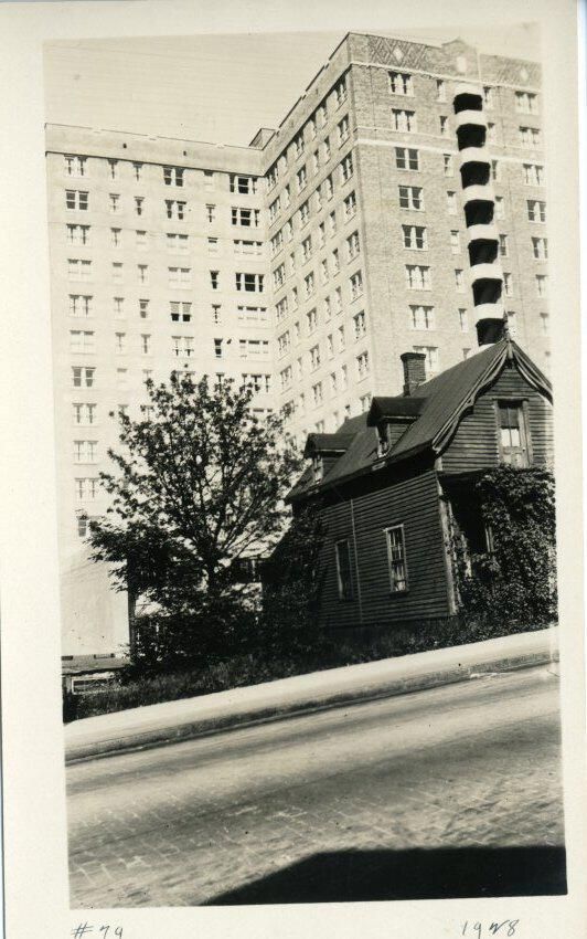 Black and white photo of the Exeter Hotel. In the foreground is a brick street that rises to the right. Behind the street is a one and a half story house with dormer windows on the roof. Vines are at the front of the house and a tree is beside it. In the background is the hotel. It is a white, multi-story building with windows on each floor and balconies on the right side. There is a white border on all sides and in the bottom border is "#79" and "1928". On the back is "1982".