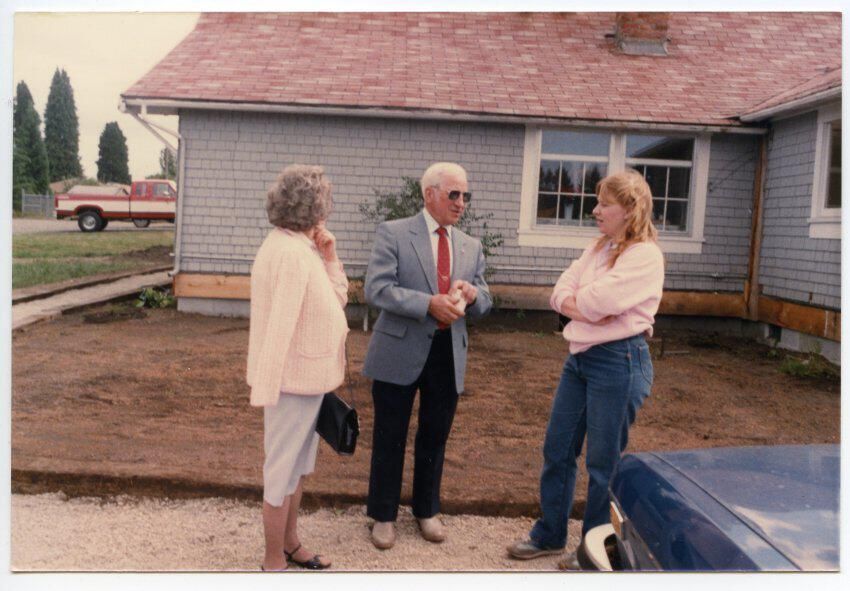 Discussion Outside Gallagher House, c. 1986. This color photograph shows a man and two women standing behind the Gallagher House. The man is speaking to the woman on the right and the woman on the left is looking toward the house and touching her right earring with her left hand. The woman at left is wearing a pink cardigan and a light purple sskirt. Her hair is gray, curled, and nearly shoulder length. She is facing away from the camera, but her body is oriented toward the right-hand side of the image. She is holding a black purse. The man has white hair and sideburns. He is wearing sunglasses, a red tie, white dress shirt, gray blazer and navy blue or black slacks. The woman on the right is wearing a pink sweatshirt and blue jeans. The front, driver's side corner of a dark blue car or truck is occupying the bottom-right corner of this photo. A red and white pickup truck is partially visible near the left-hand edge of the image frame. The front portion of this truck is obscured behind the house.