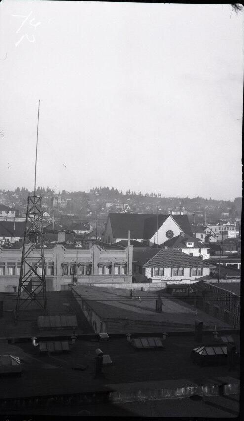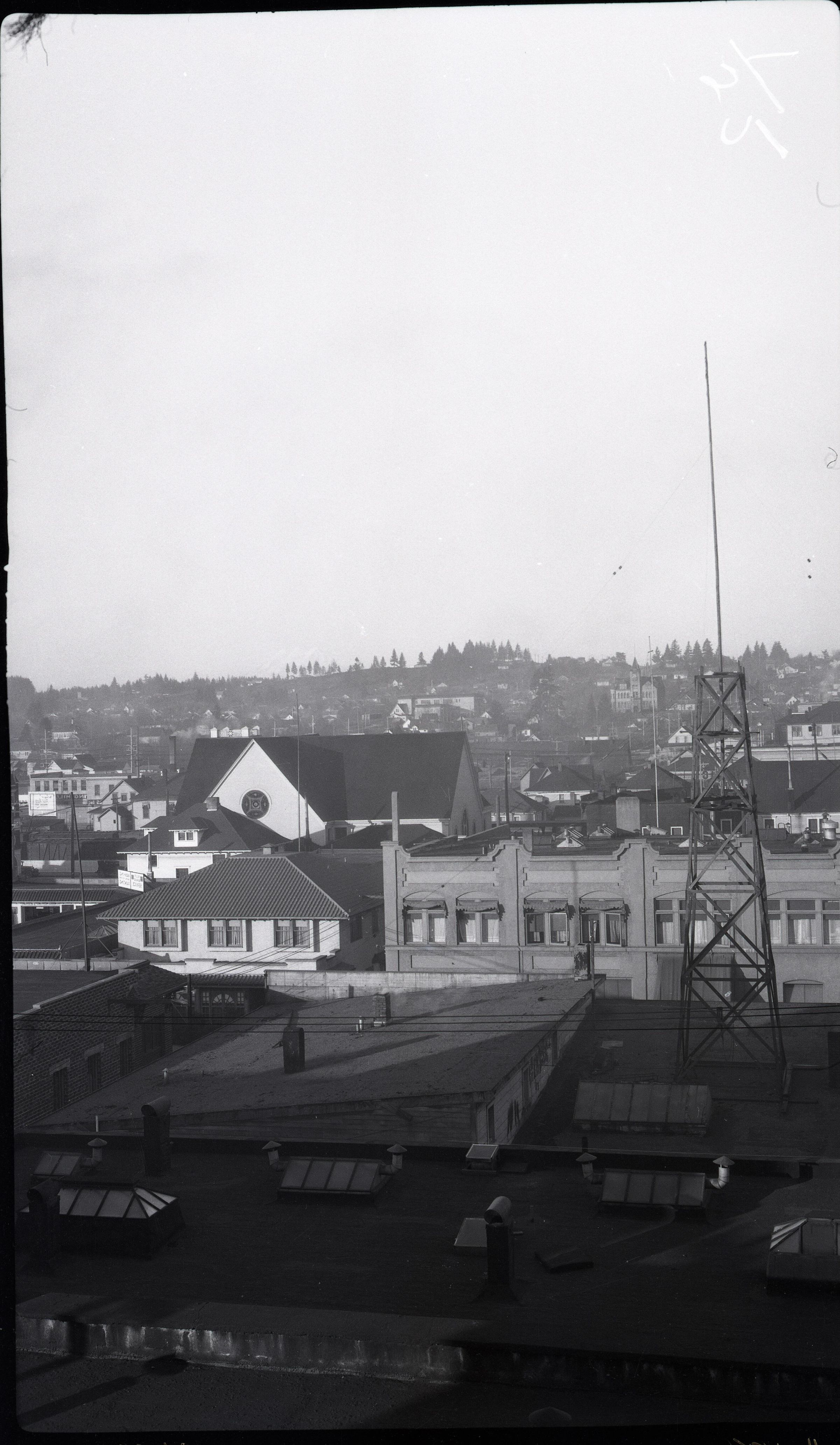 Black and white negative of a portion of downtown Olympia. The image was taken from a room in the Security Building. In the foreground is the roof of a business building. That portion of the print is dark, but skylights, vents, and other objects are detectable. On the roof at left is a tower similar to an oil rig, with a pole extending further up. Beyond all that is the side of a building with windows and above it is a roof with various objects. Beside that building is a church with roof and windows below and roof and gables above. In the background are distant trees and houses. There is a white border on all sides, and in the bottom border is "#126" and "1929".