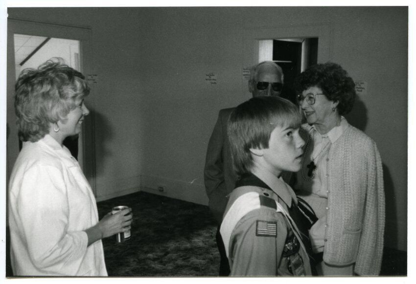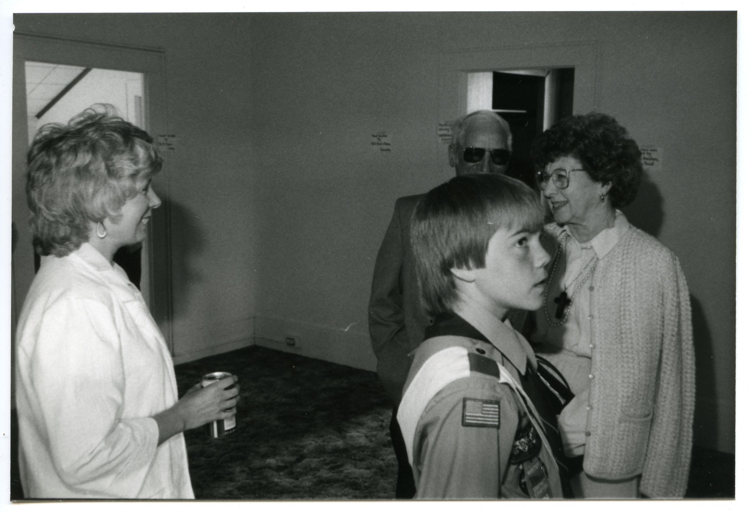 Conversation in Gallagher House, c. 1986. This black and white photograph shows two women and one man having a conversation in a room of the Gallagher House as a boy stands nearby. One woman stands near the left-hand edge of the image, facing toward the right-hand side of the image. She is shown in profile, and she is smiling. She has shoulder-length hair and is wearing a light-colored jacket or blouse. She is holding an aluminum soda can in her right hand. She is shown from the waist up. The boy is standing in the right-hand side of the image and facing the right-hand side of the image frame. He is shown in profile. He is looking toward the top-right corner of the image. He has shoulder-length hair and is wearing a Boy Scout uniform. He is shown from the mid-torso up. The man is standing on the opposite side of the boy, and he is partially obscured by the boy. Only the top half of the man's head and his right arm are visible. This man is wearing sunglasses and a blazer. The second woman is standing to the right of the man, and is also partially obscured by the boy. This woman has curly hair and is wearing glasses, a knit cardigan over her shoulders, a blouse and a cross necklace. She is shown from the mid-thigh up. She is looking at the other woman and smiling. These people are standing in a room with light-colored walls and a mottled shag carpet. There is a doorway in the wall to the left and one in the wall to the right. Four small signs are visible hanging on the wall.