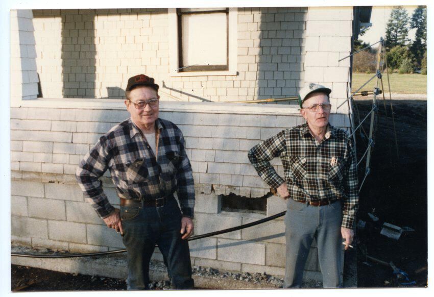 Two Men Outside Gallagher House, c. 1986. This color photograph shows two older men standing in front of the right-hand side of the front porch of the Gallagher House. The man on the left is wearing a black and red baseball cap, glasses, a gray and black plaid shirt, and dark blue jeans. The man on the right is wearing a green and white baseball cap, glasses, a gray and black plaid shirt, and blue-gray work pants. The man on the right is holding a cigaratte in his left hand. Both men have their right hand on their hip and are looking toward the camera. The man on the left is smiling. A large antenna is hanging over the side of the porch. The concrete block foundation of the house is exposed.