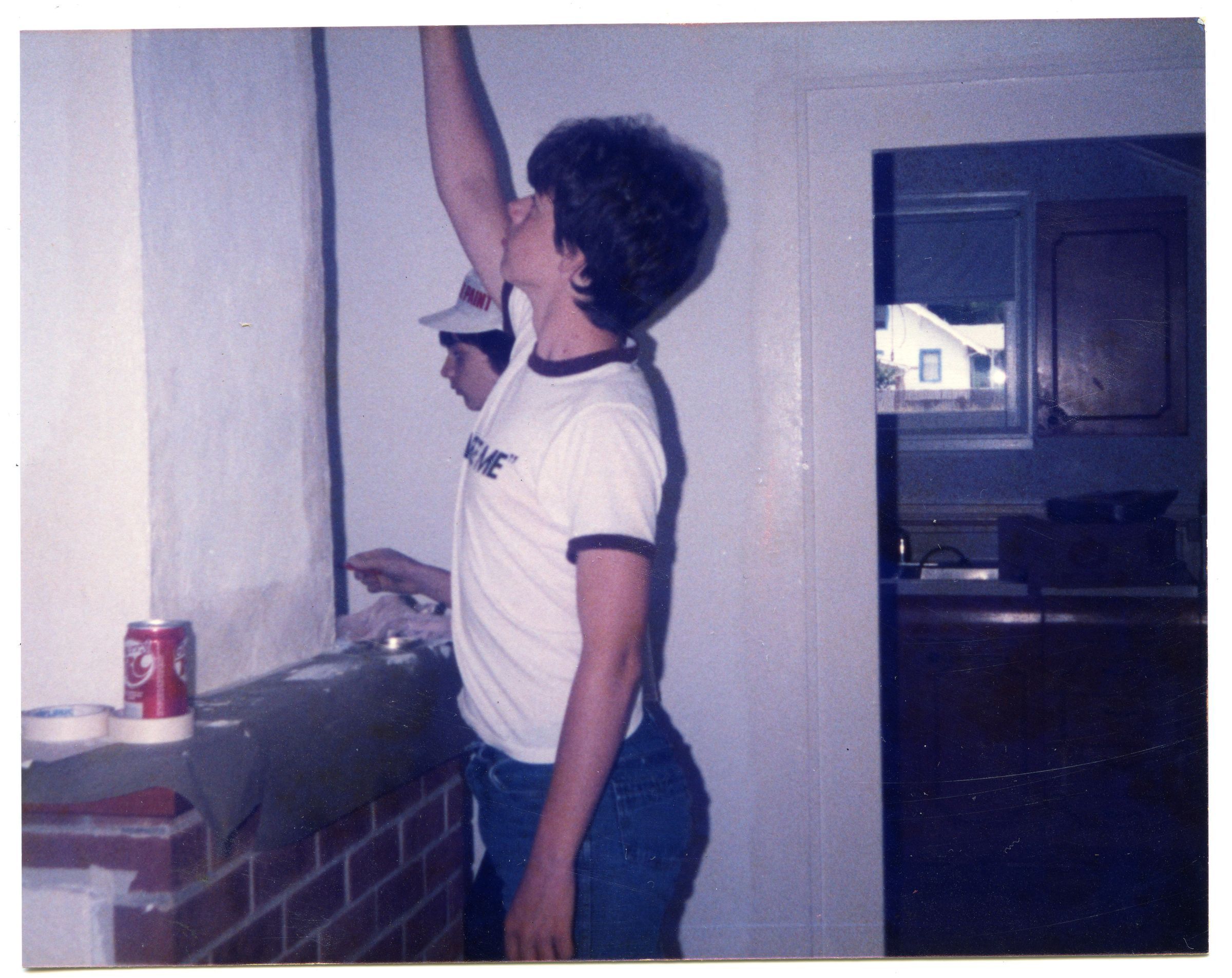 Painters at Gallagher House, c. 1986. This color photograph shows two young men (Steve Lewis and Eric Casino) painting in a room of the Gallagher House. Steve Lewis is at the center of the photo facing toward the left-hand side of the image. He is shown nearly in profile. He is stretching upward with his right arm. His right hand is outside the top edge of the image frame. He has dark, curly hair and is wearing a white t-shirt with maroon or brown stripes at the neck and sleeve ends, and blue jeans. Eric Casino is almost completely obscured behind Mr. Lewis. Only the left side of Mr. Casino's face and his right hand are visible in this image. Mr. Casino is wearing a white and red Parker Paint hat. Both of the young men are standing next to the fireplace in the Gallagher House. This fireplace is on the left-hand side of the image. There is a red soda can and who rolls of masking tape on the fireplace mantel. At the right-hand side of the image is an open doorway which looks into a kitchen with unpainted wood cabinets. A white house is visible through a window in the kitchen.