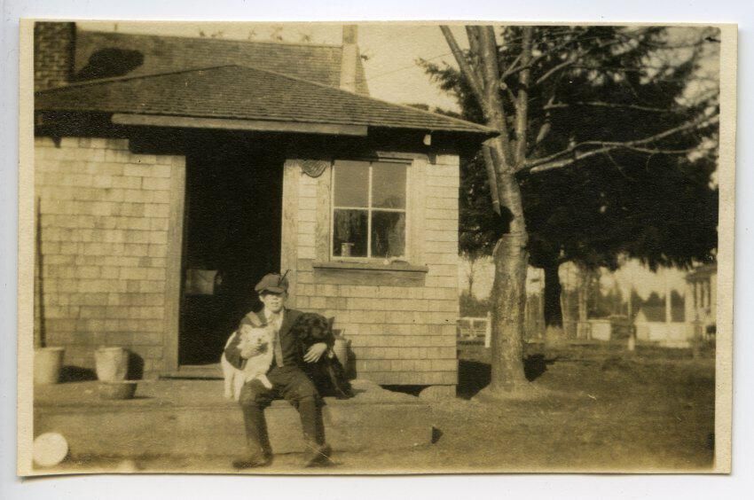 William Gallagher at Gallagher House, c. 1911. This black and white photograph shows a boy (William Gallagher) sitting on the back stoop of the Gallagher House. He has a white dog (Teddy) under his right arm and a dark-colored dog under his left arm. William is wearing a Newsboy-style cap, a jacket, a dress shirt and tie, and slacks. The back door to the home is open, and the interior of the home is dark. There is a window to the right of the open doorway. There are two metal buckets and one metal cooking pan sitting on the stoop. Several trees are growing to the right of the house.