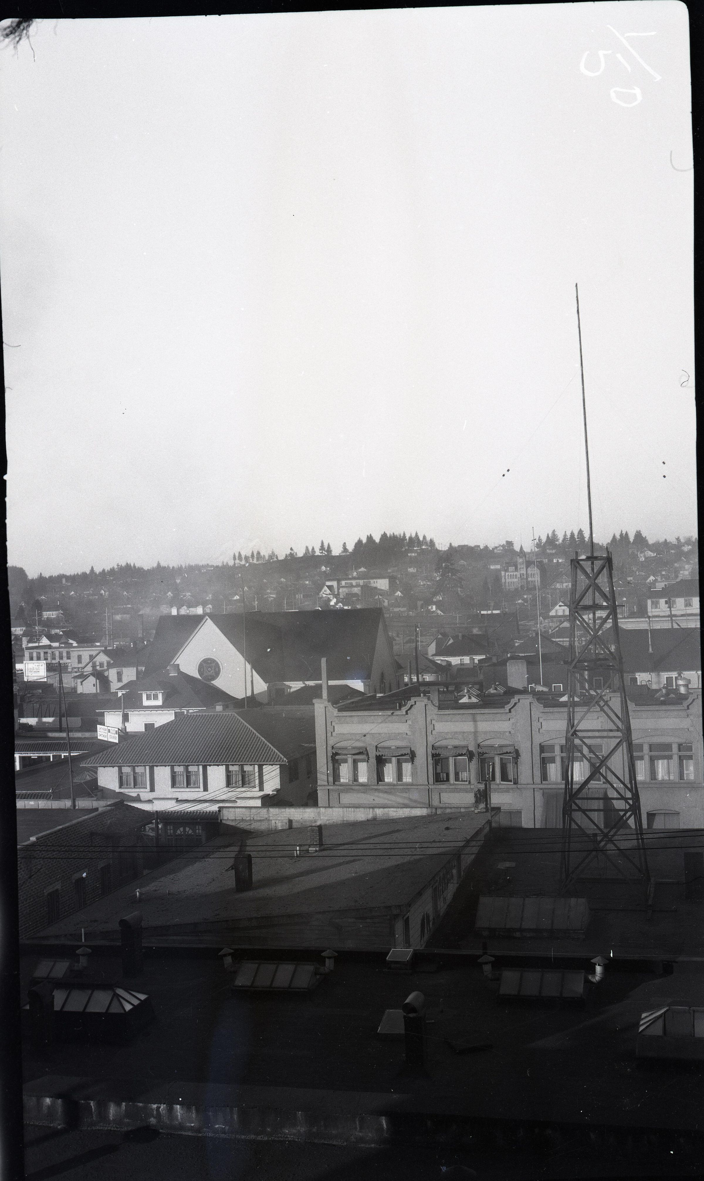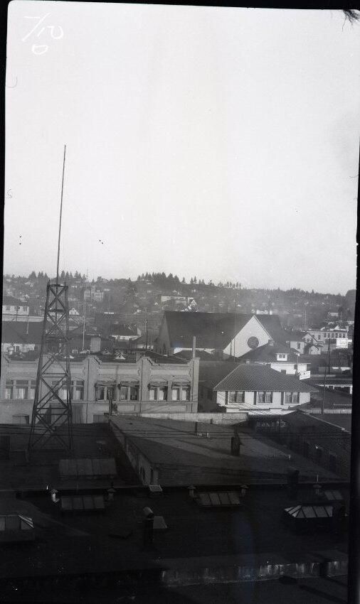 Black and white negative of a portion of downtown Olympia. The image was taken from a room in the Security Building. In the foreground is the roof of a business building. That portion of the negative is dark, but skylights, vents, and other objects are detectable. On the roof at left is a tower similar to an oil rig, with a pole extending further up. Beyond all that is the side of a building with windows and above it is a roof with various objects. Beside that building is a church with roof and windows below and roof and gables above. In the background are distant trees and houses. There is a white border on all sides, and in the bottom border is "#128" and "1929"