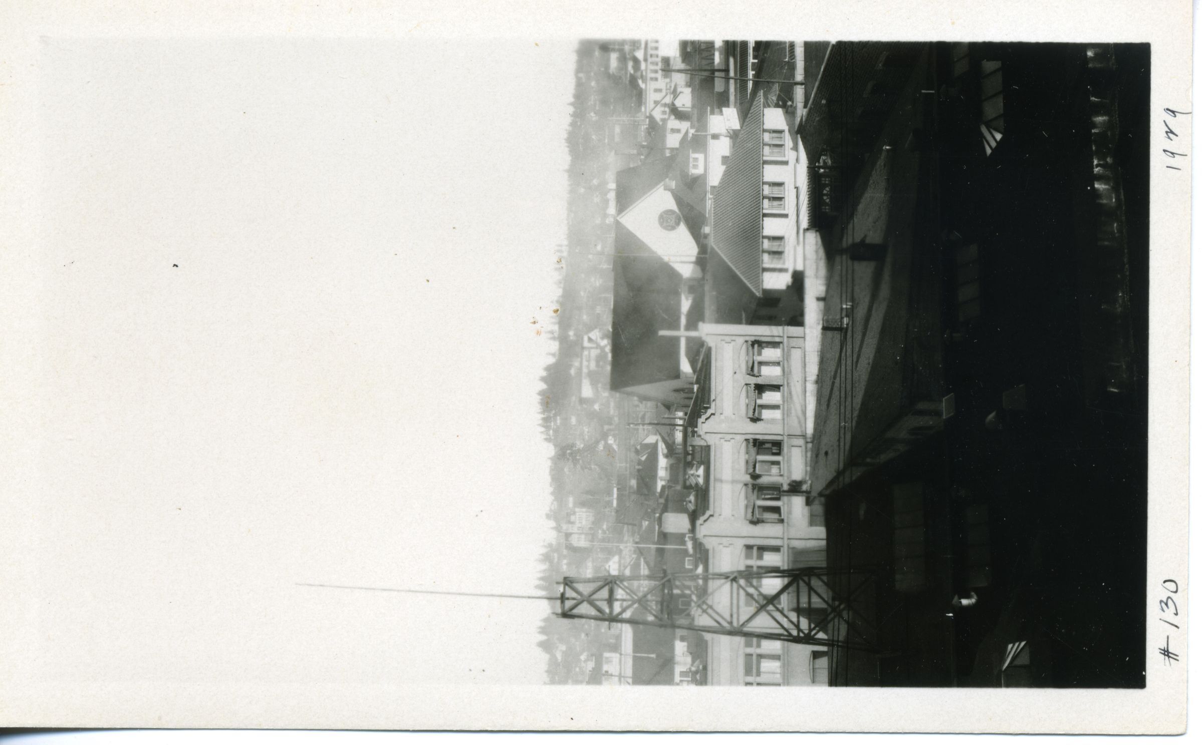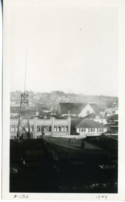 Black and white photo of a portion of downtown Olympia. The image was taken from a room in the Security Building. In the foreground is the roof of a business building. That portion of the print is dark, but skylights, vents, and other objects are detectable. On the roof at left is a tower similar to an oil rig, with a pole extending further up. Beyond all that is the side of a building with windows and above it is a roof with various objects. Beside that building is a church with roof and windows below and roof and gables above. In the background are distant trees and houses. There is a white border on all sides, and in the bottom border is "#130" and "1929". On the back is stamped "2537", and in pencil is "1/50".