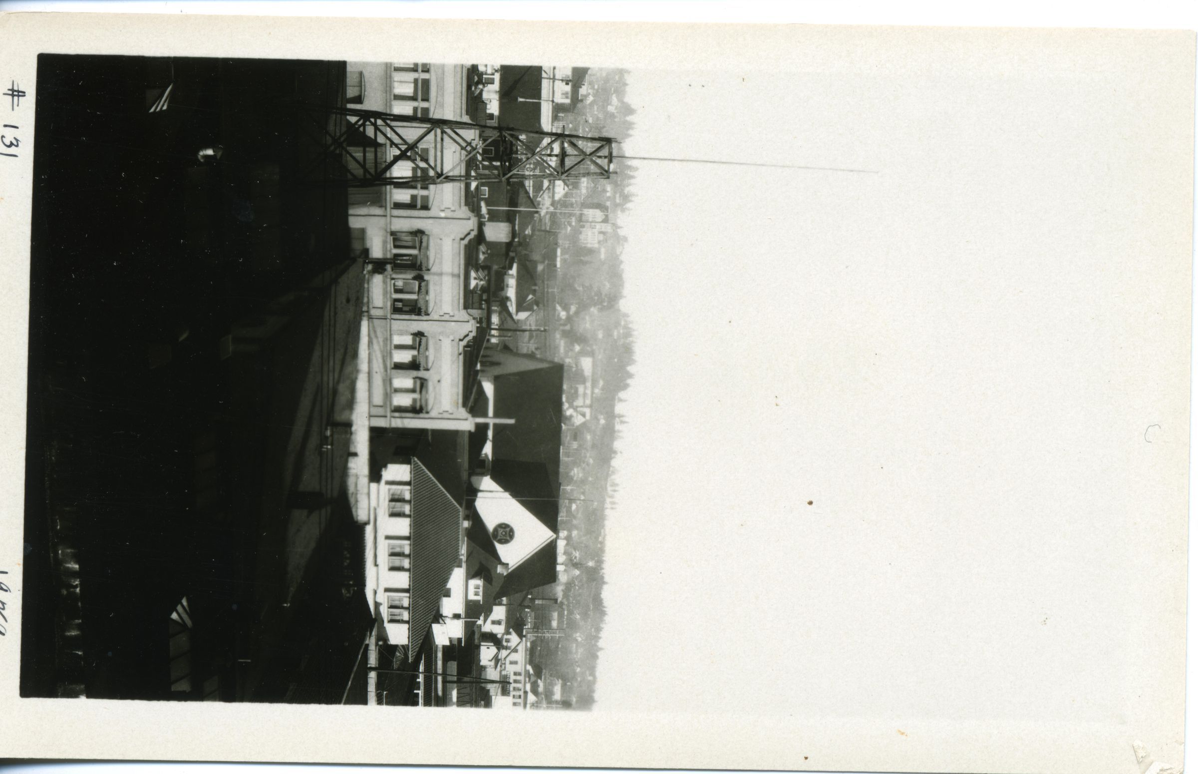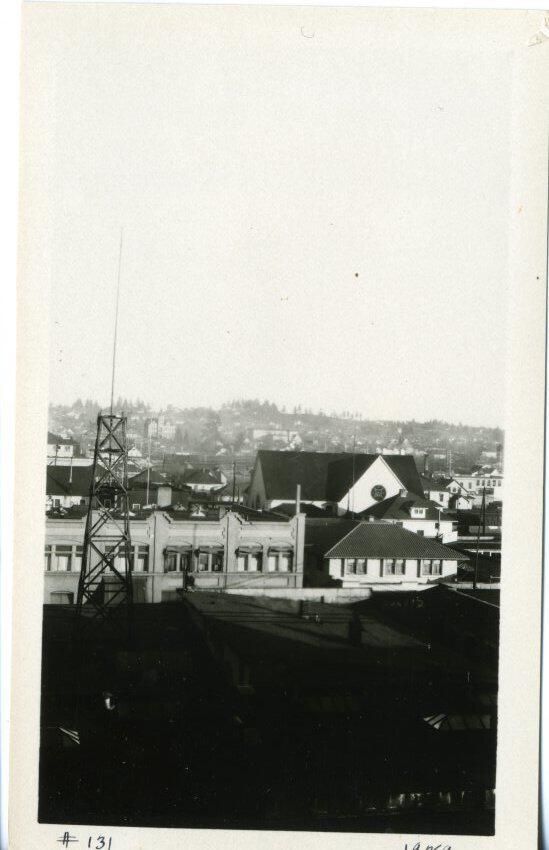 Black and white photo of a portion of downtown Olympia. The image was taken from a room in the Security Building. In the foreground is the roof of a business building. That portion of the print is dark, but skylights, vents, and other objects are detectable. On the roof at left is a tower similar to an oil rig, with a pole extending further up. Beyond all that is the side of a building with windows and above it is a roof with various objects. Beside that building is a church with roof and windows below and roof and gables above. In the background are distant trees and houses. There is a white border on all sides, and in the bottom border is "#131" and "1929". On the back is stamped "2537", and in pencil is "1/25".
